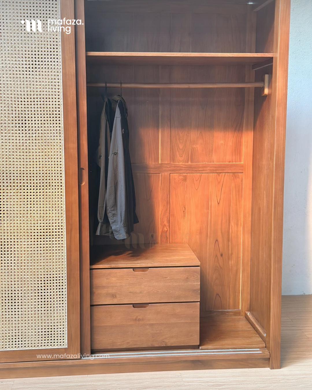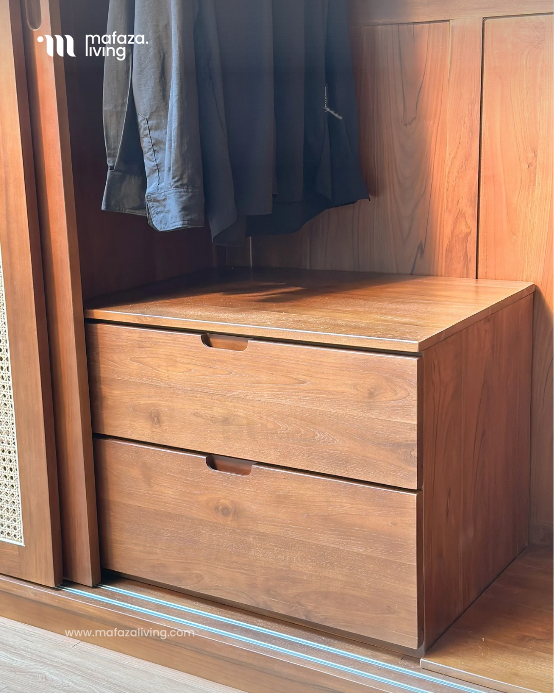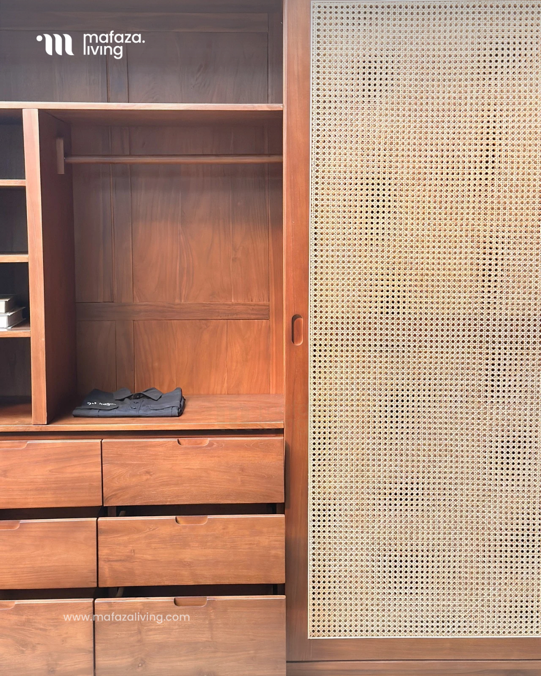 The Nova Wardrobe is where timeless craftsmanship meets modern functionality. Built from certified teak wood, this wardrobe showcases natural strength and elegance, while the handwoven rattan sliding doors add an airy charm that blends seamlessly with contemporary interiors. Inside, generous shelves and multiple drawers provide smart organization for clothing, accessories, and essentials, making daily routines effortless. Designed for both beauty and practicality, Nova transforms any bedroom into a refined sanctuary of order and style.