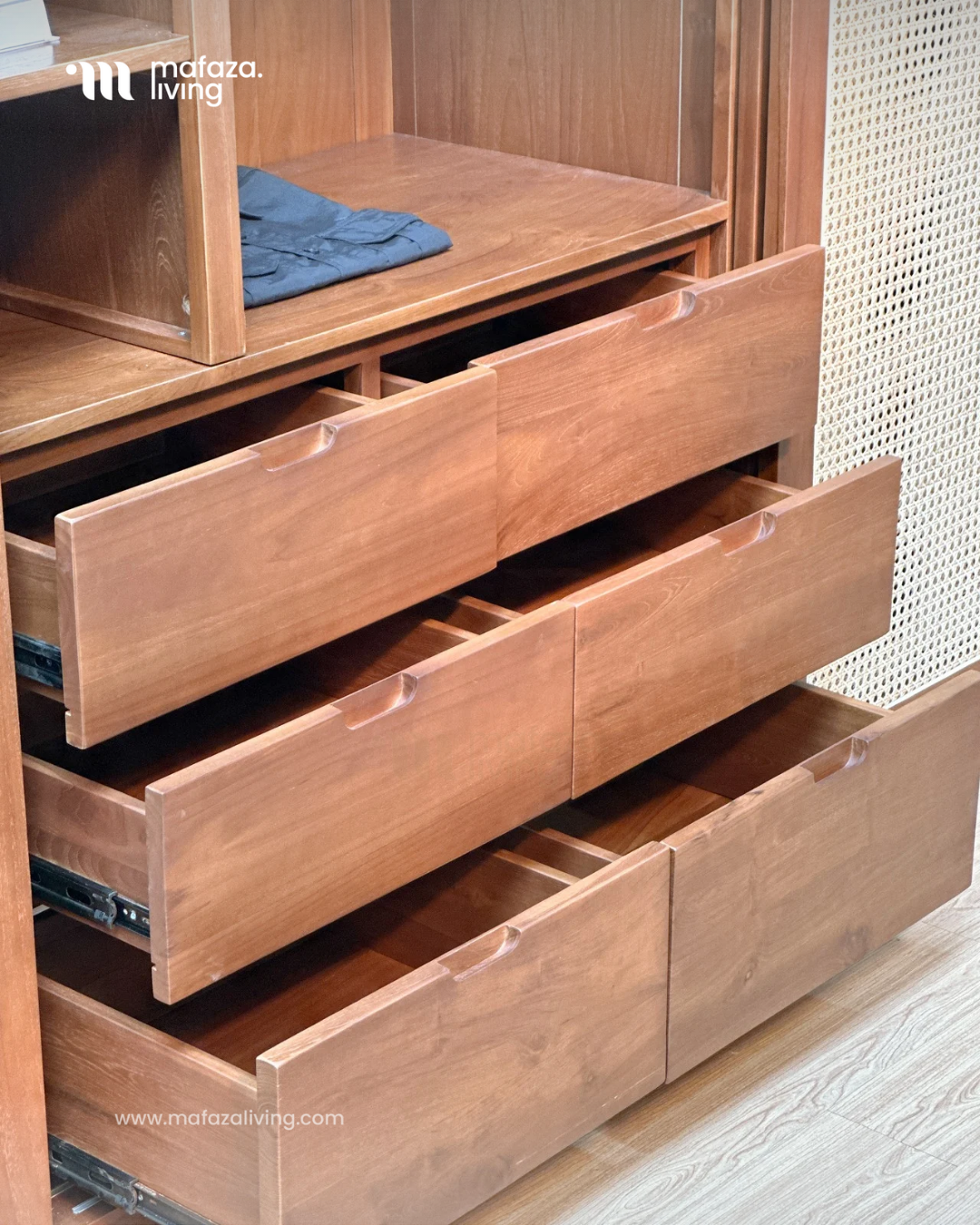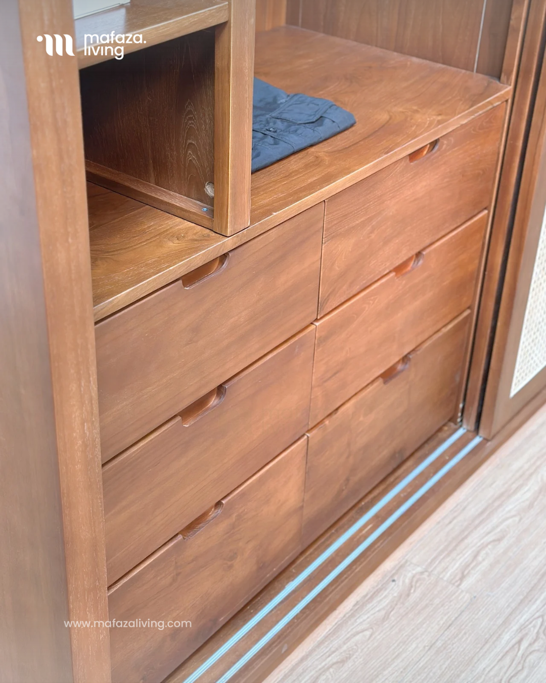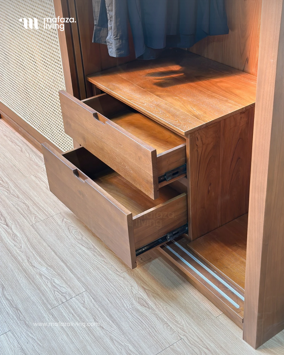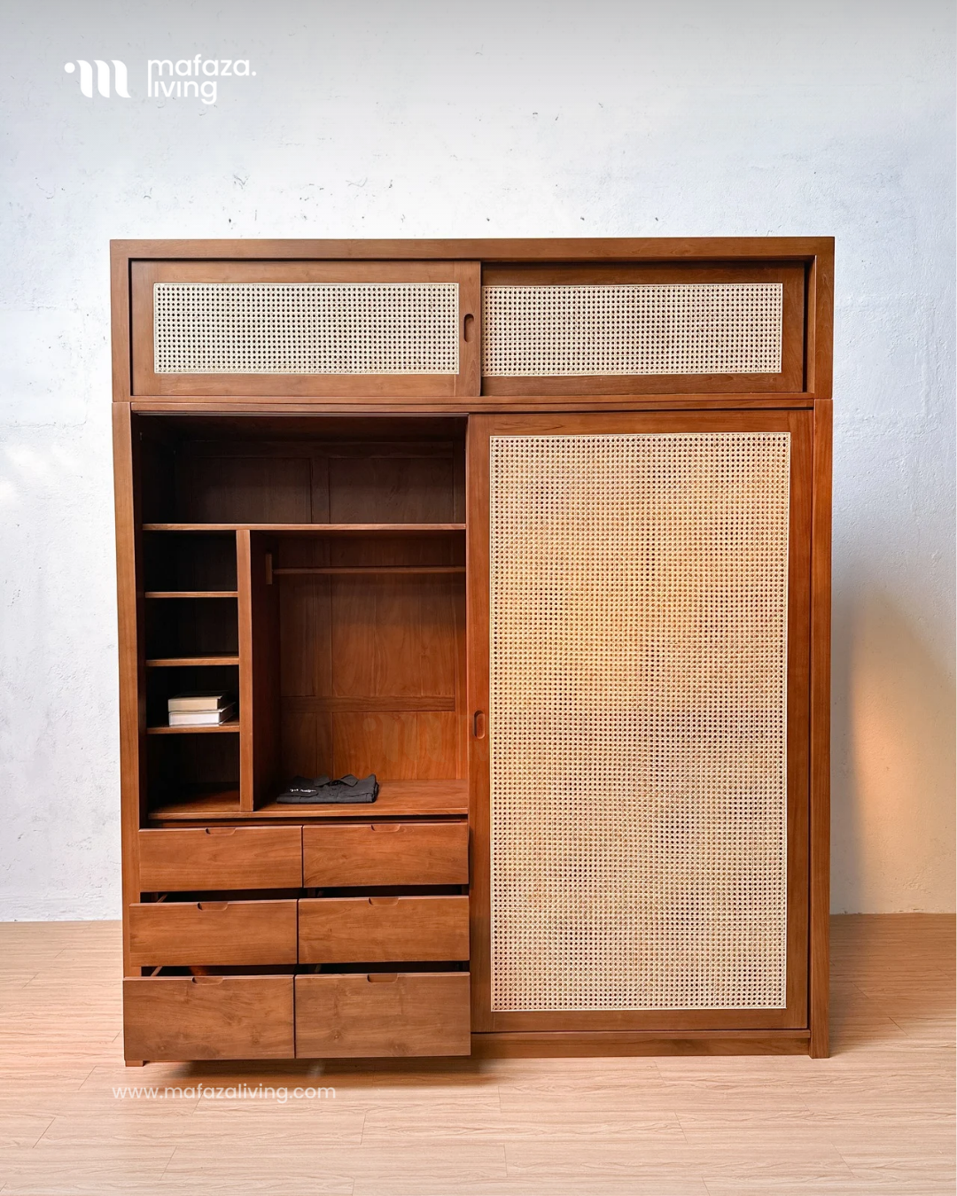 The Nova Wardrobe is where timeless craftsmanship meets modern functionality. Built from certified teak wood, this wardrobe showcases natural strength and elegance, while the handwoven rattan sliding doors add an airy charm that blends seamlessly with contemporary interiors. Inside, generous shelves and multiple drawers provide smart organization for clothing, accessories, and essentials, making daily routines effortless. Designed for both beauty and practicality, Nova transforms any bedroom into a refined sanctuary of order and style.