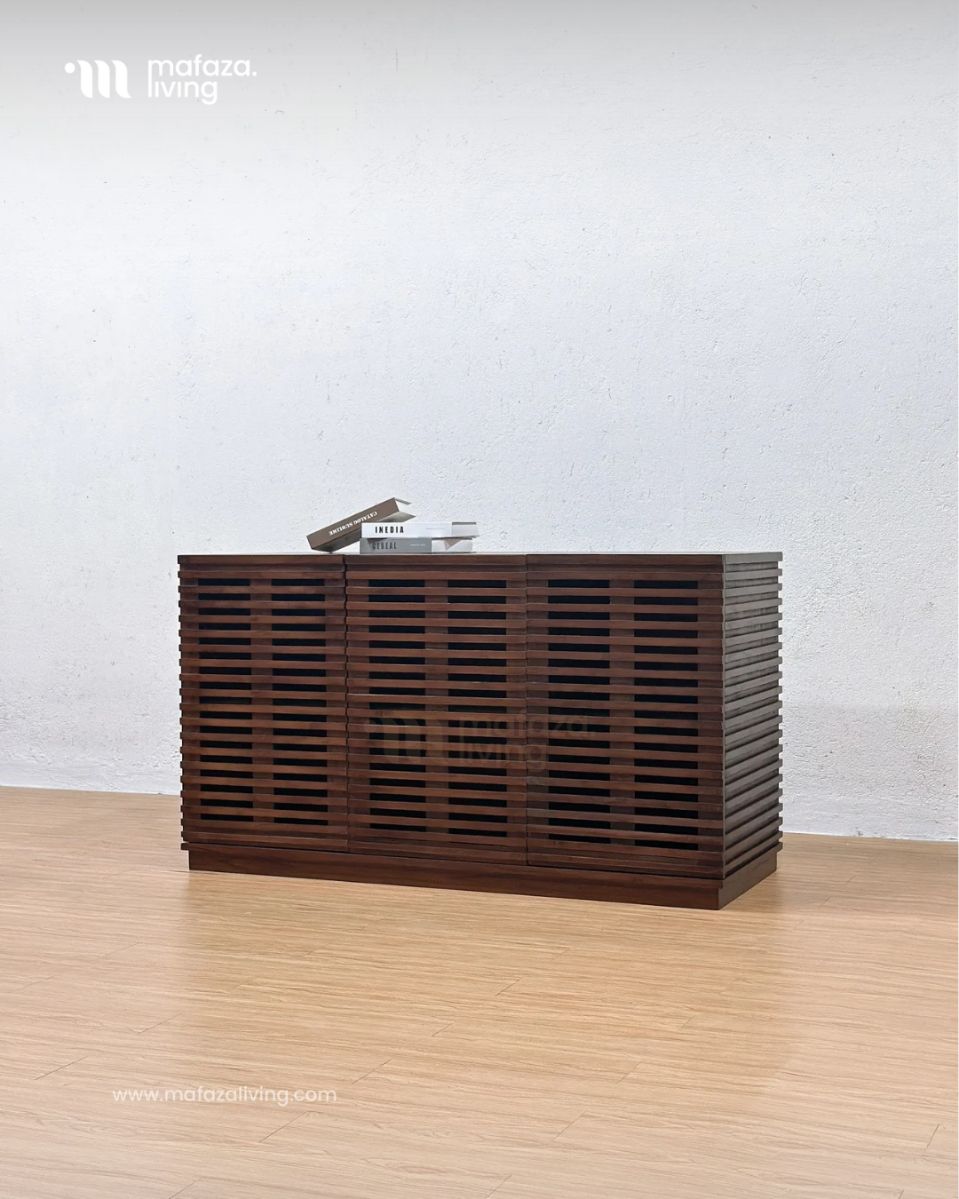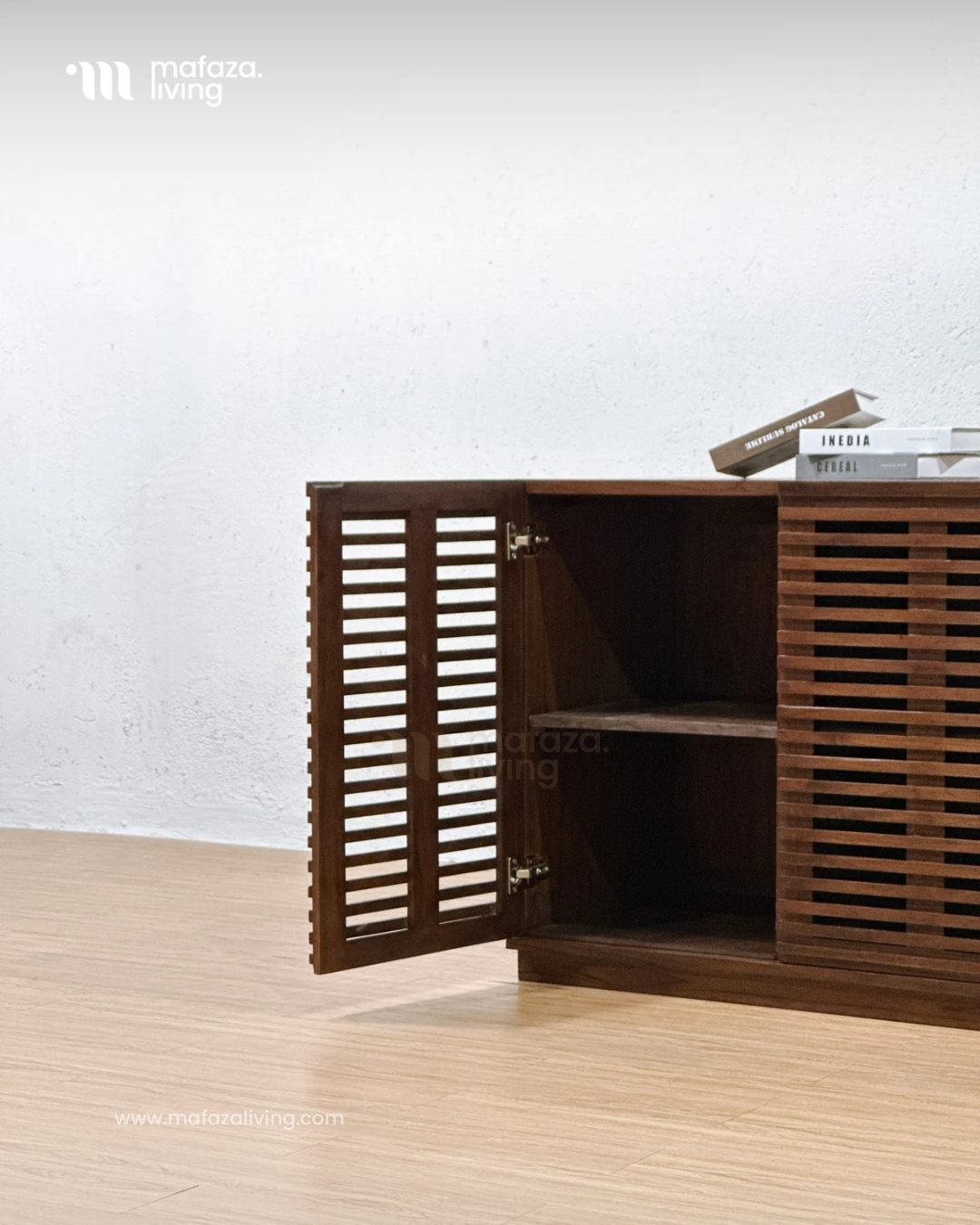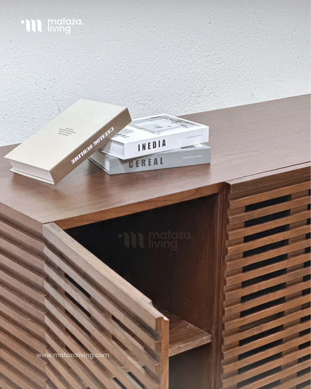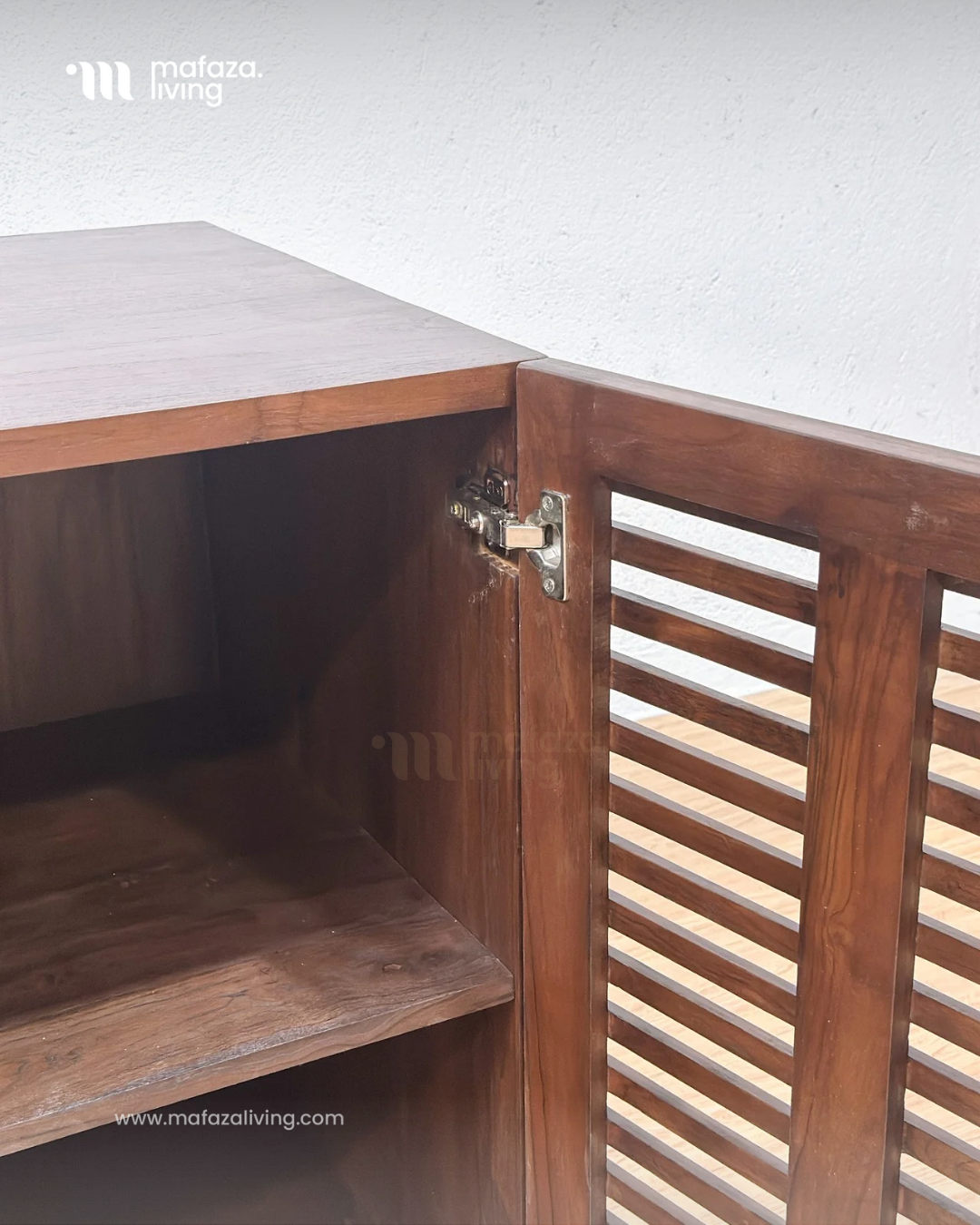Crafted for those who value both elegance and practicality, the Slate Sideboard is a timeless addition to any modern home. Made from certified teak wood, it features three doors with slatted detailing that open to reveal six spacious shelves, perfect for organizing tableware, books, or daily essentials. Its rich tone and clean design bring warmth and sophistication to your living or dining space. More than just storage, the Slate Sideboard becomes a statement piece that balances functionality with refined craftsmanship, making it an enduring centerpiece for everyday living.
