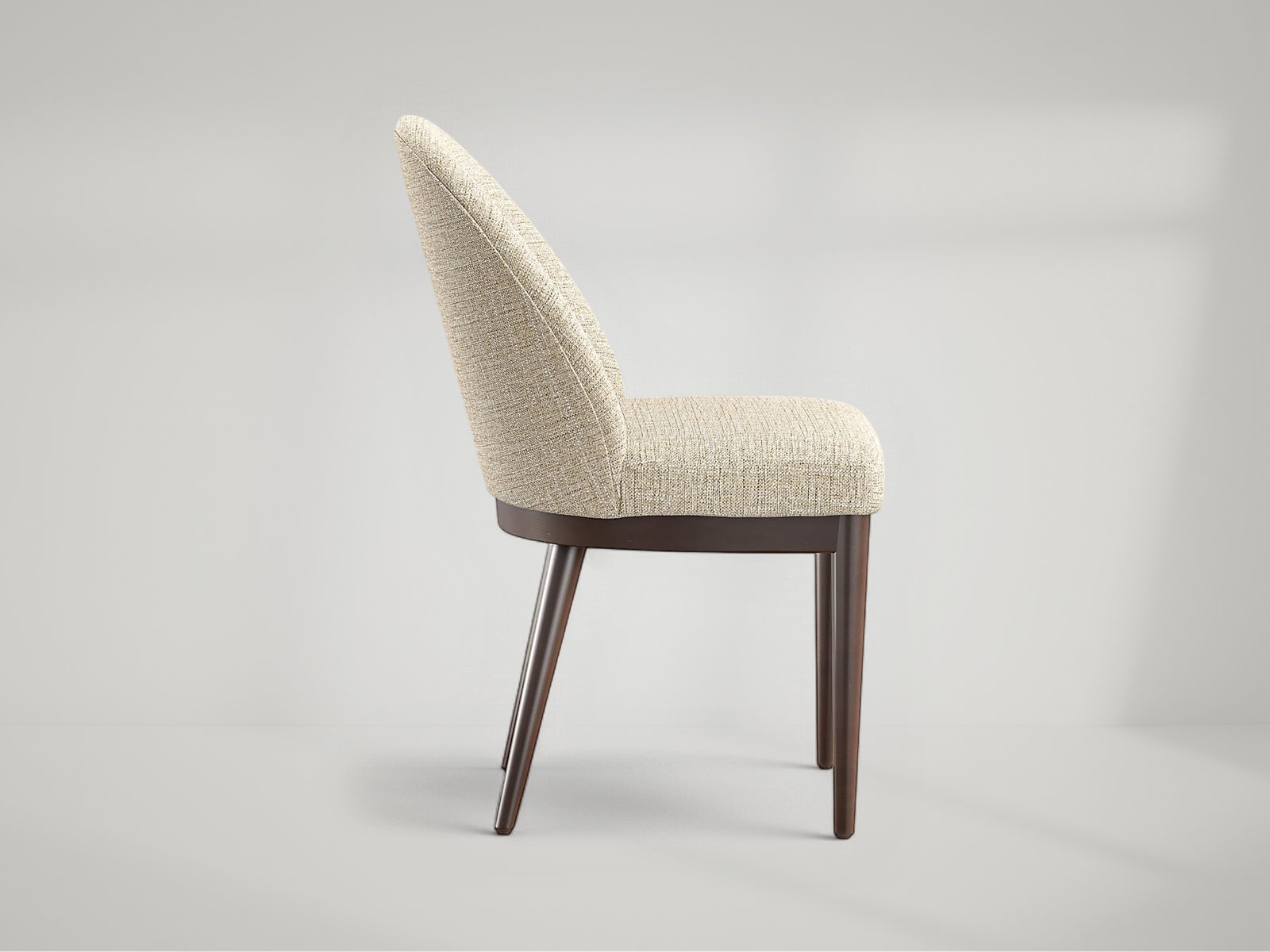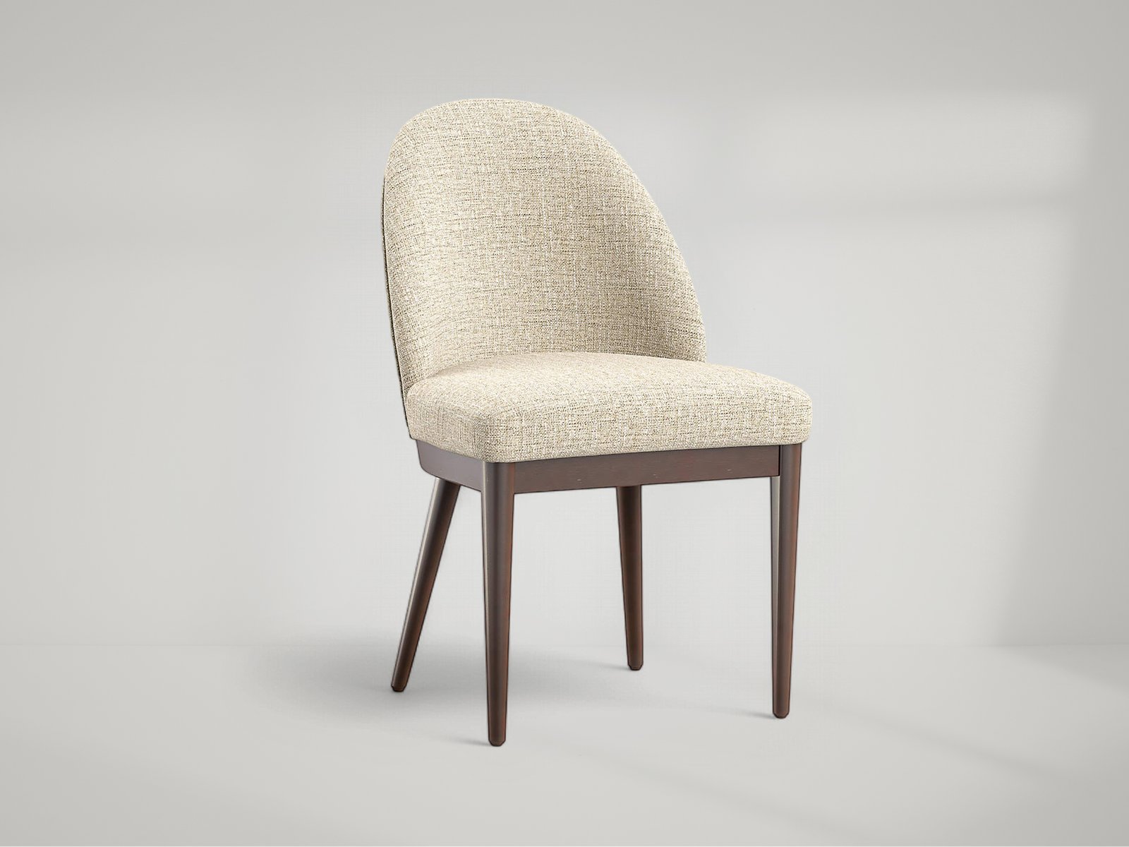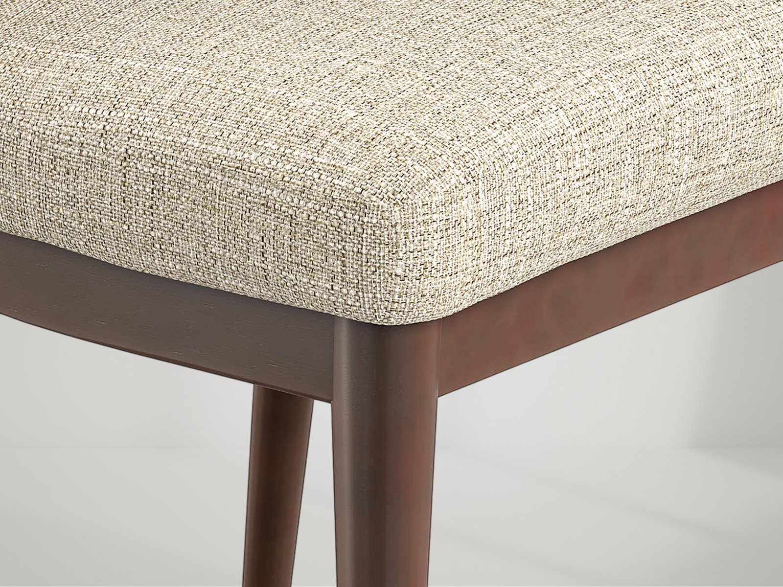Ana's cutaway curves and generously cushioned seat gives you room to relax. Neatly upholstered in a softly textured ivory performance fabric, the tight seat and back cushions are supported by slim, turned legs finished in espresso brown. Suitable to a wide range of dining room decor.