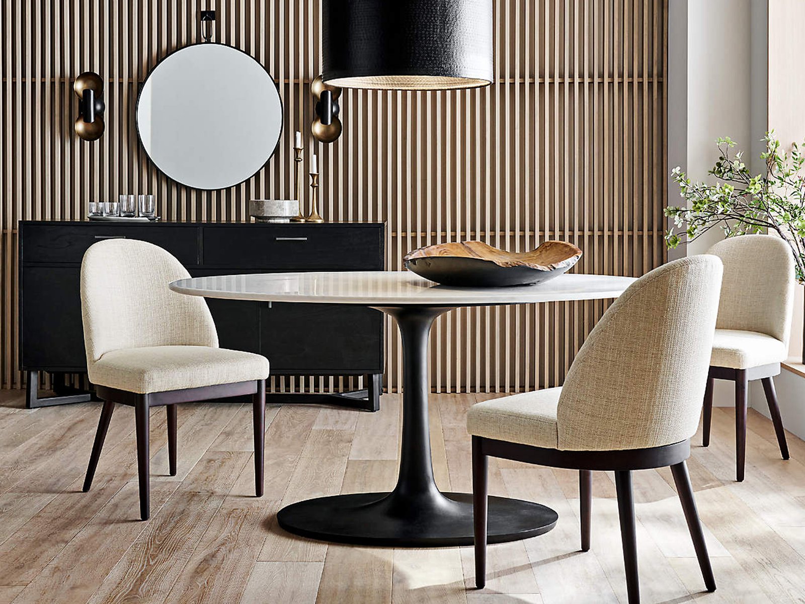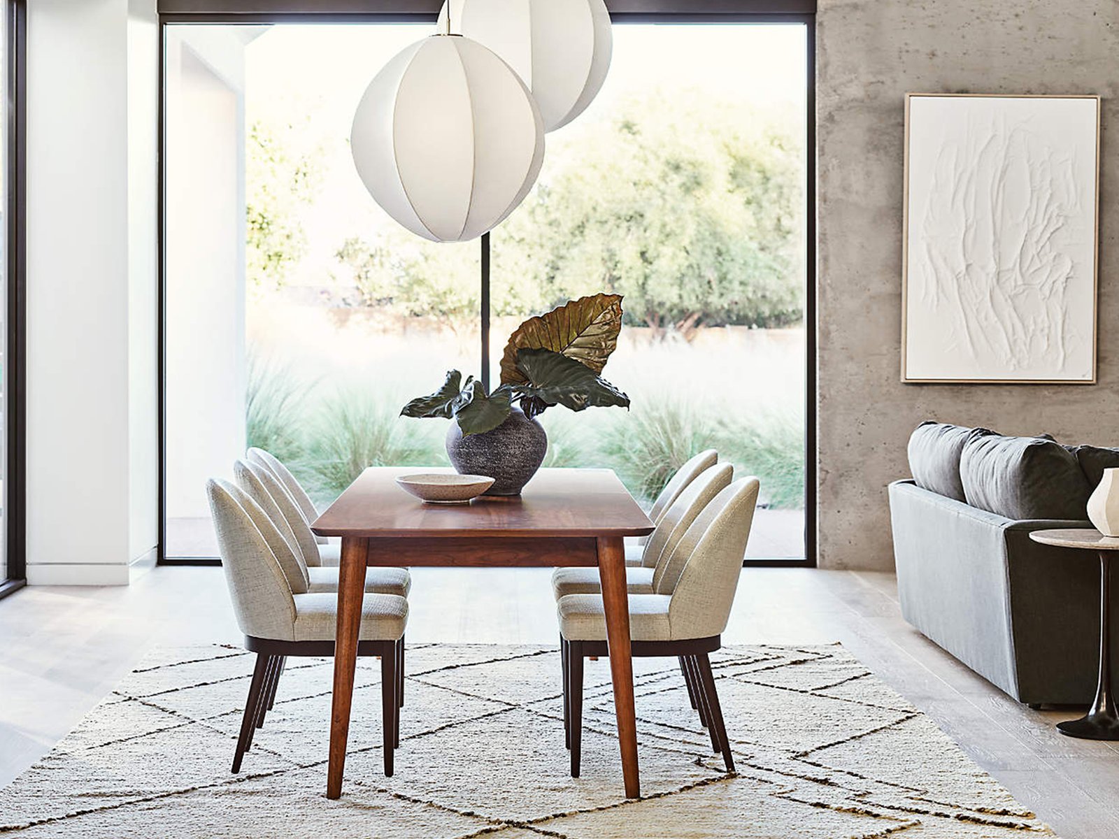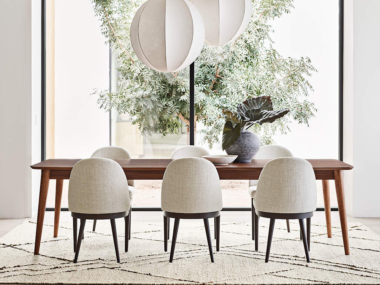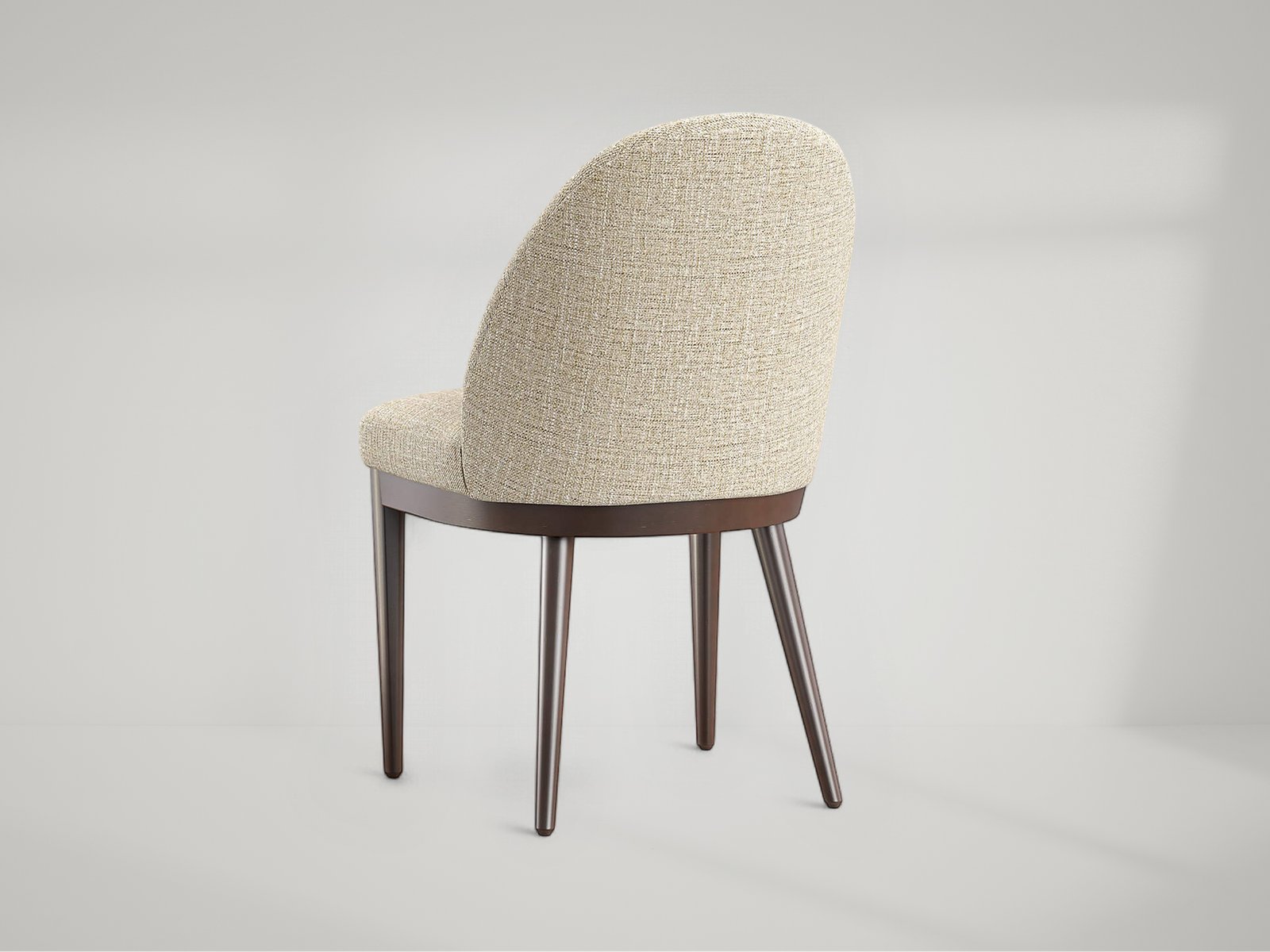 Ana's cutaway curves and generously cushioned seat gives you room to relax. Neatly upholstered in a softly textured ivory performance fabric, the tight seat and back cushions are supported by slim, turned legs finished in espresso brown. Suitable to a wide range of dining room decor.