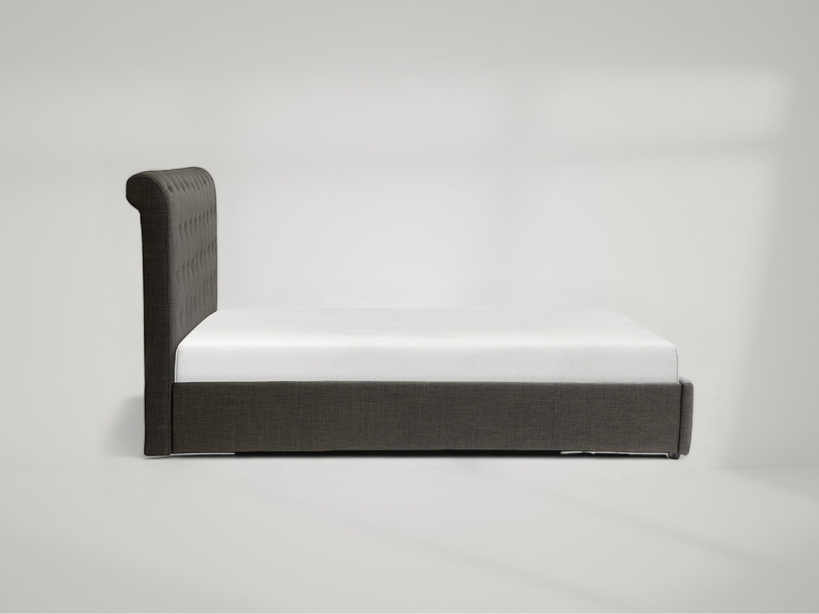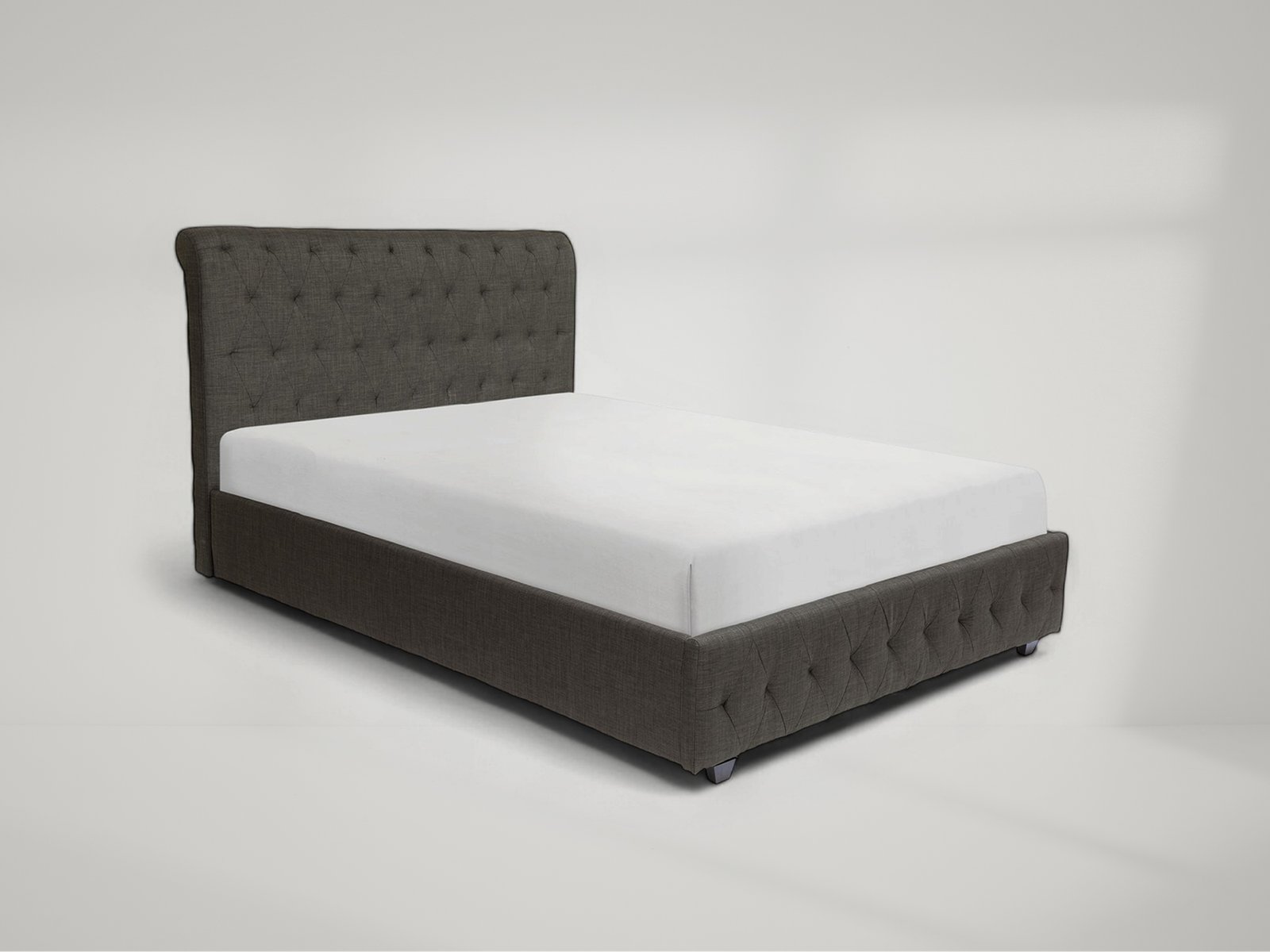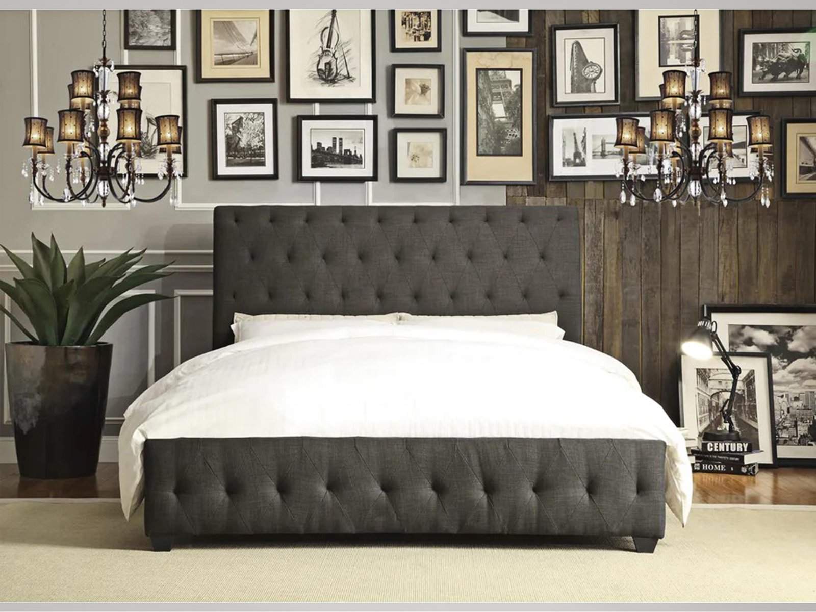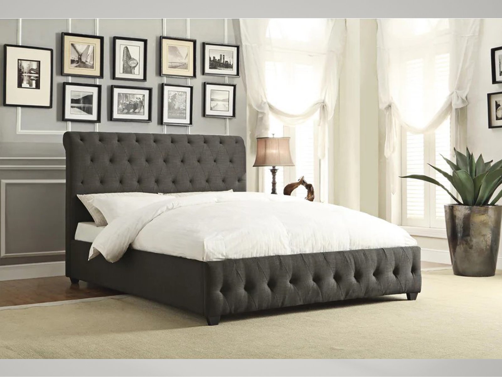 A rolled and tufted headboard provides elegant touches to the casual Baldwyn Collection. Offered in dark gray fabric, this bed frame offers not only flexible placement, but the opportunity to style the room to fit your needs.