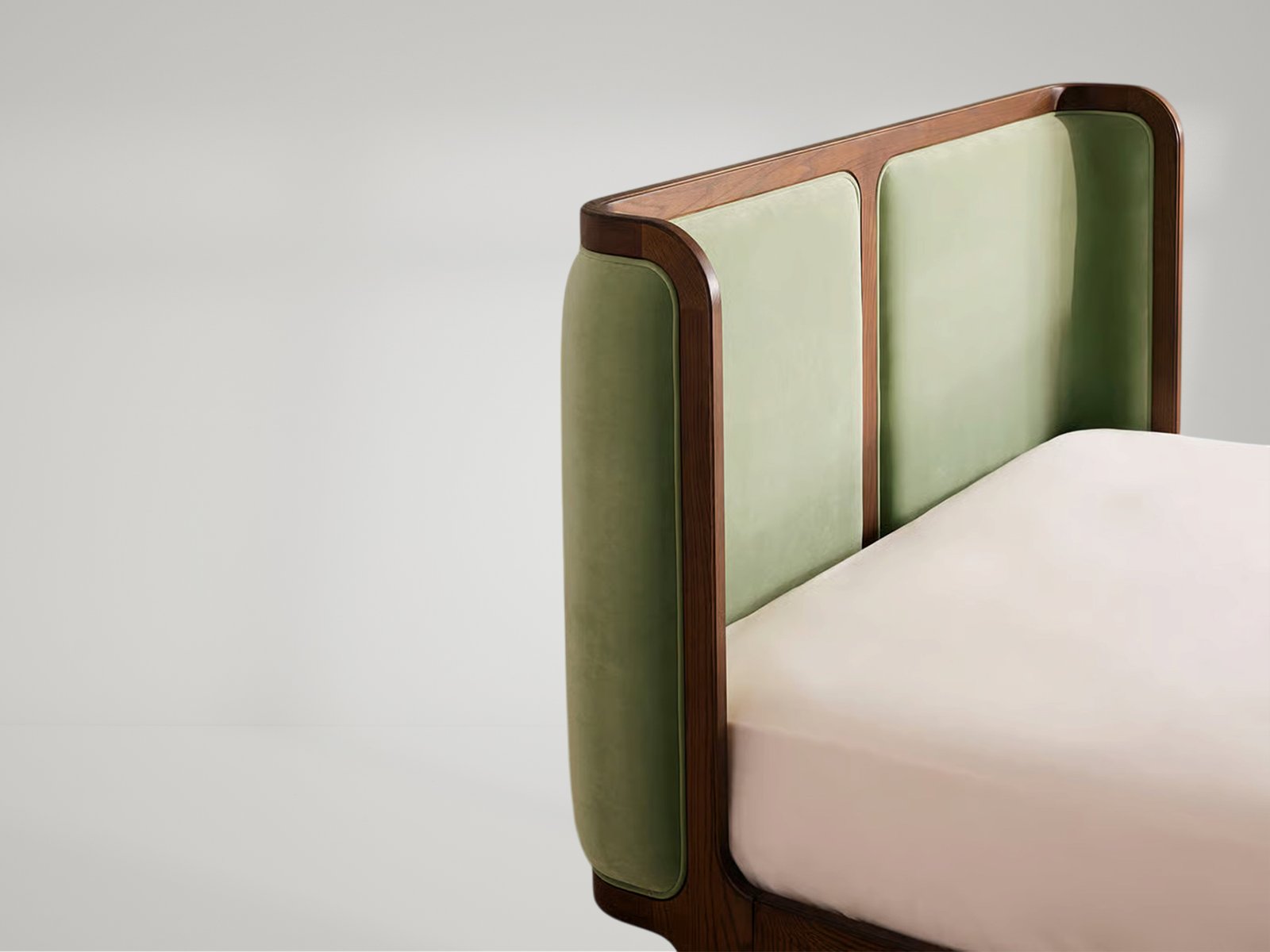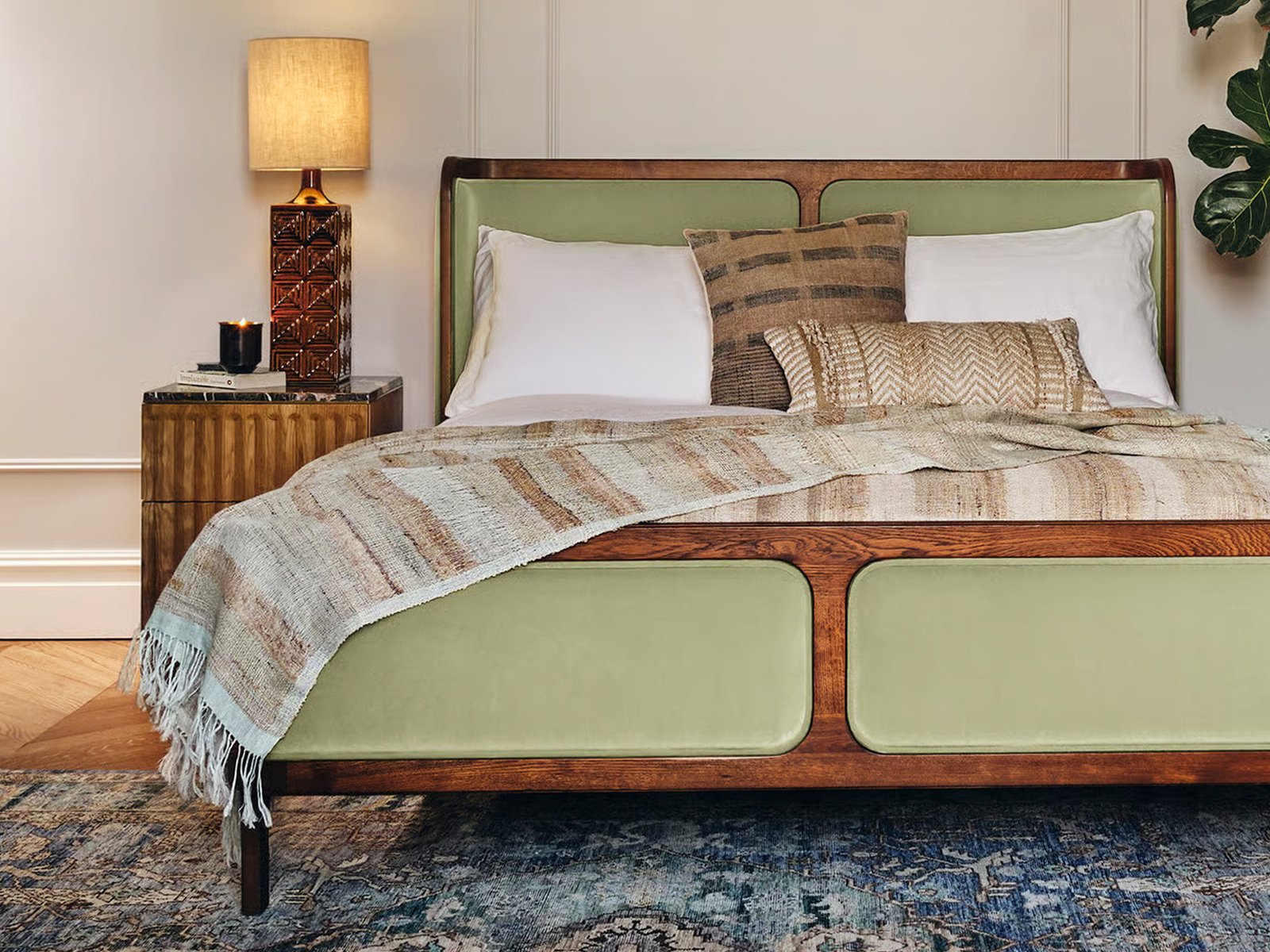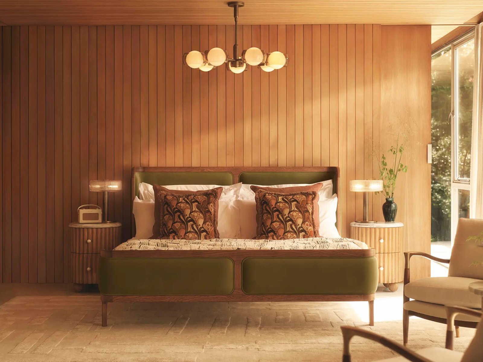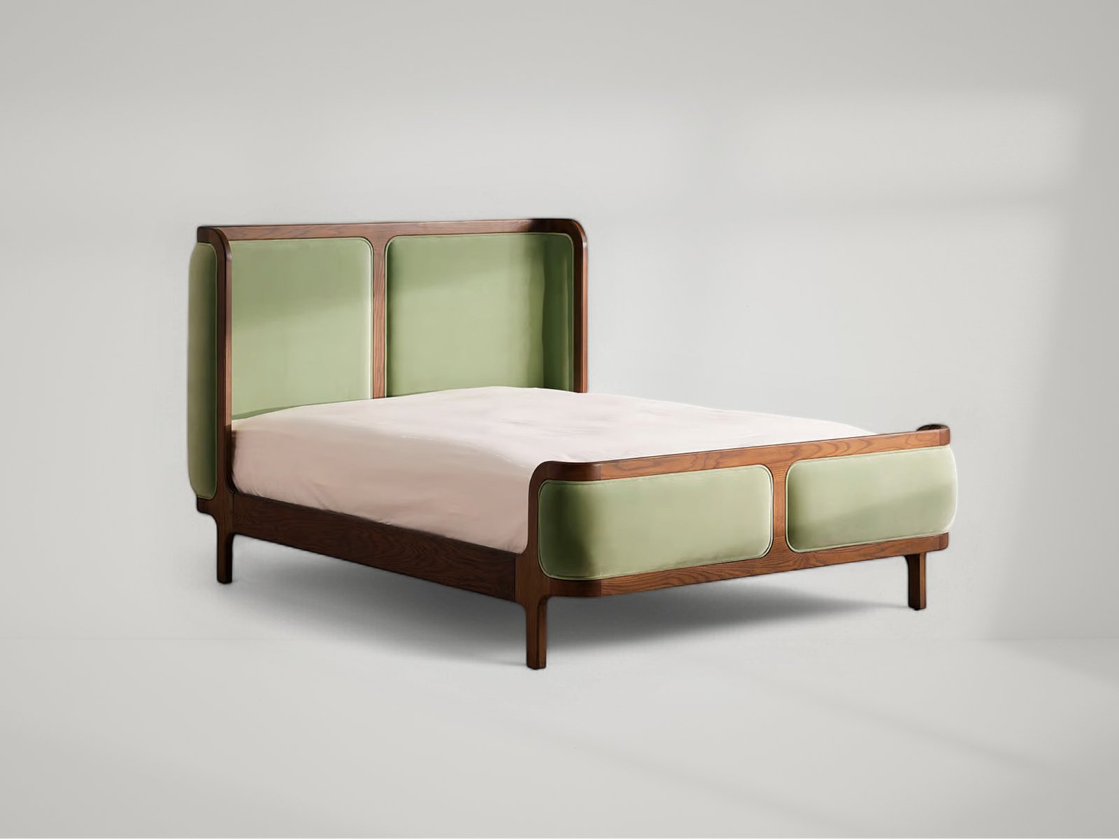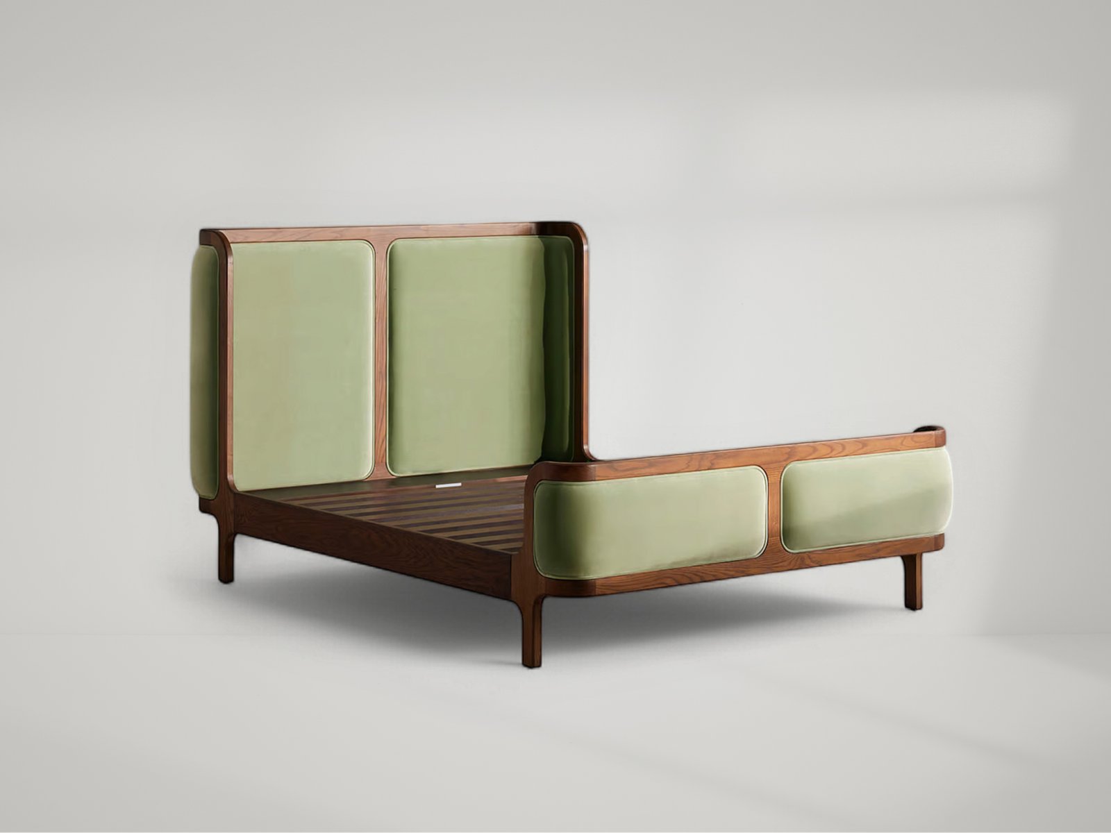 With its sleek curves and solid teak frame, Belsa takes design cues from the mid-century style beds at White City House. The velvet-upholstered headboard and footboard wrap around the mattress, creating an enveloping feel for the sleeper.