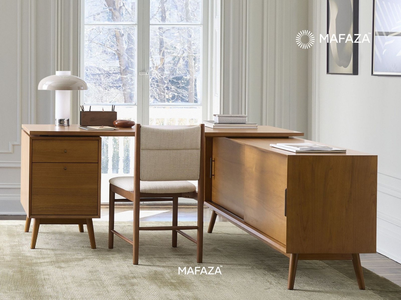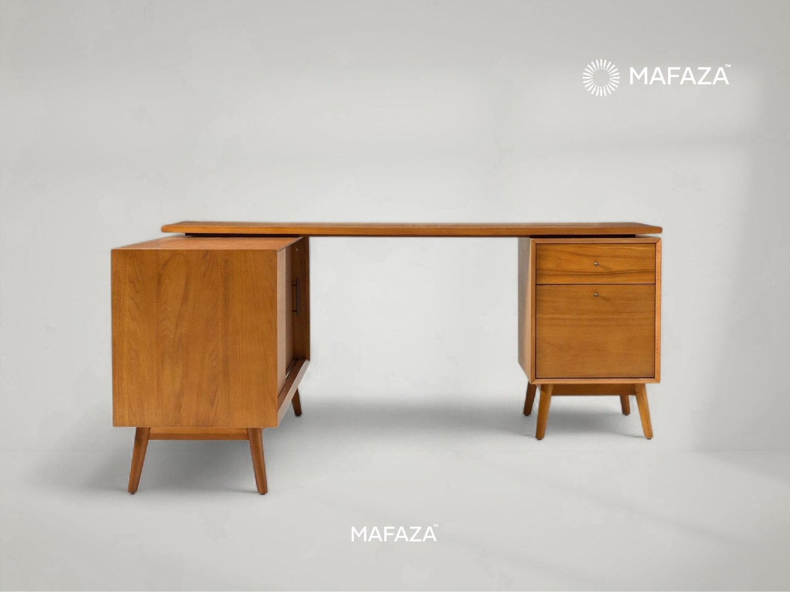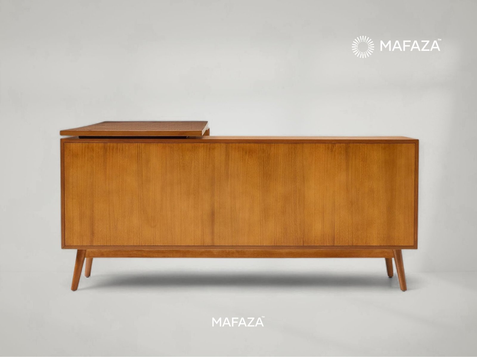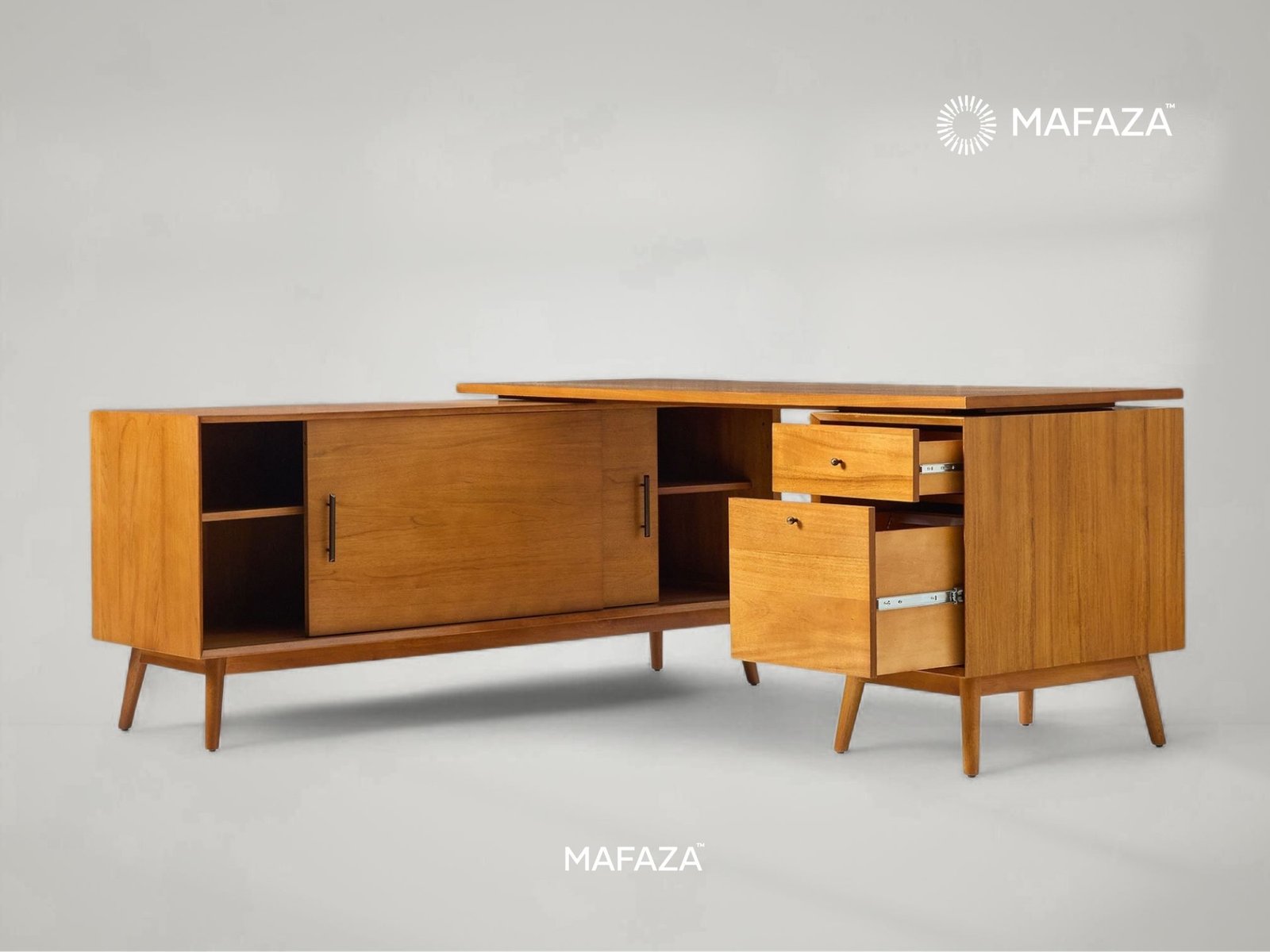 The Dallen Modular L-Shaped Desk, designed for adaptability, combines two drawers, sliding-door cabinets, and a bookcase into a unified workstation. Constructed from certified teak wood, it is the focal point of an office that is both aesthetically pleasing and functional.