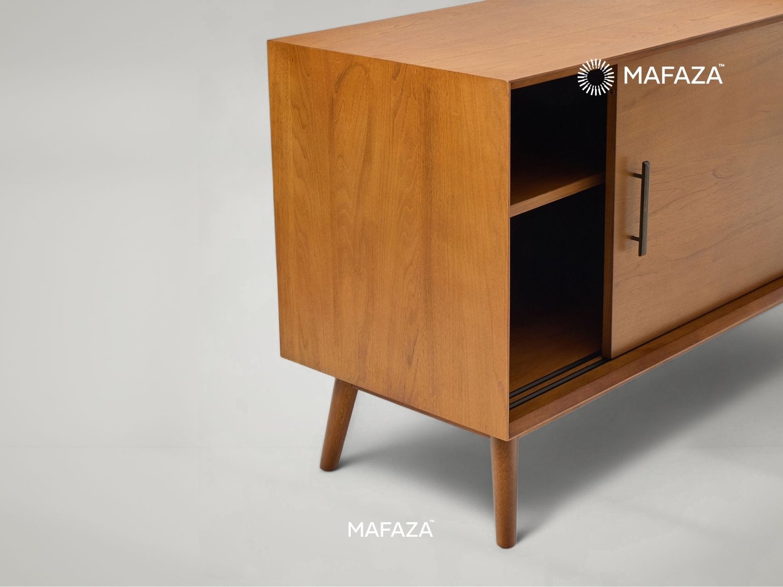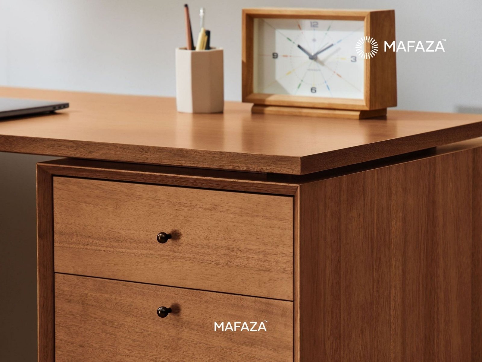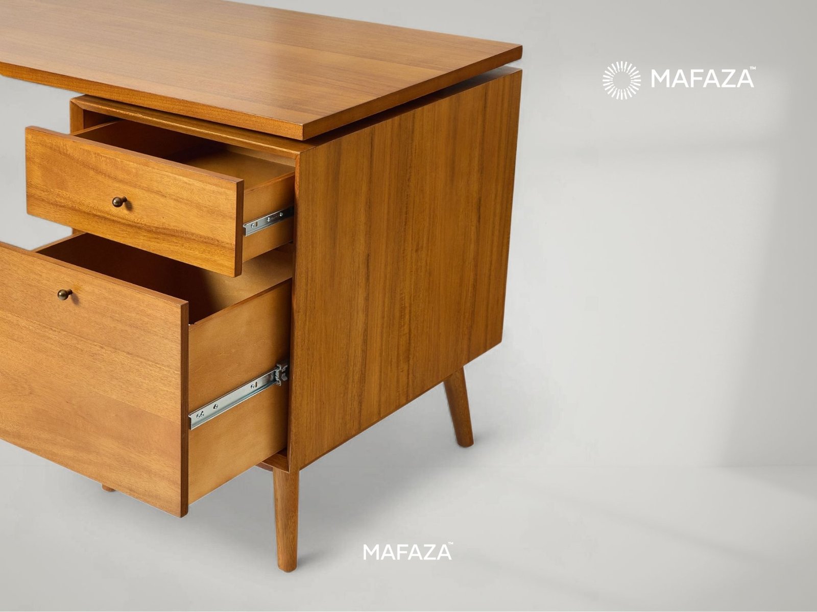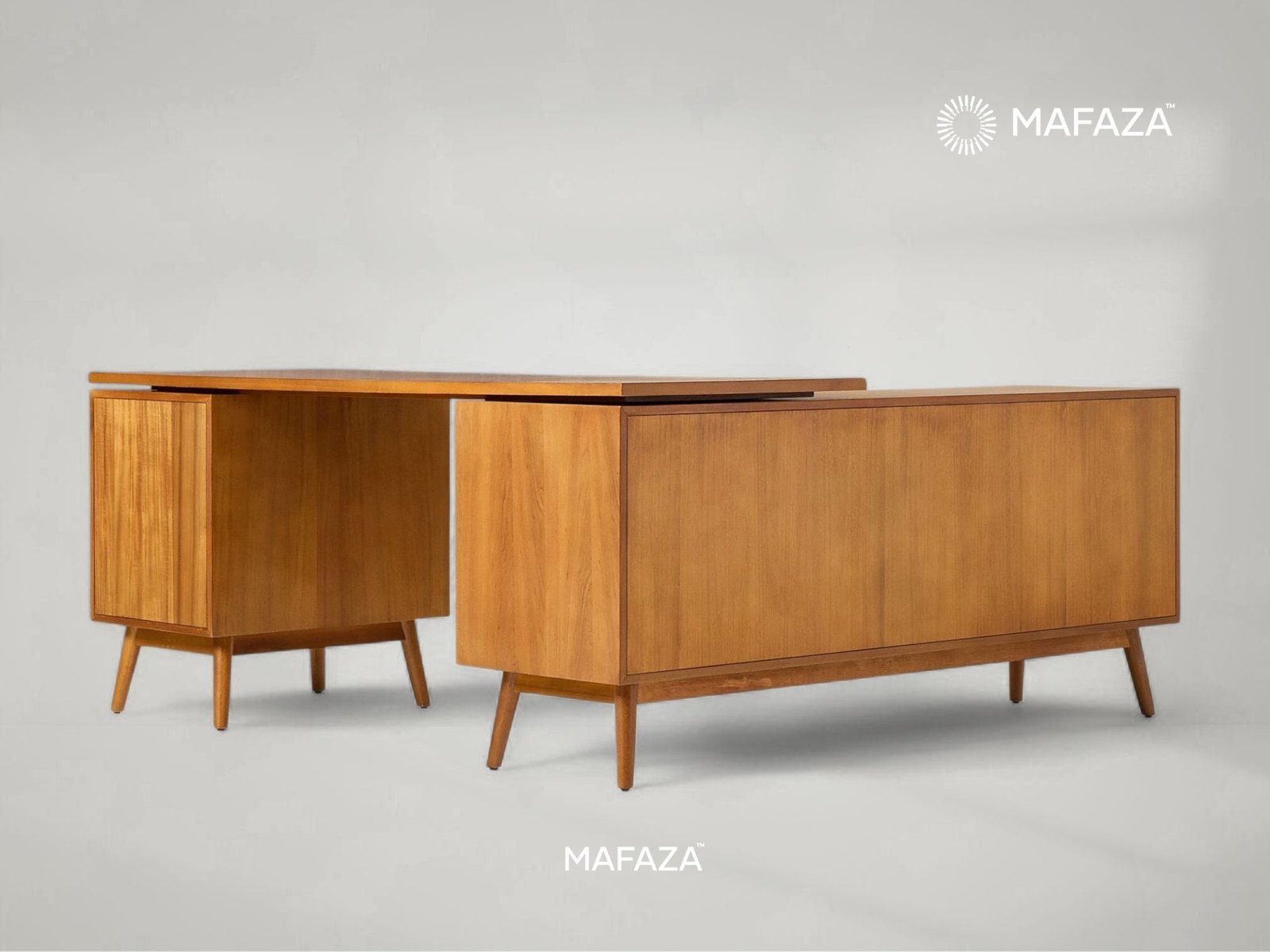 The Dallen Modular L-Shaped Desk, designed for adaptability, combines two drawers, sliding-door cabinets, and a bookcase into a unified workstation. Constructed from certified teak wood, it is the focal point of an office that is both aesthetically pleasing and functional.