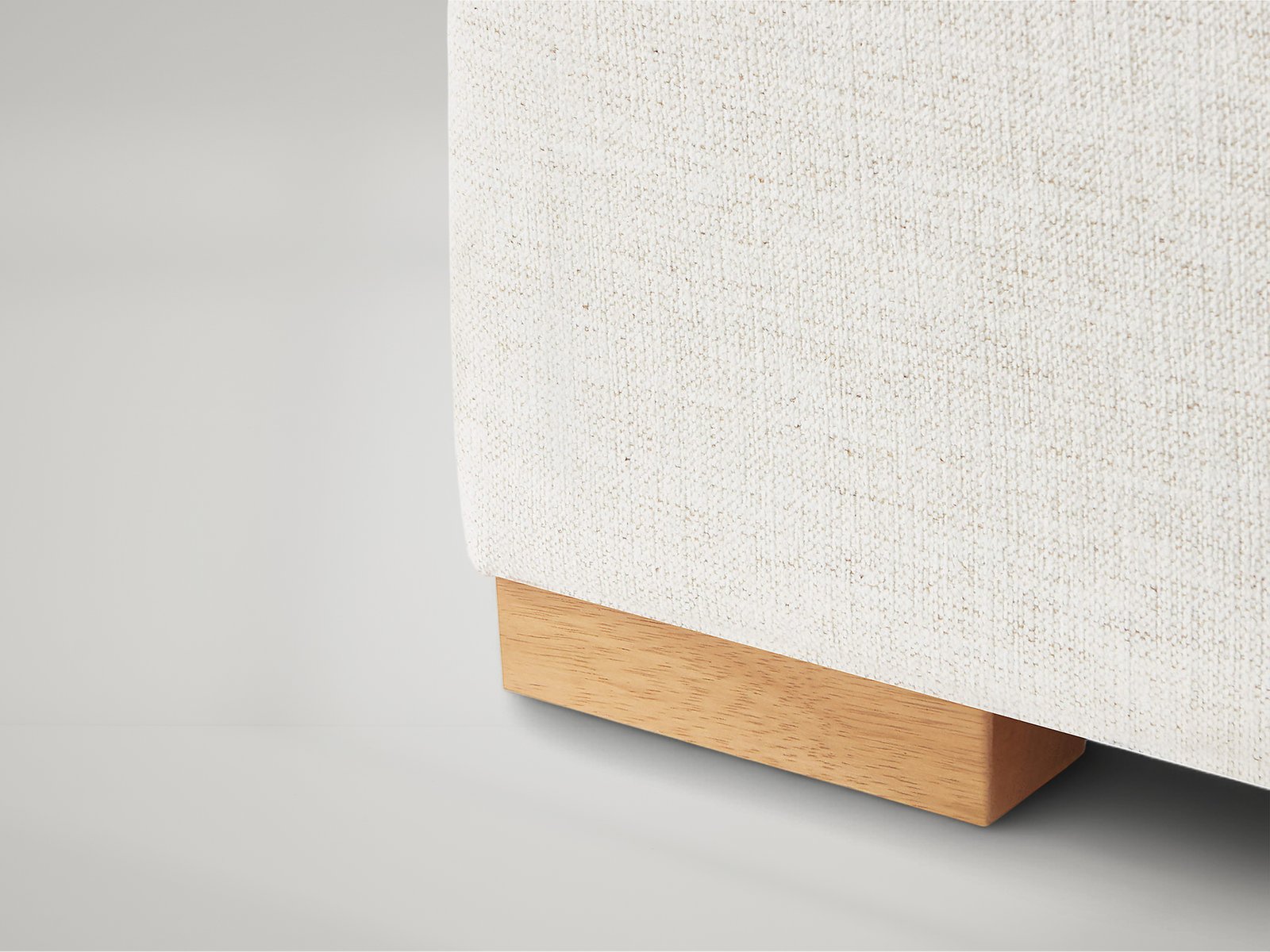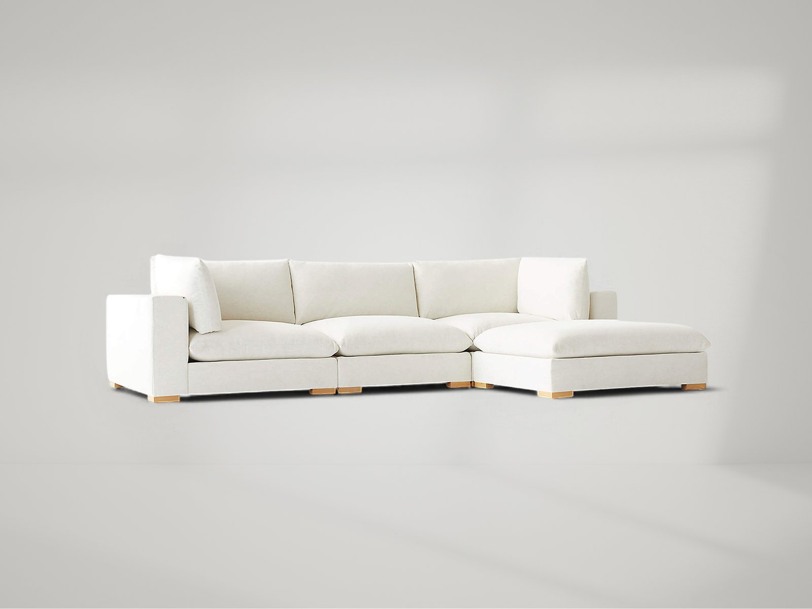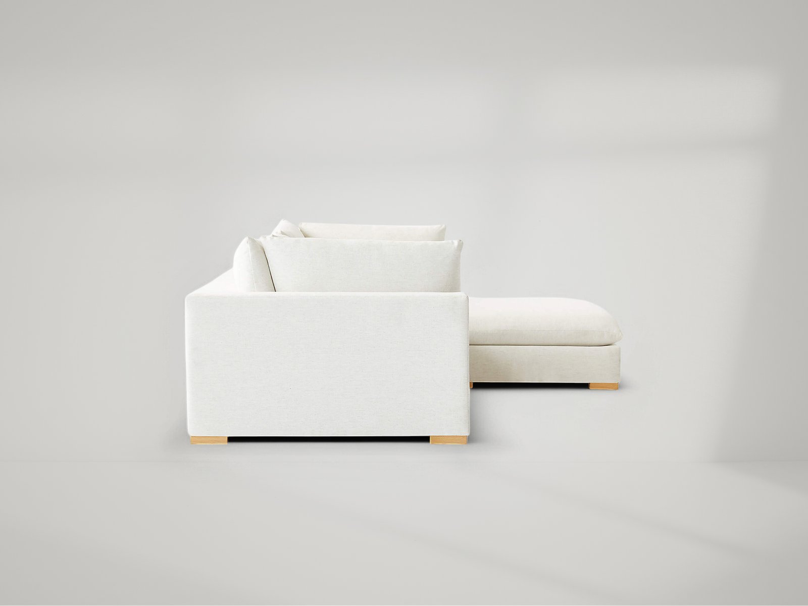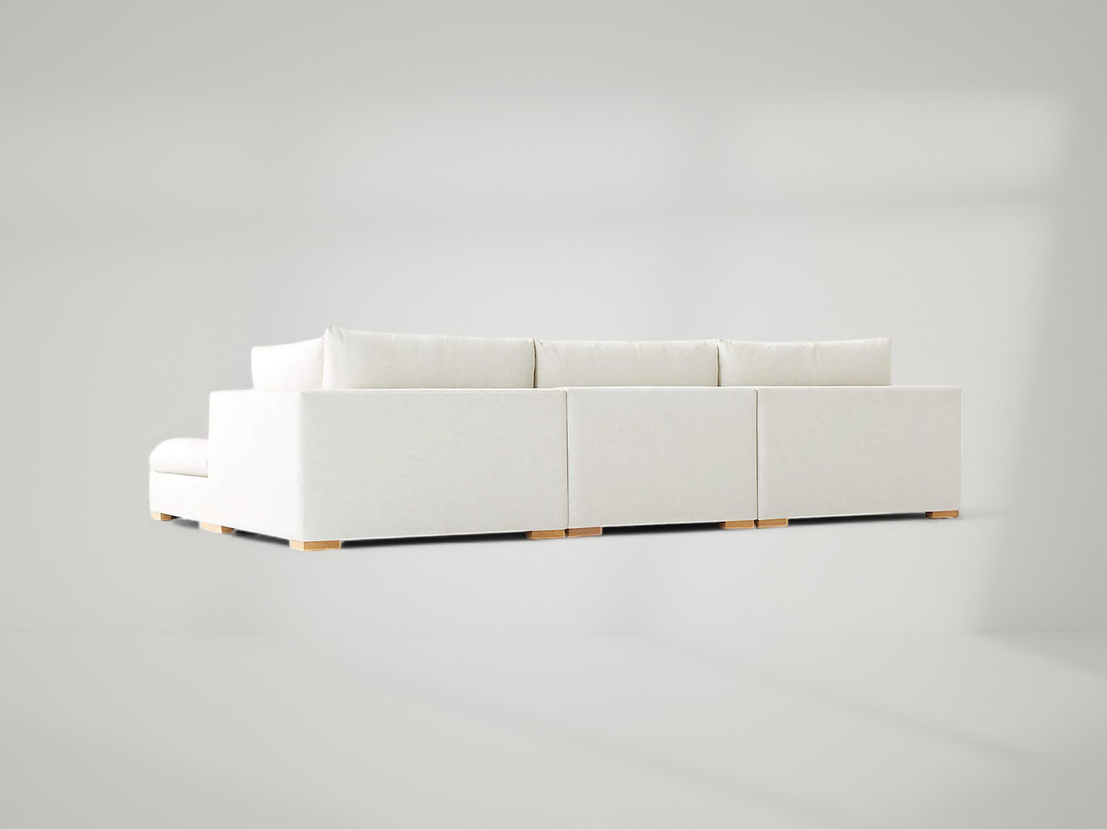 Upholstered in a snow white performance fabric, large-scale sectional sits low to the ground for modern appeal. The plush silhouette features pillow-like detached cushions with broad armrests that can serve as a relaxed perch for socializing. Sectional pieces can be configured to suit your space.