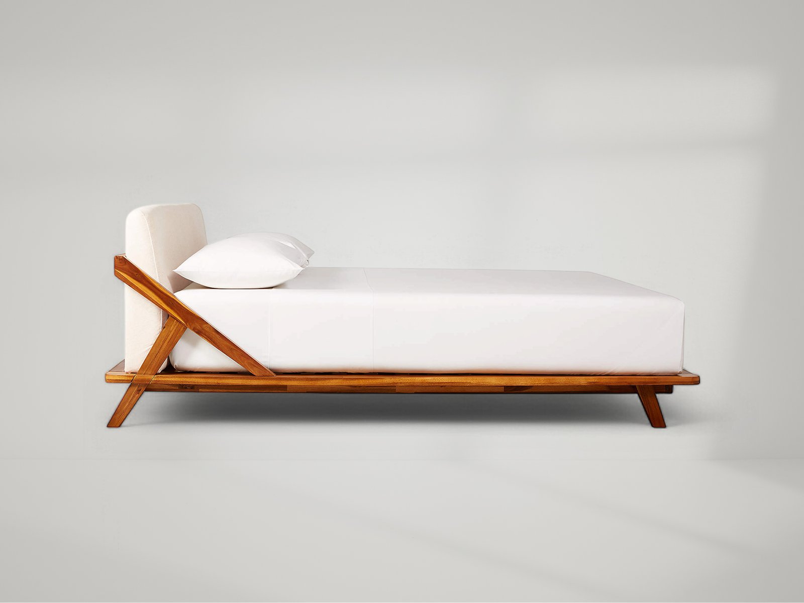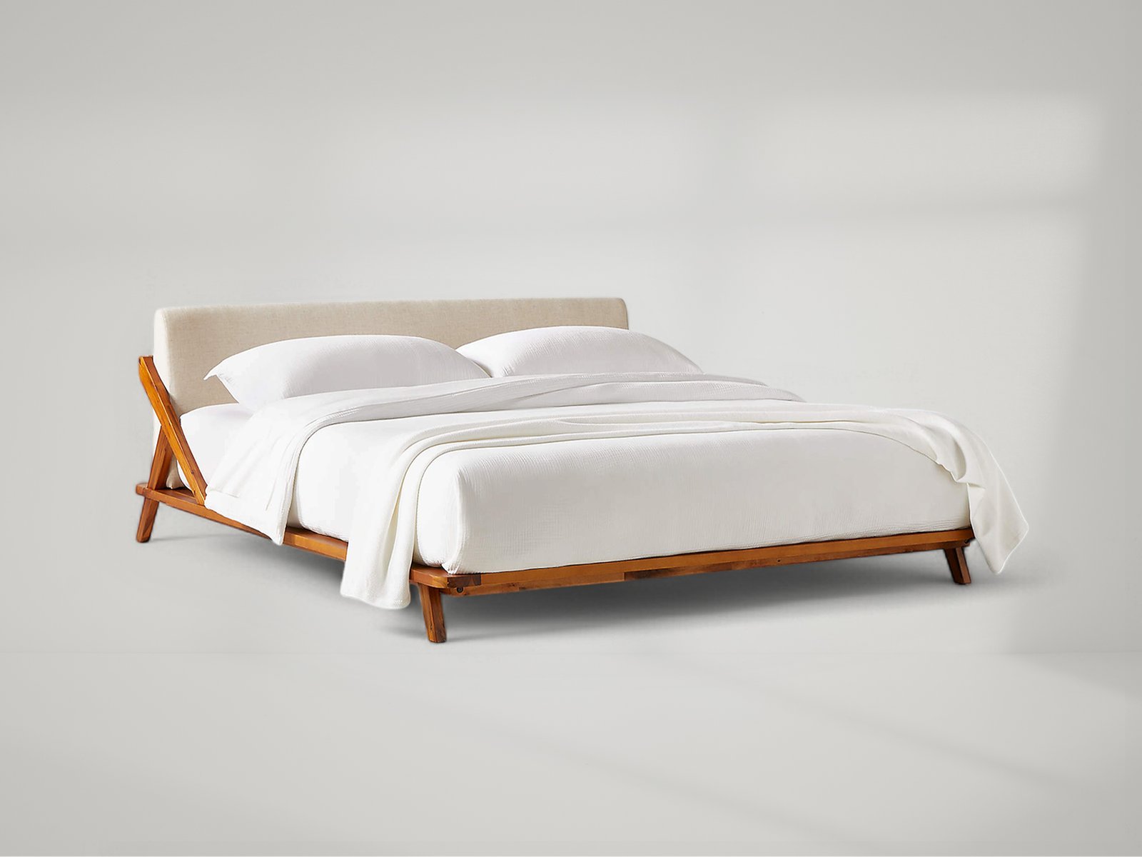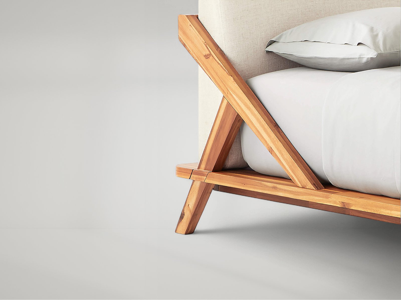 Both architectural and comfy, master wooden bed frame designed by Jannis Ellenberger is a dream from every angle. Aligned with Ellenberger's style of simple construction with unexpected details, "the combination of contrasting materials and inclining lines make the design modern and fresh." With its warm tones and graceful grain, solid sustainable teak wood intersects angular legs that meet in an open back on low-profile platform—a natural complement to plush upholstered headboard, tailored in an ivory poly/linen weave.