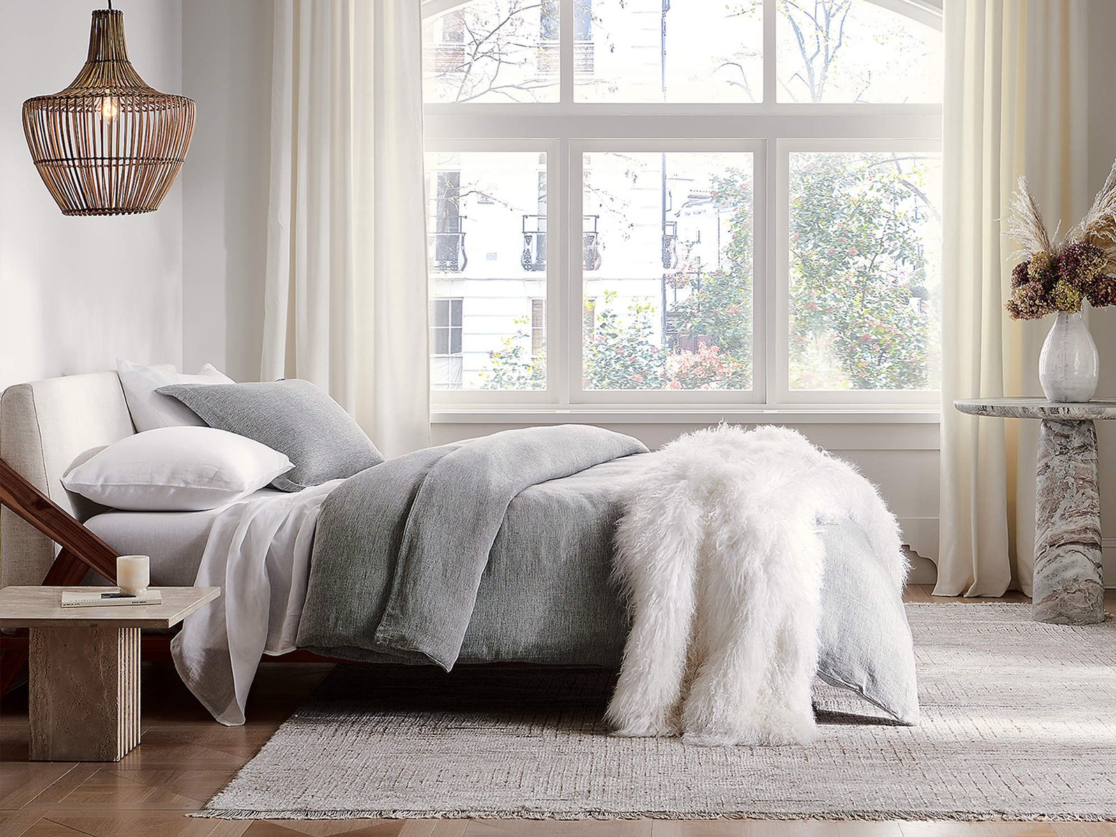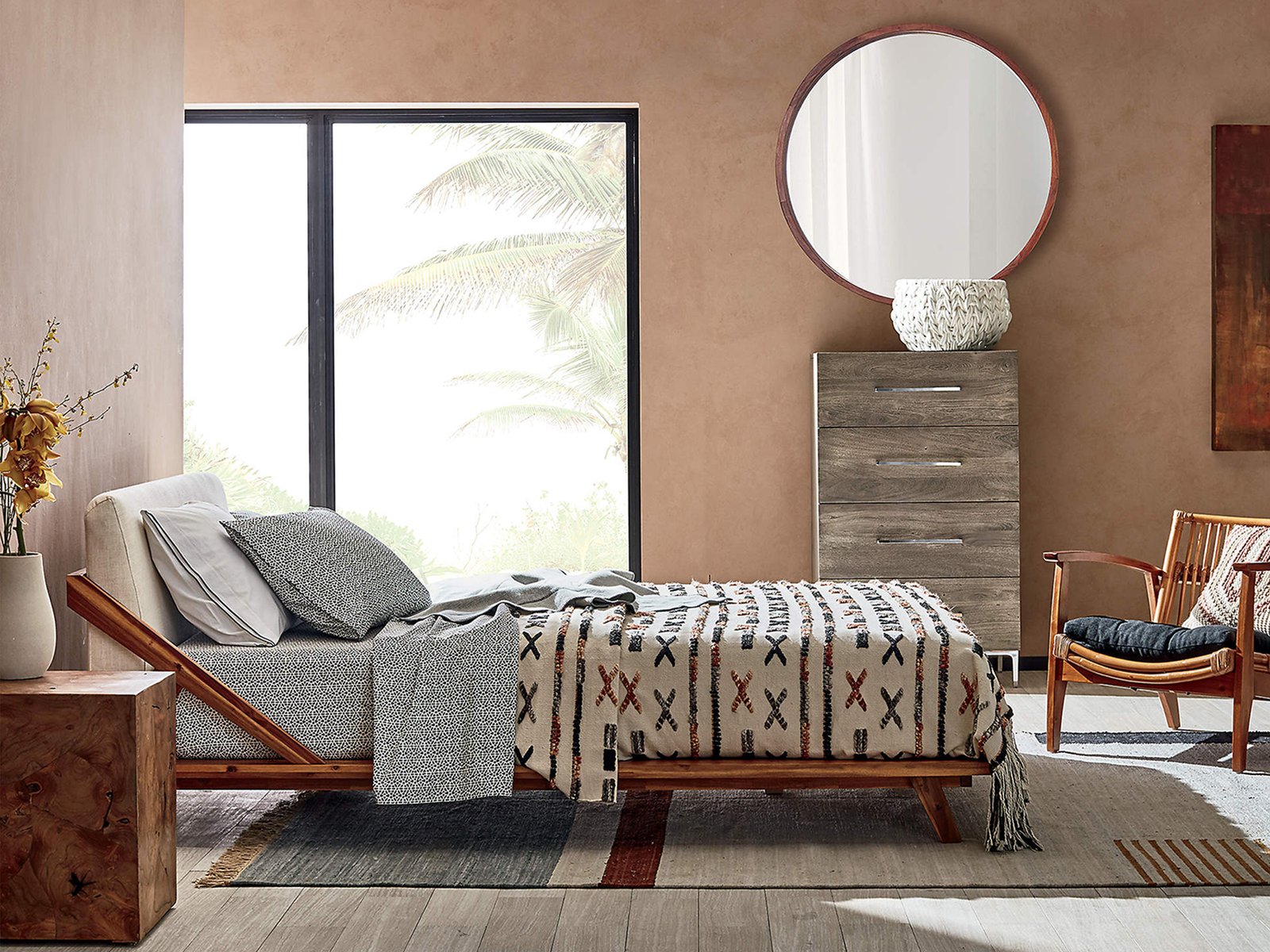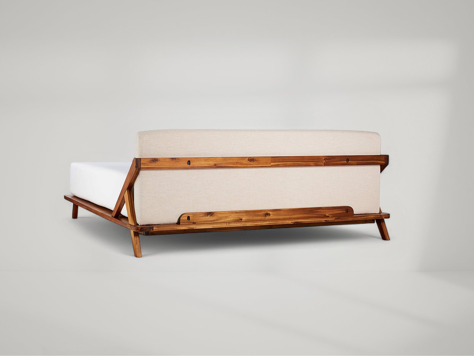 Both architectural and comfy, master wooden bed frame designed by Jannis Ellenberger is a dream from every angle. Aligned with Ellenberger's style of simple construction with unexpected details, "the combination of contrasting materials and inclining lines make the design modern and fresh." With its warm tones and graceful grain, solid sustainable teak wood intersects angular legs that meet in an open back on low-profile platform—a natural complement to plush upholstered headboard, tailored in an ivory poly/linen weave.