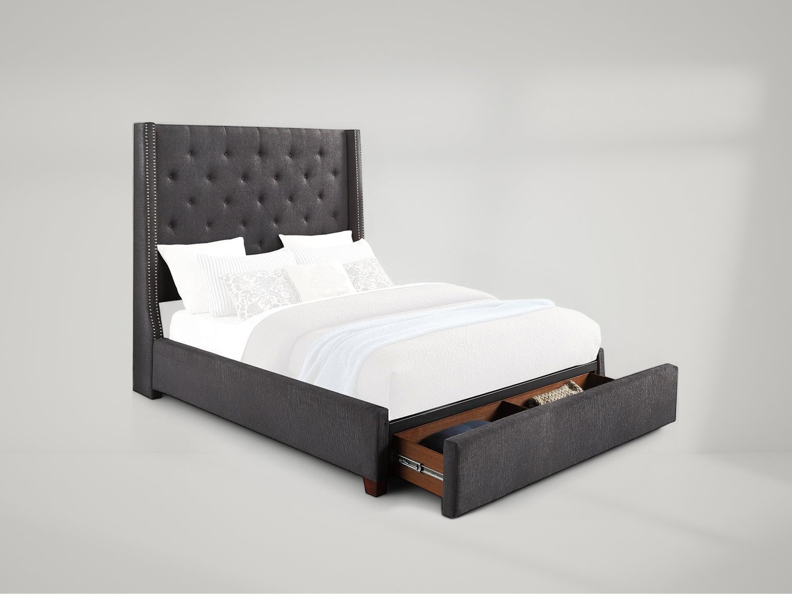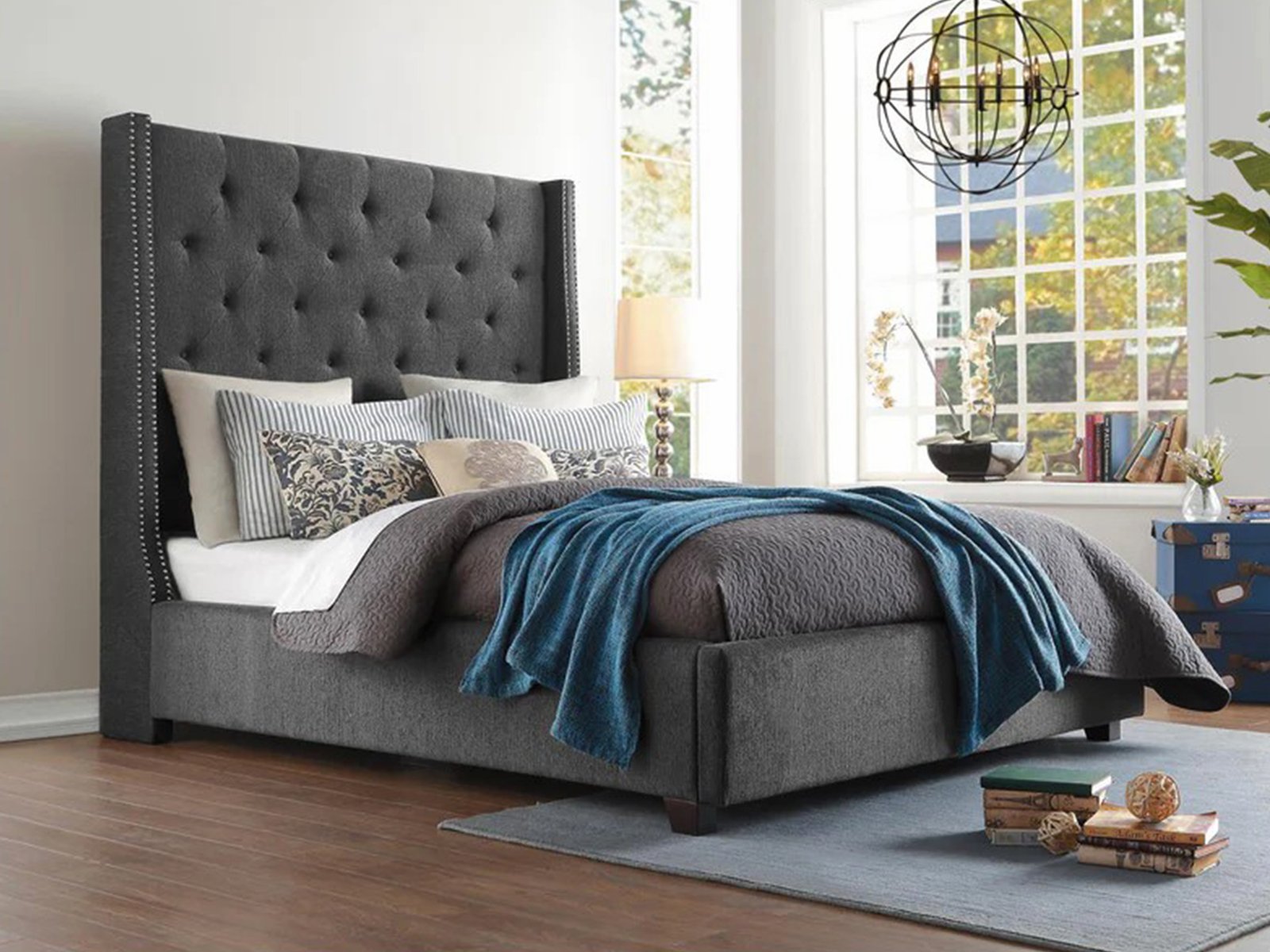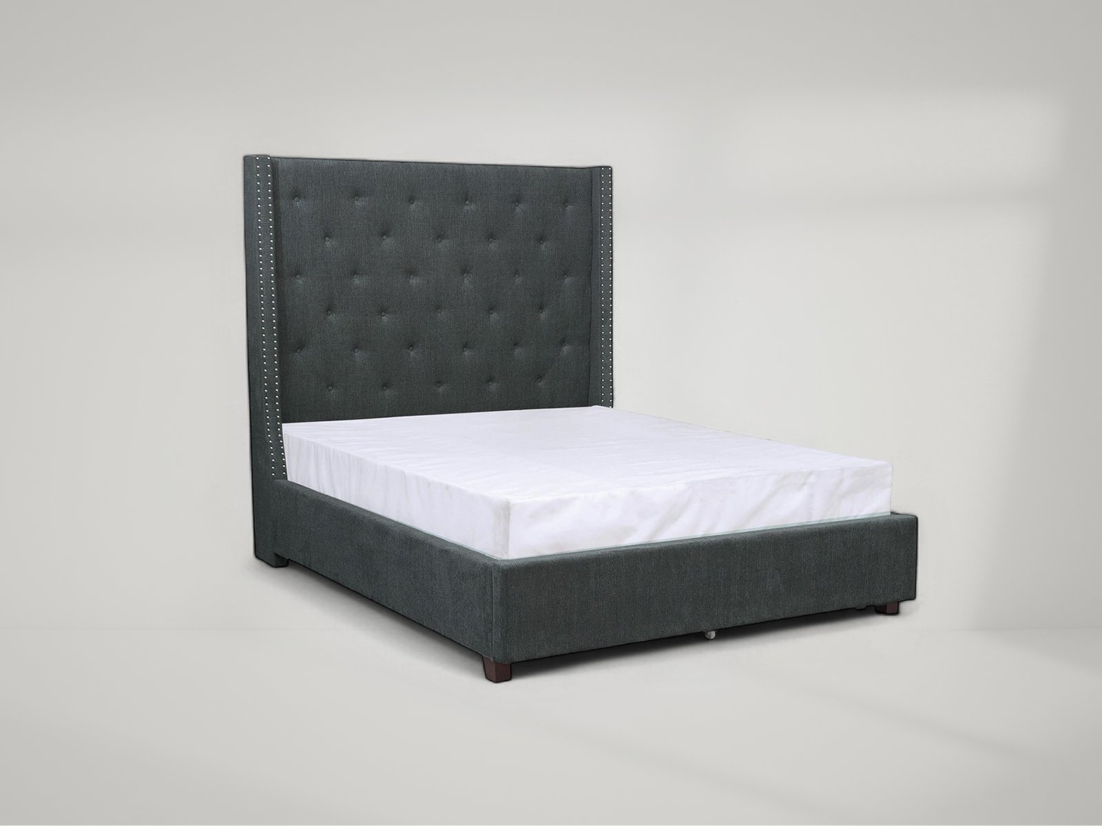 The stately profile of the Fairborn Collection will lend an air of understated elegance to your bedroom. The queen mansion headboard features nailhead accent and button tufting creating a modern traditional look that defines your personal style. Gray fabric covers the bed, providing neutral complement to your decorative bedding.