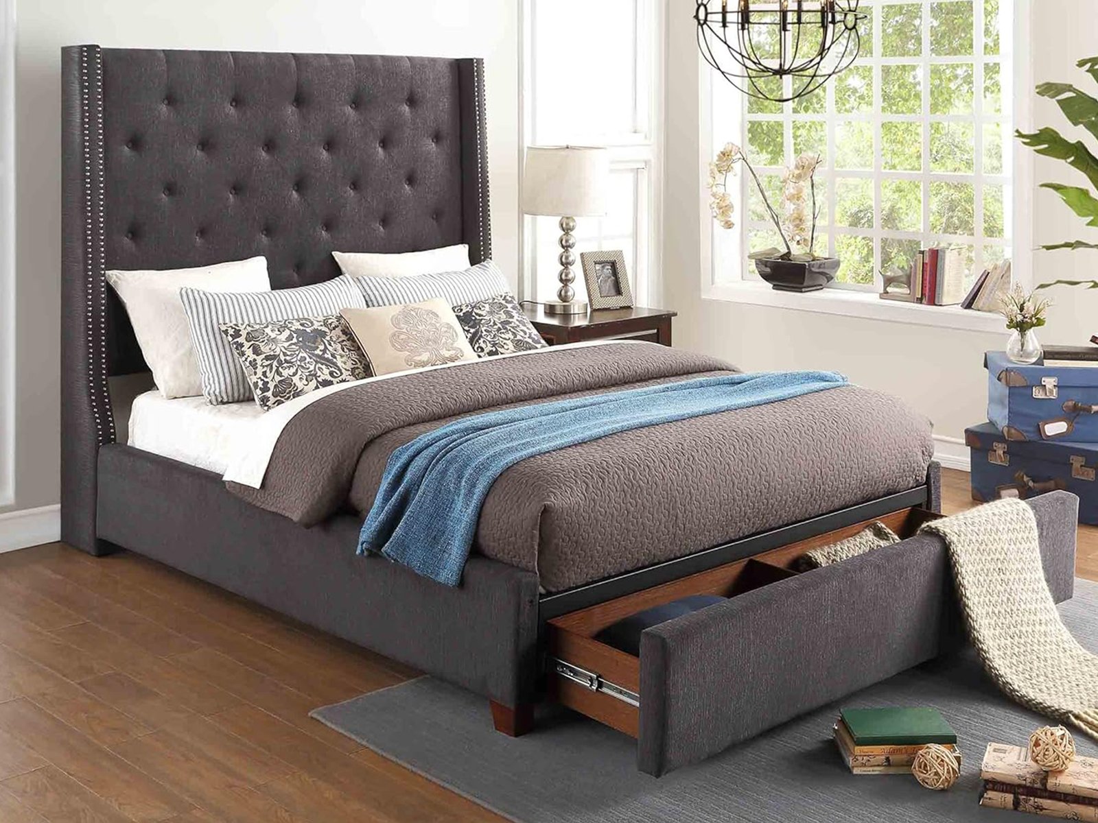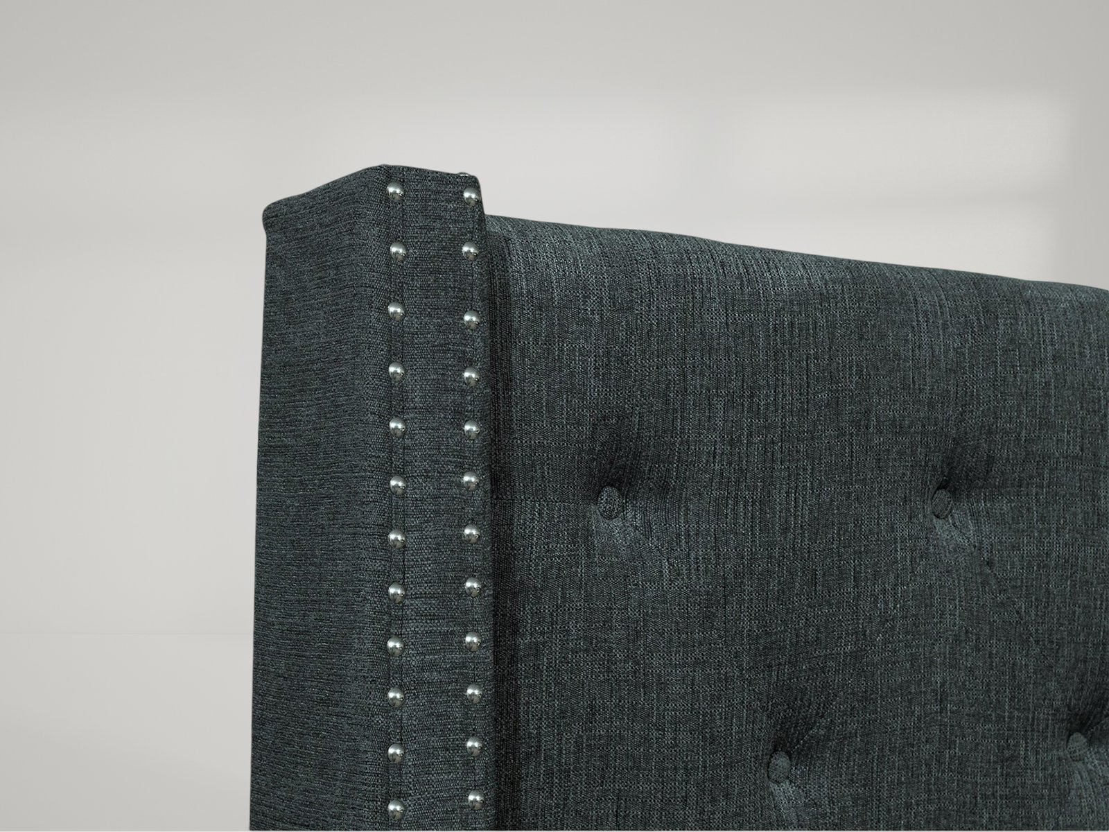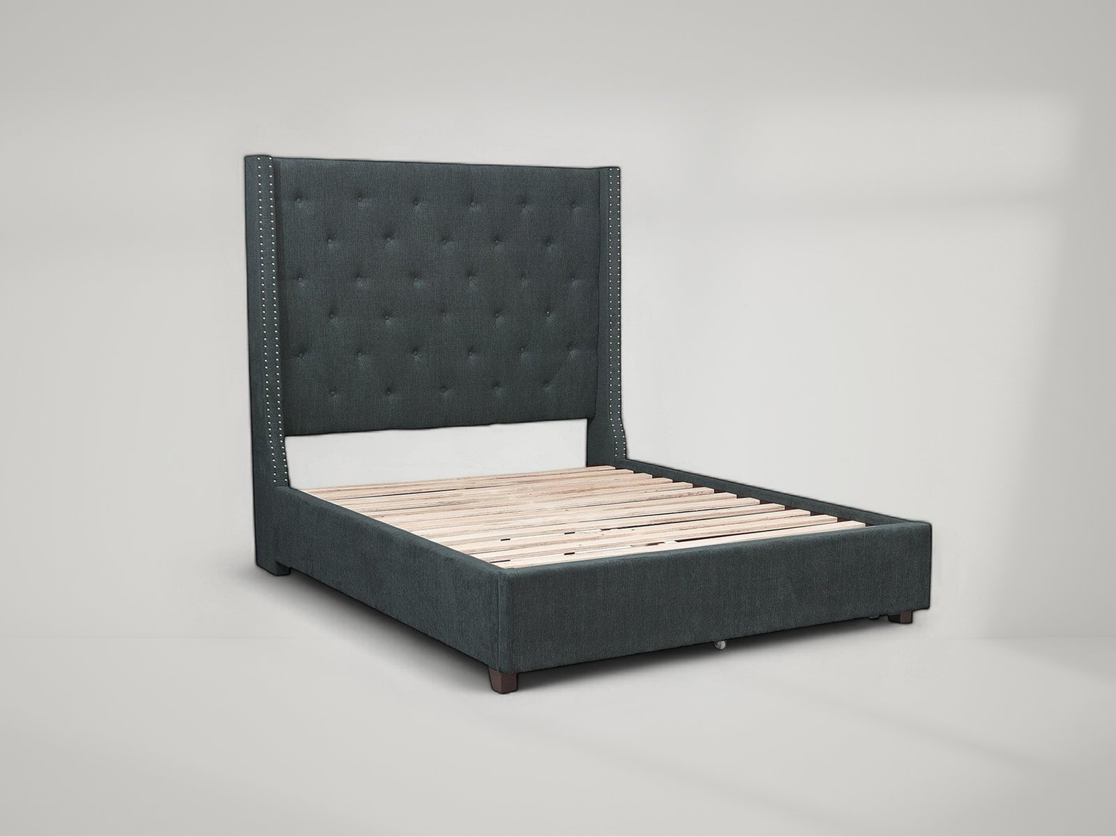 The stately profile of the Fairborn Collection will lend an air of understated elegance to your bedroom. The queen mansion headboard features nailhead accent and button tufting creating a modern traditional look that defines your personal style. Gray fabric covers the bed, providing neutral complement to your decorative bedding.