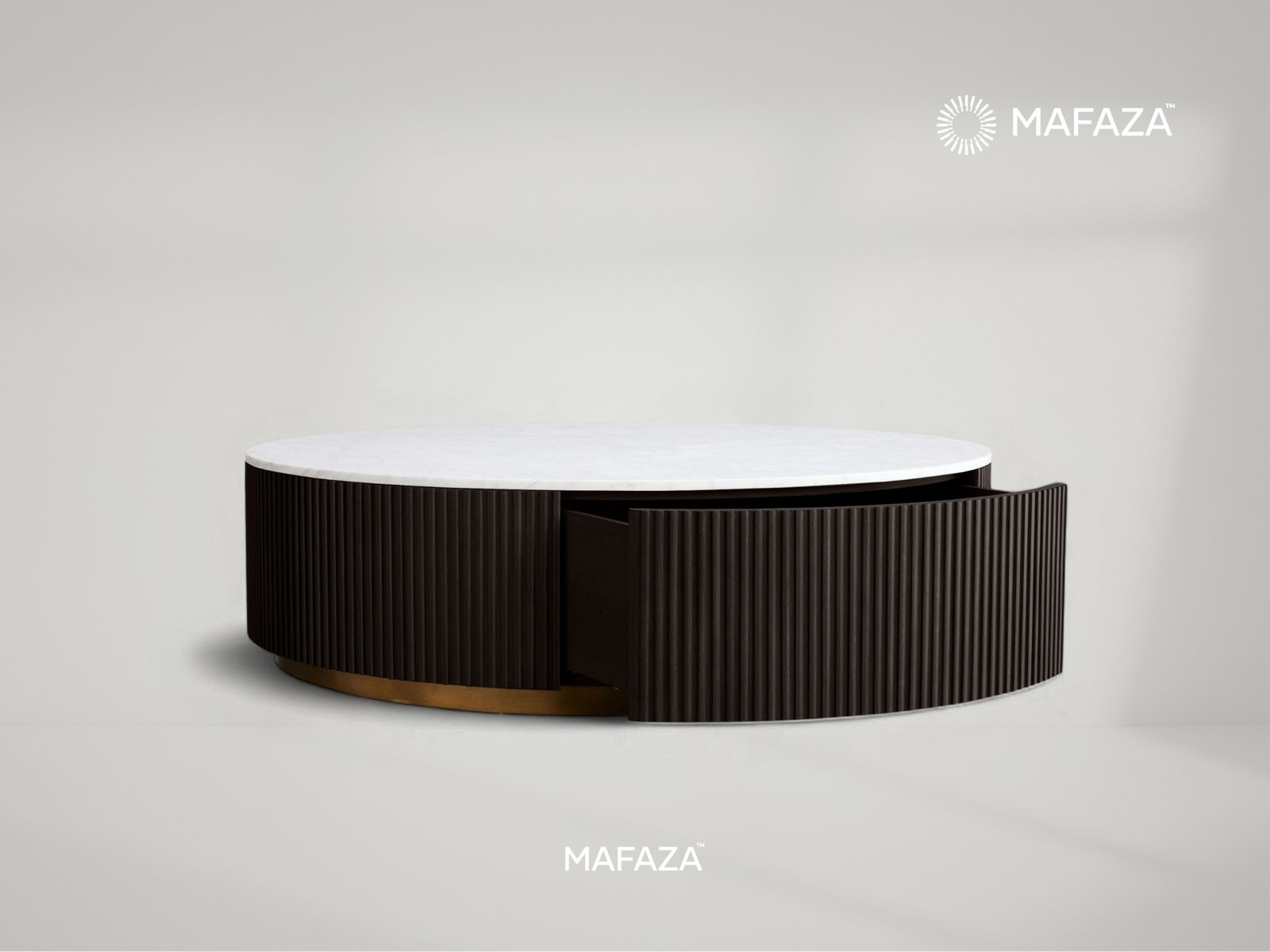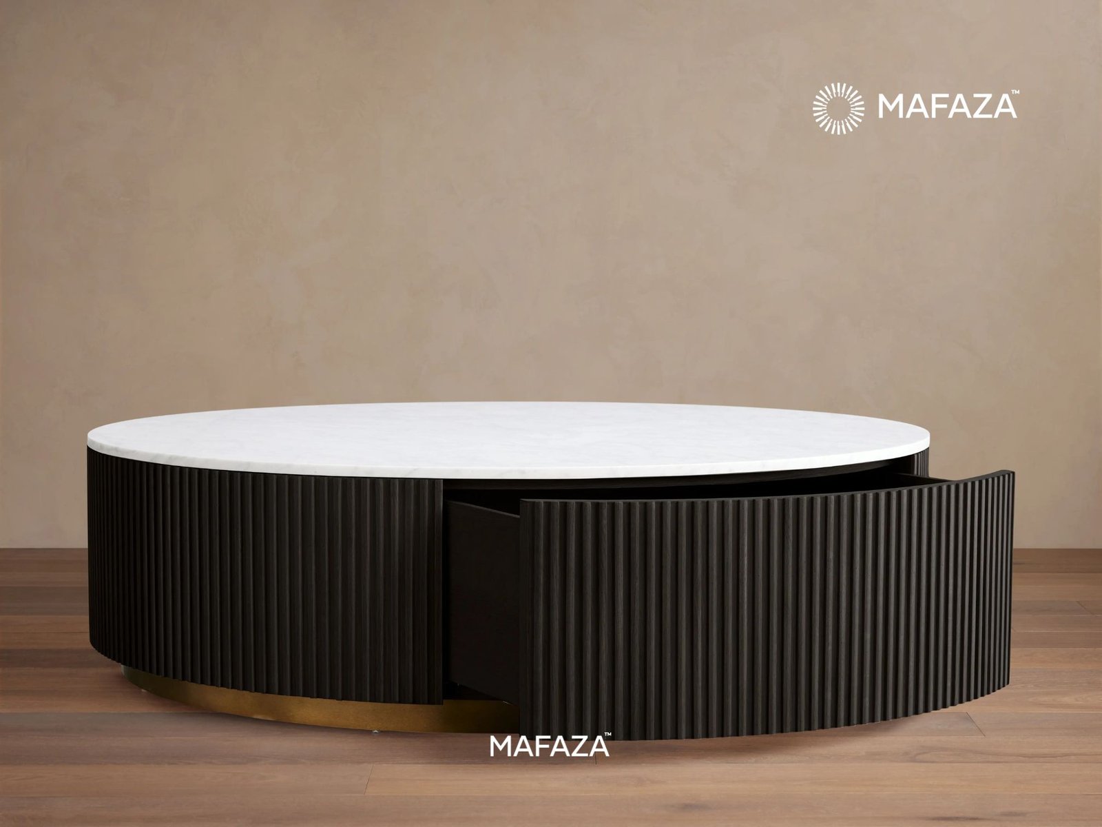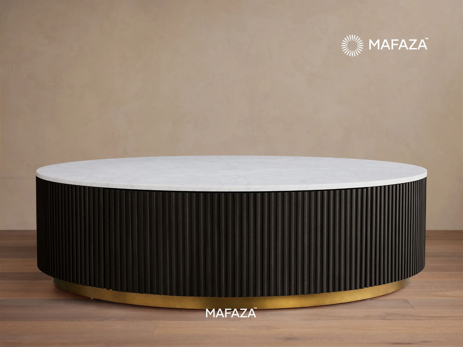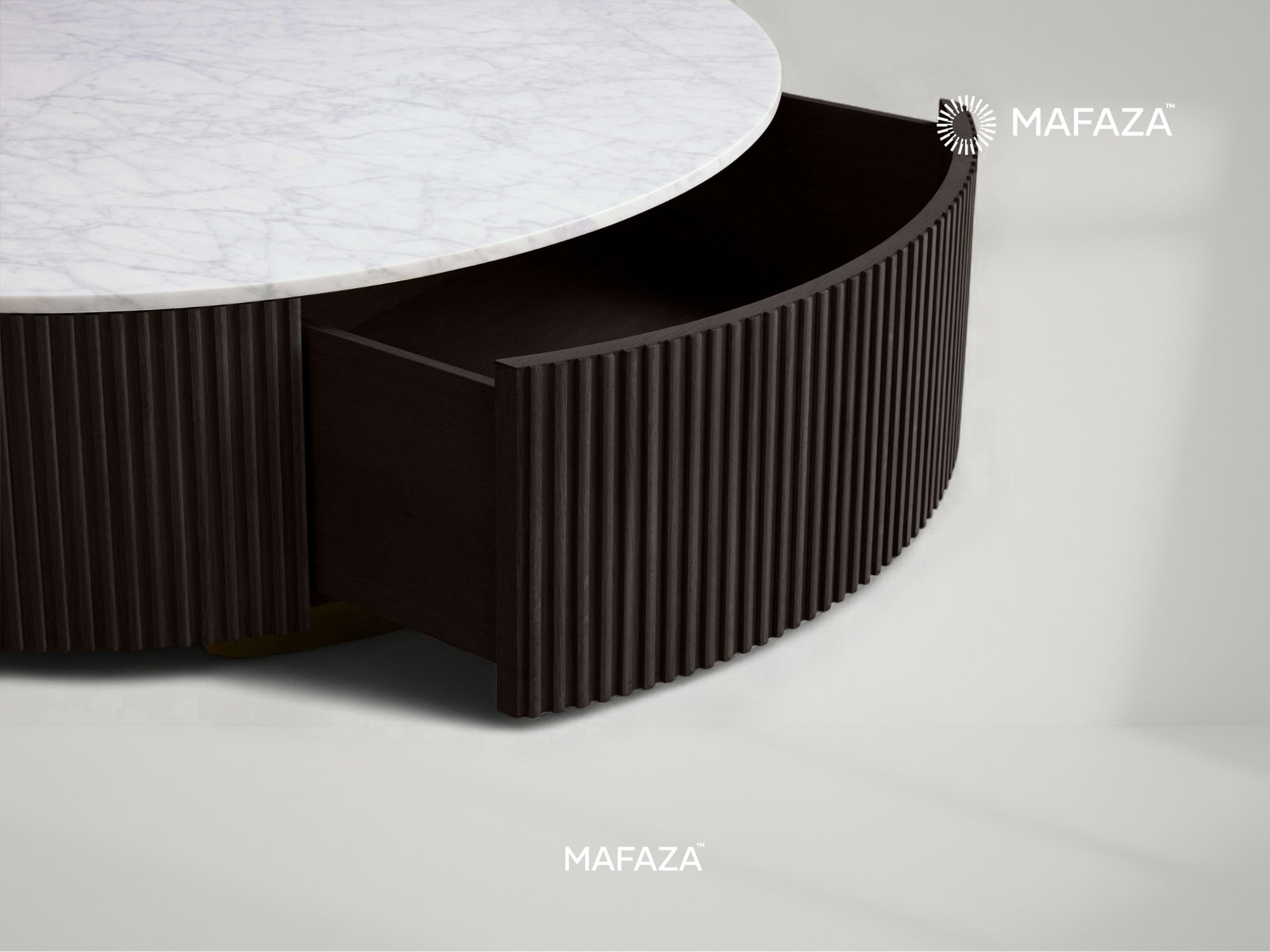 Where clever design and classic grace coexist. A dramatic contrast of texture and tone is produced by the Fenny Round Coffee Table's elegant Carrara marble top resting on fluted teak wood. Its sculptured shape conceals a hidden drawer for convenient storage, combining style and functionality. This item, which is made from certified teak, epitomizes contemporary elegance for rooms that value understated quality.
