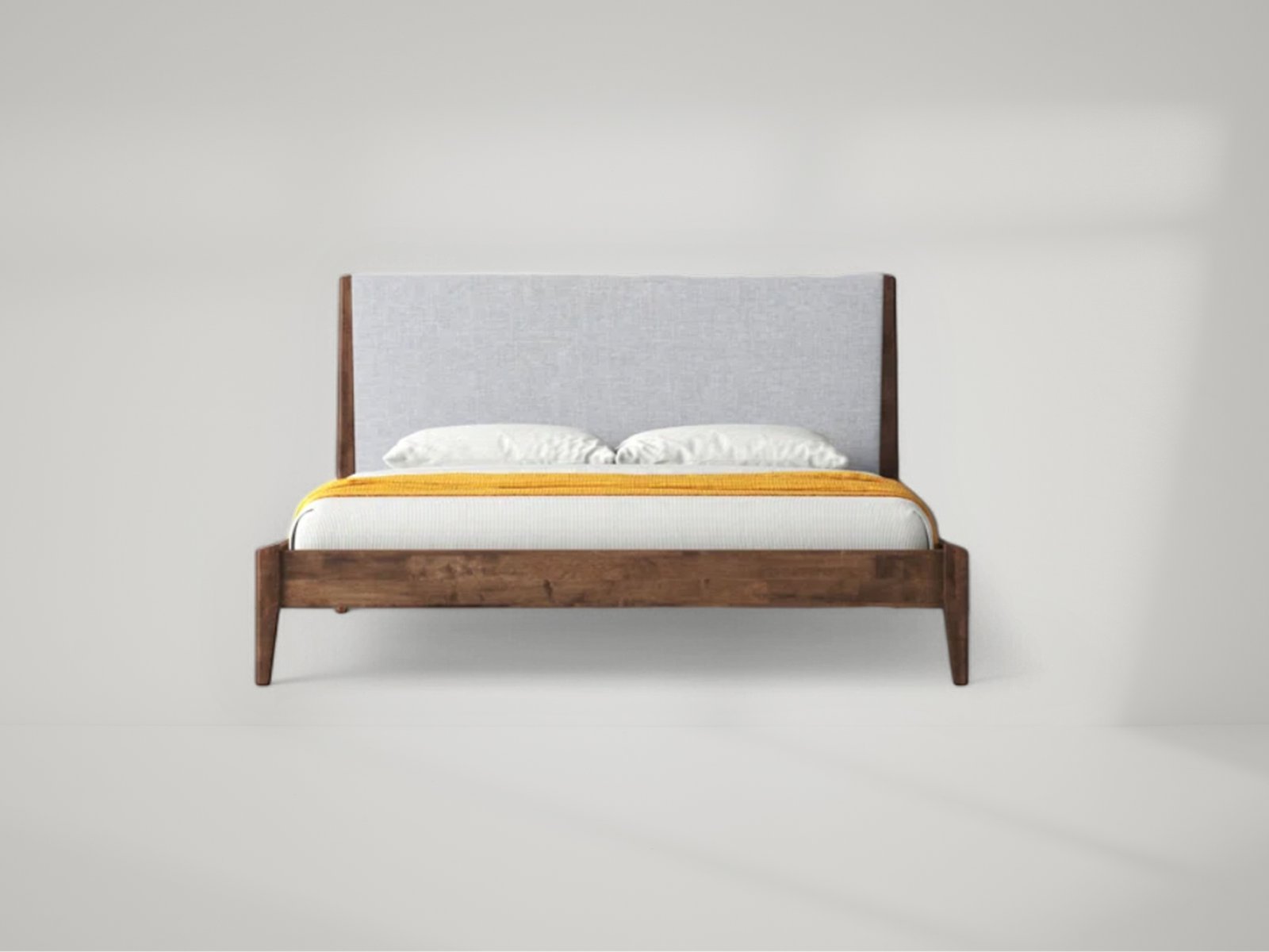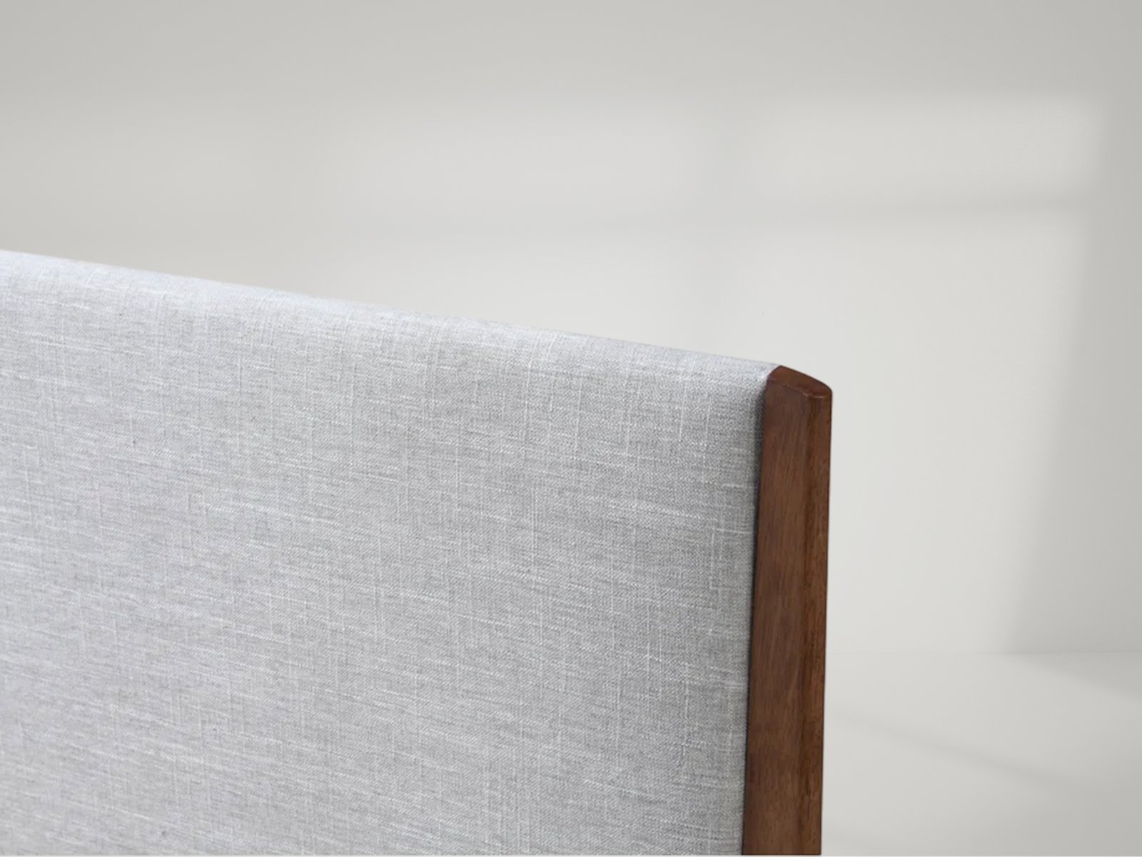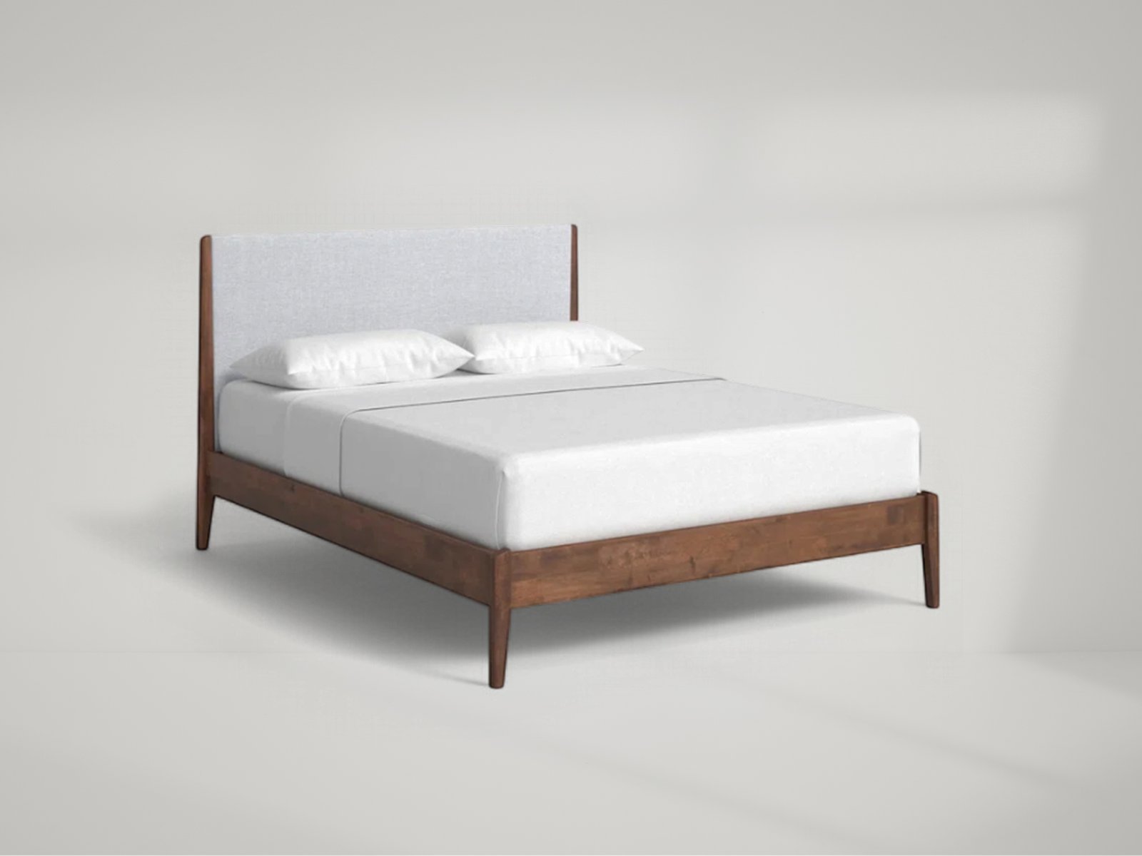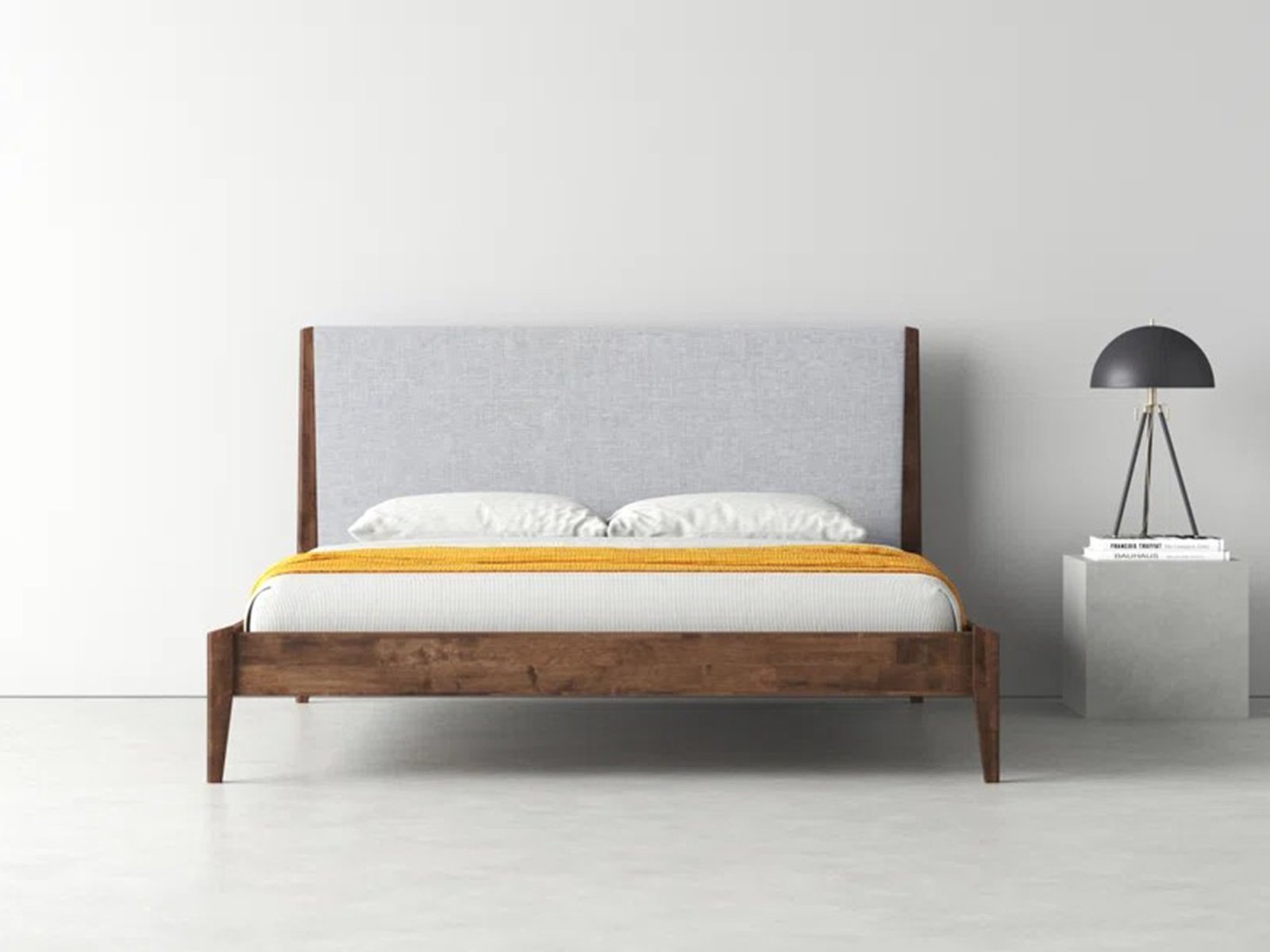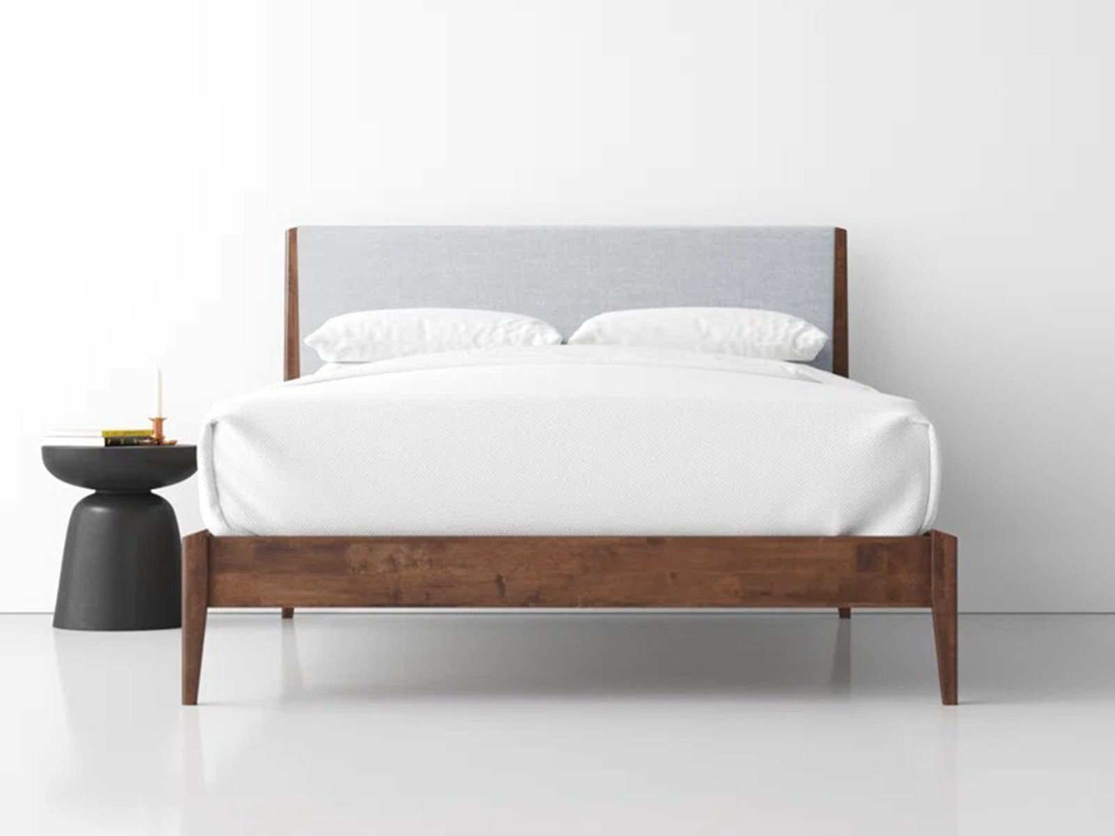 The nap zone. This platform bed frame blends clean lines, natural wood grains, and neutral upholstery to create a Scandi vibe in your bedroom. Its low profile gives the illusion of open space, and the padded headboard invites longer lounging. Sturdy kiln-dried wood construction eliminates the need for a box spring.