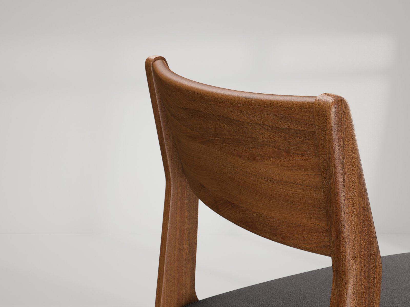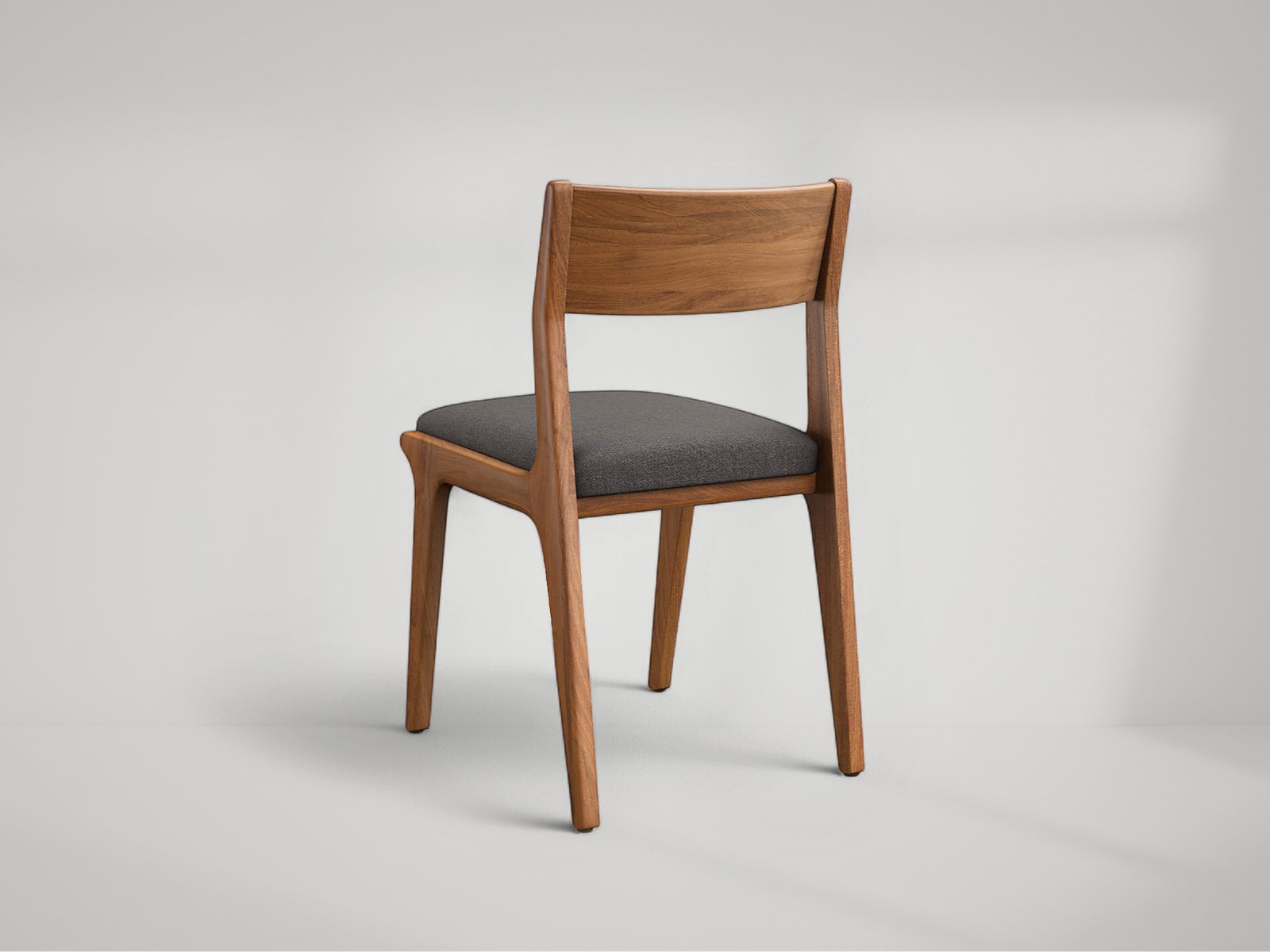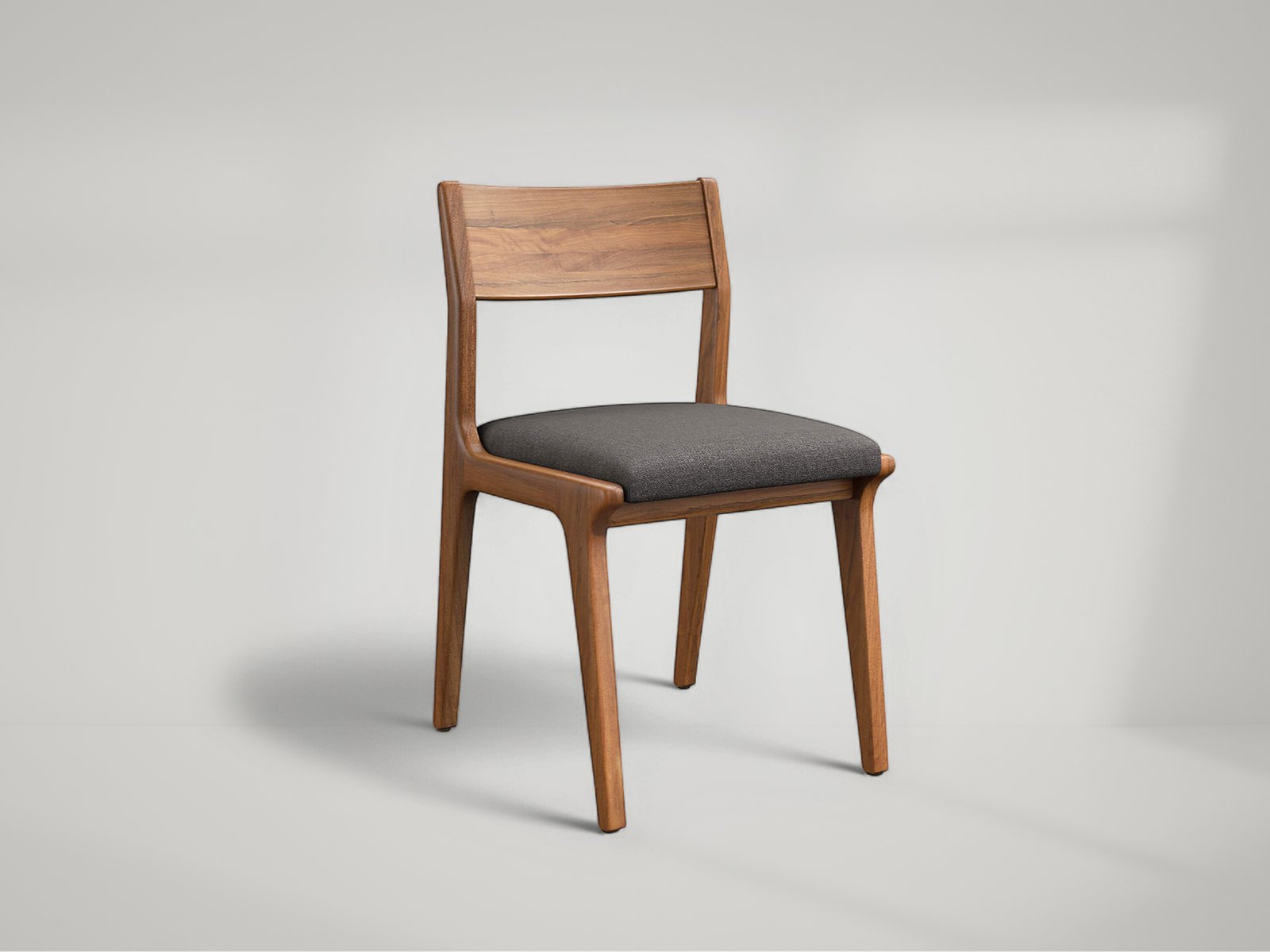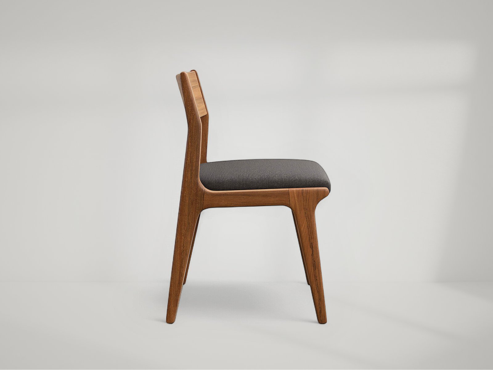 Designed to coordinate with our Lakin dining table, this side chair is a true classic that can sit with any table in our collection. Solid teak stars in the graceful mix of curves and lines seen in the tapered legs, angled back and slanted stance. The inset cushion is covered in a linen-like fabric in dark grey as a modern complement to the frame's warm wood tones. The Lakin teak wood dining chair is a Crate & Barrel exclusive.