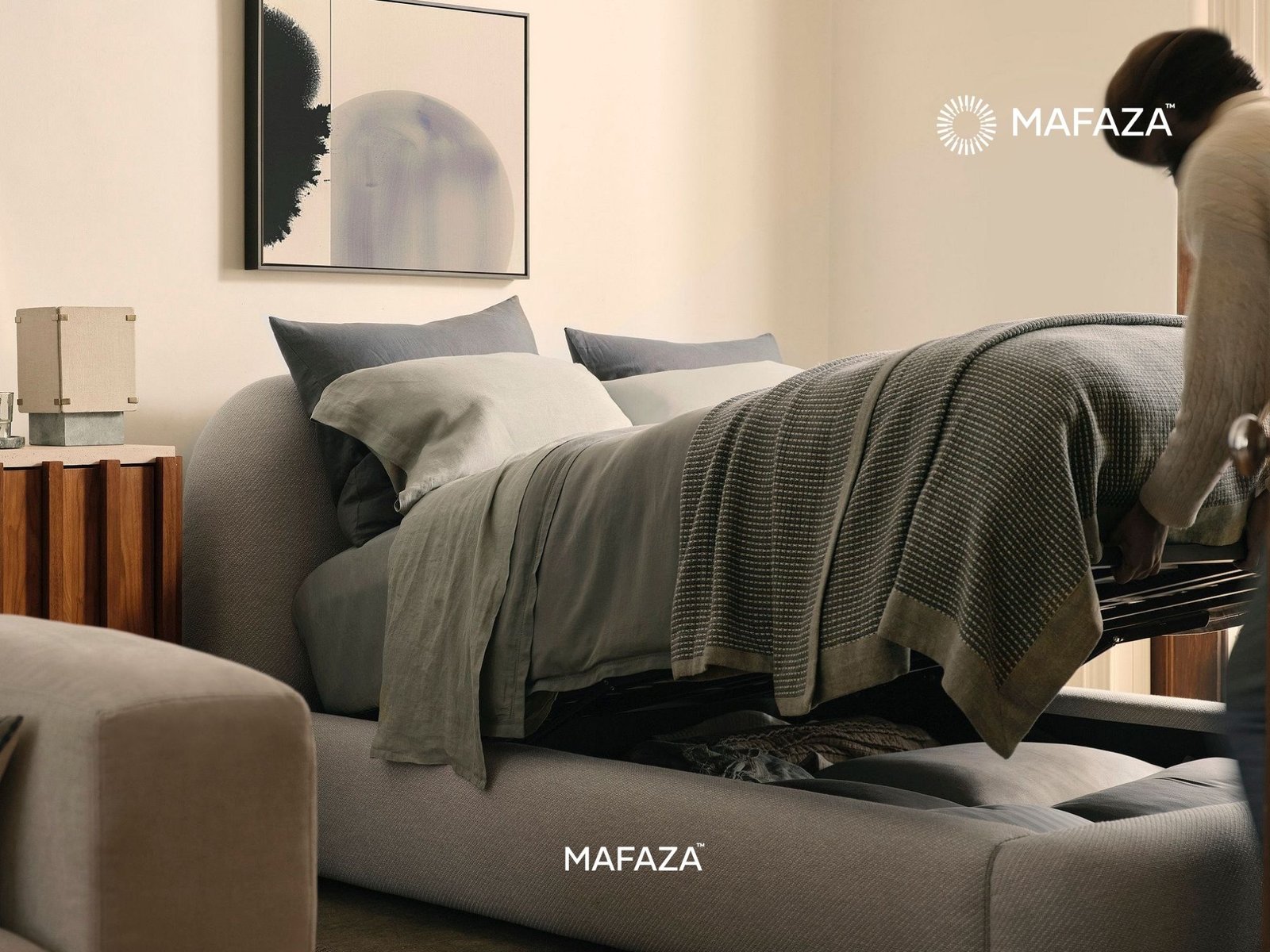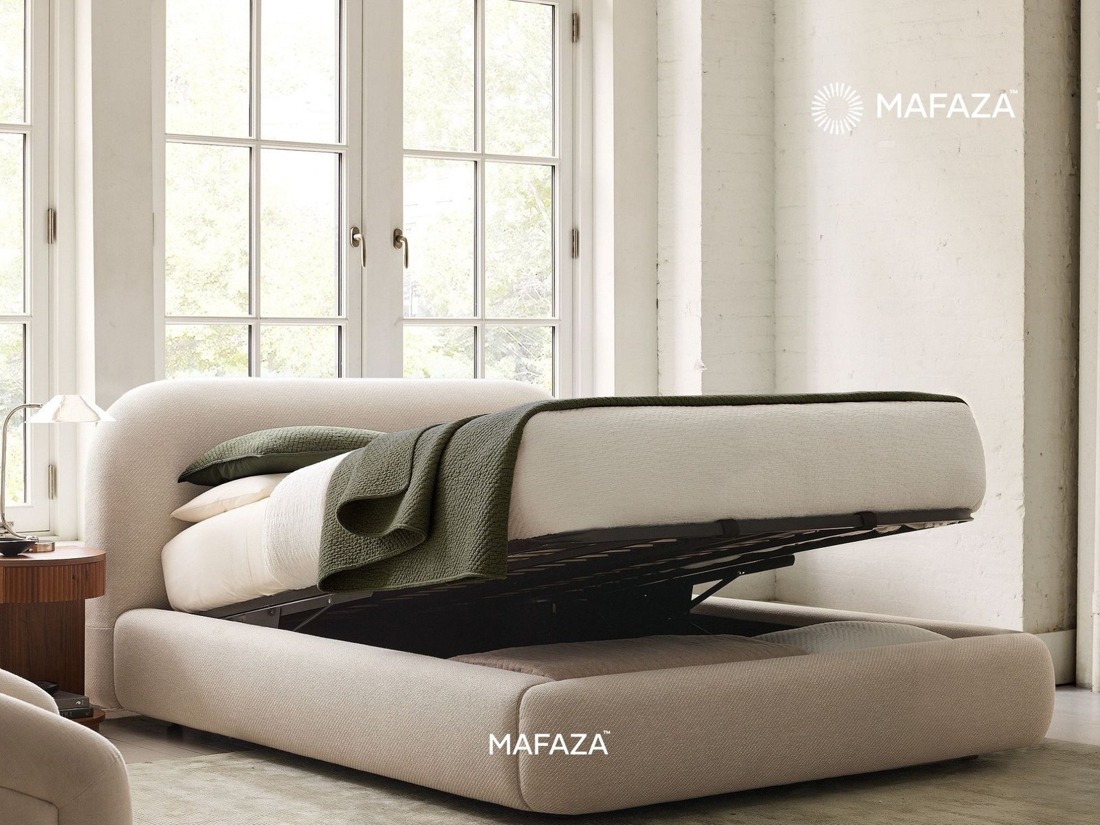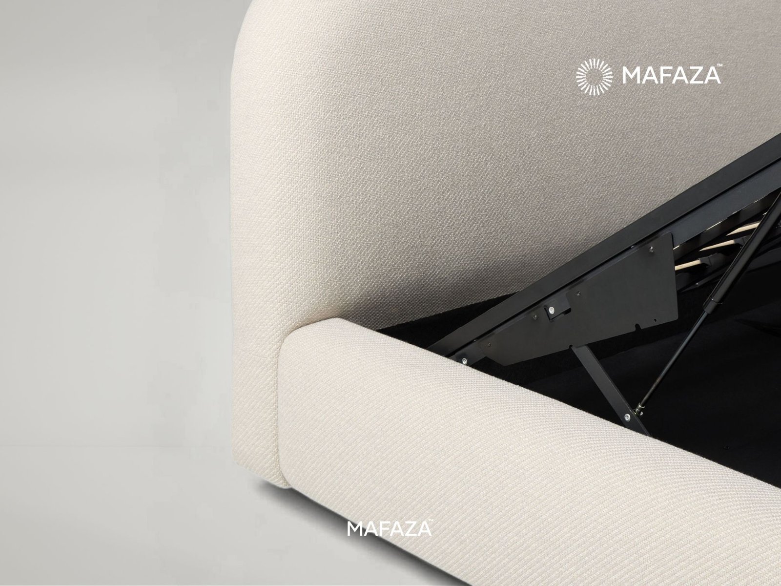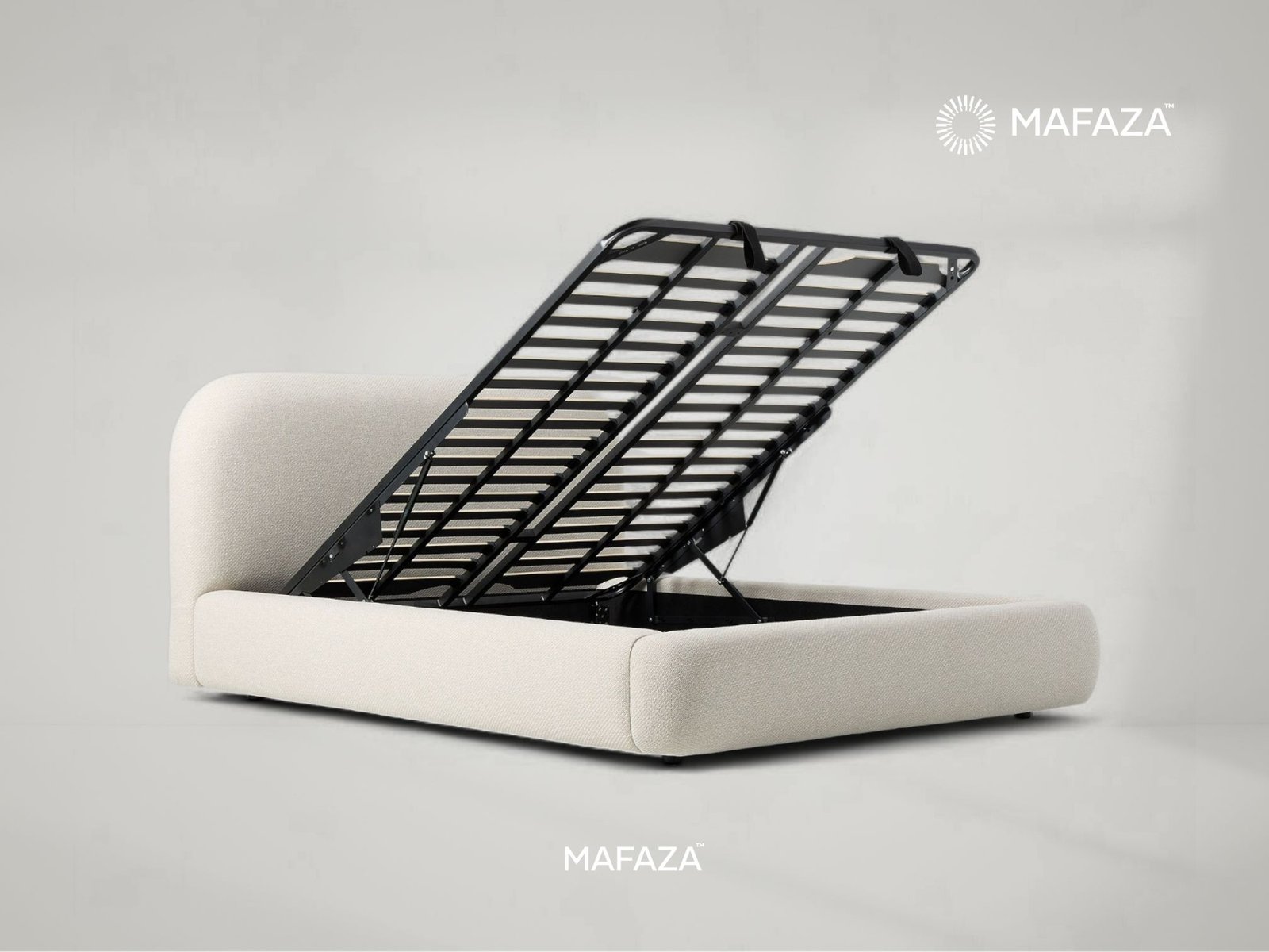 Enter the Laurent Pop-Up Storage Bed Frame's cloud-like softness. Its appealing, rounded design and rich, textured upholstery instantly transform your bedroom into a sophisticated, quiet refuge. Laurent's gentle exterior belies his efficient engineering. The mattress is effortlessly raised by the concealed hydraulic lift system, exposing a large, conveniently accessible storage area beneath. This bed is made with a solid base of Certified Teak Wood and Metal, which ensures long-lasting support and cutting-edge performance. Laurent is the intersection between strong, covert organization with modern softness.