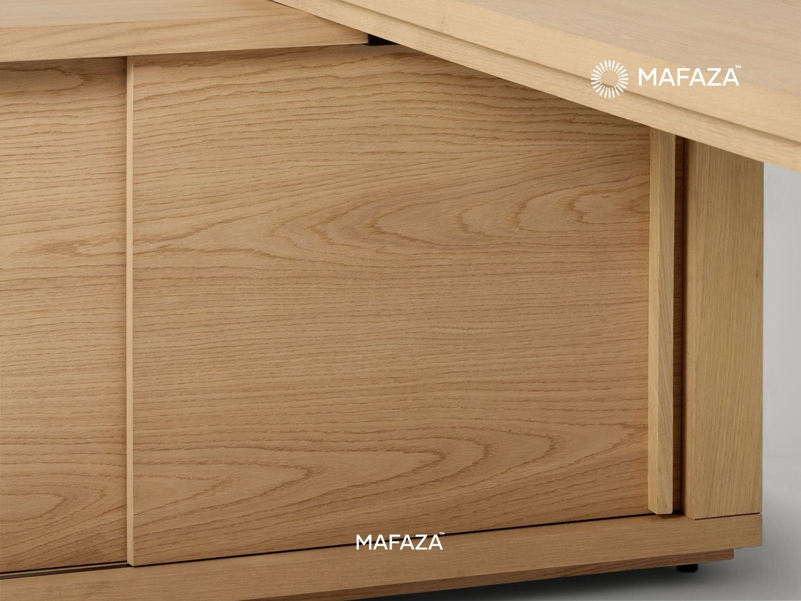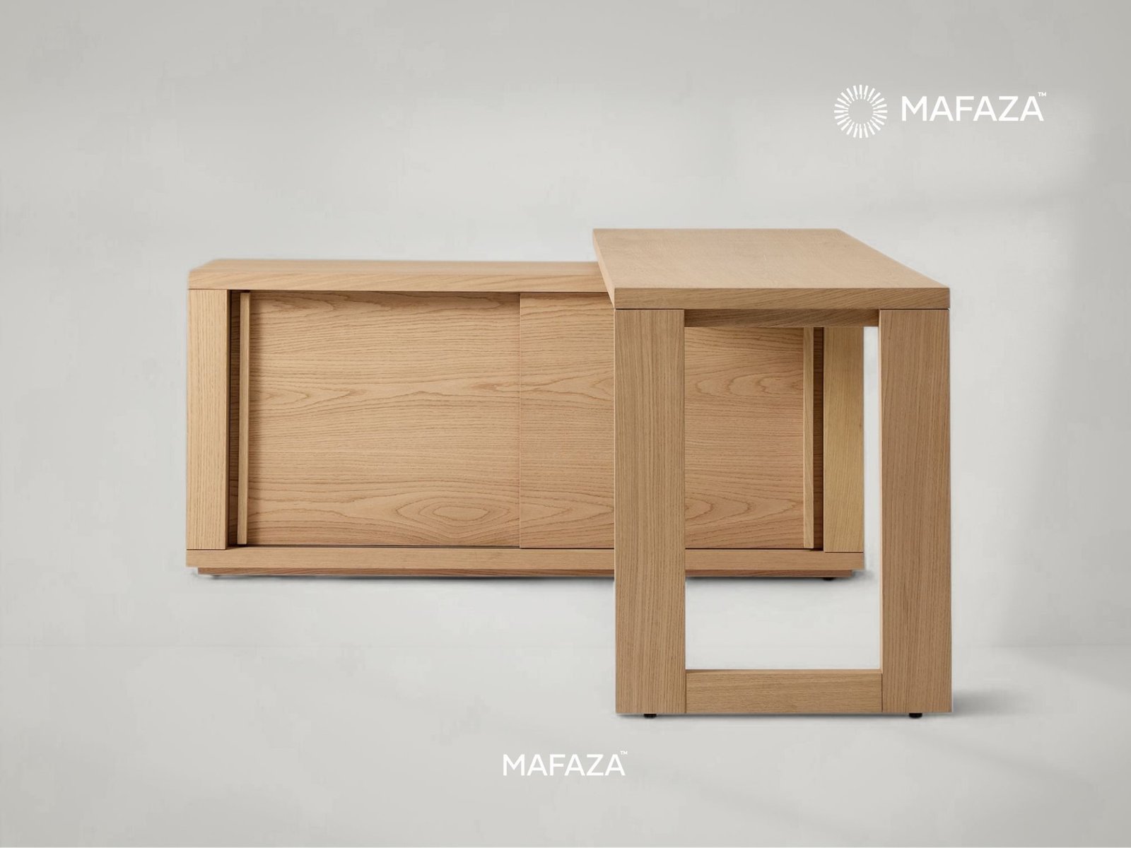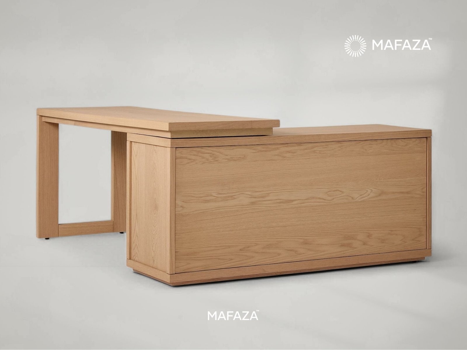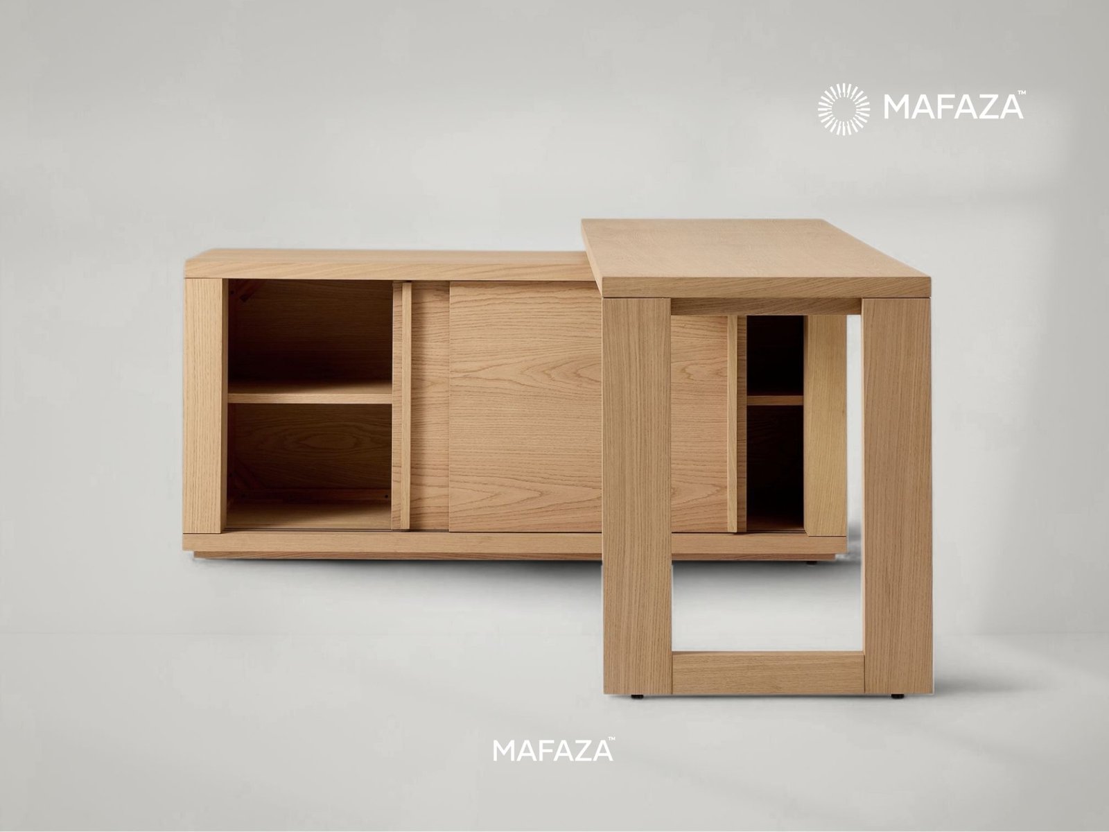 The Lutcer L-Shaped Storage Desk combines form and adaptability. It features two sliding-door cabinets with internal shelving and is made of certified teak wood, combining natural workmanship with clever organization in a seamless way.