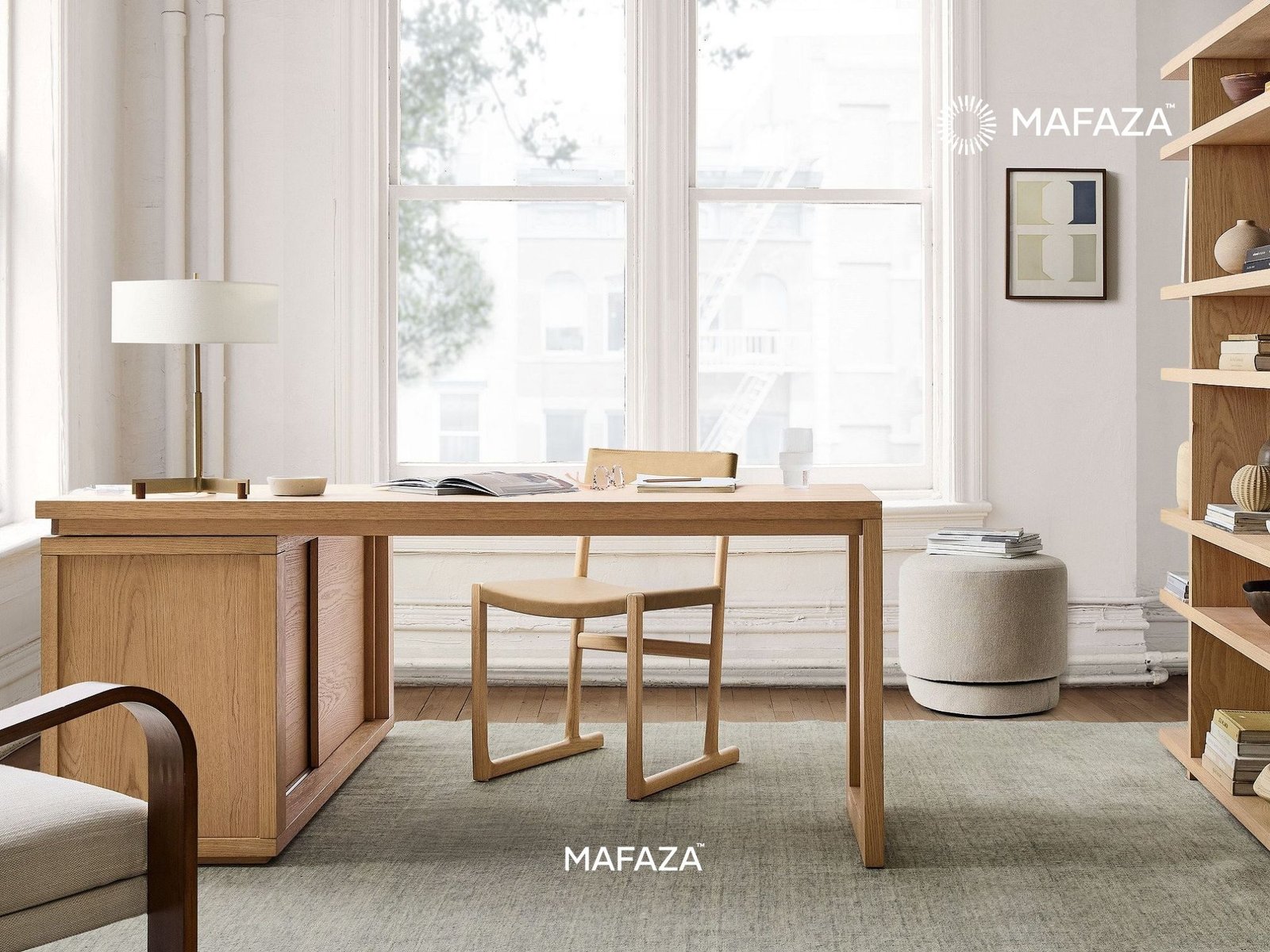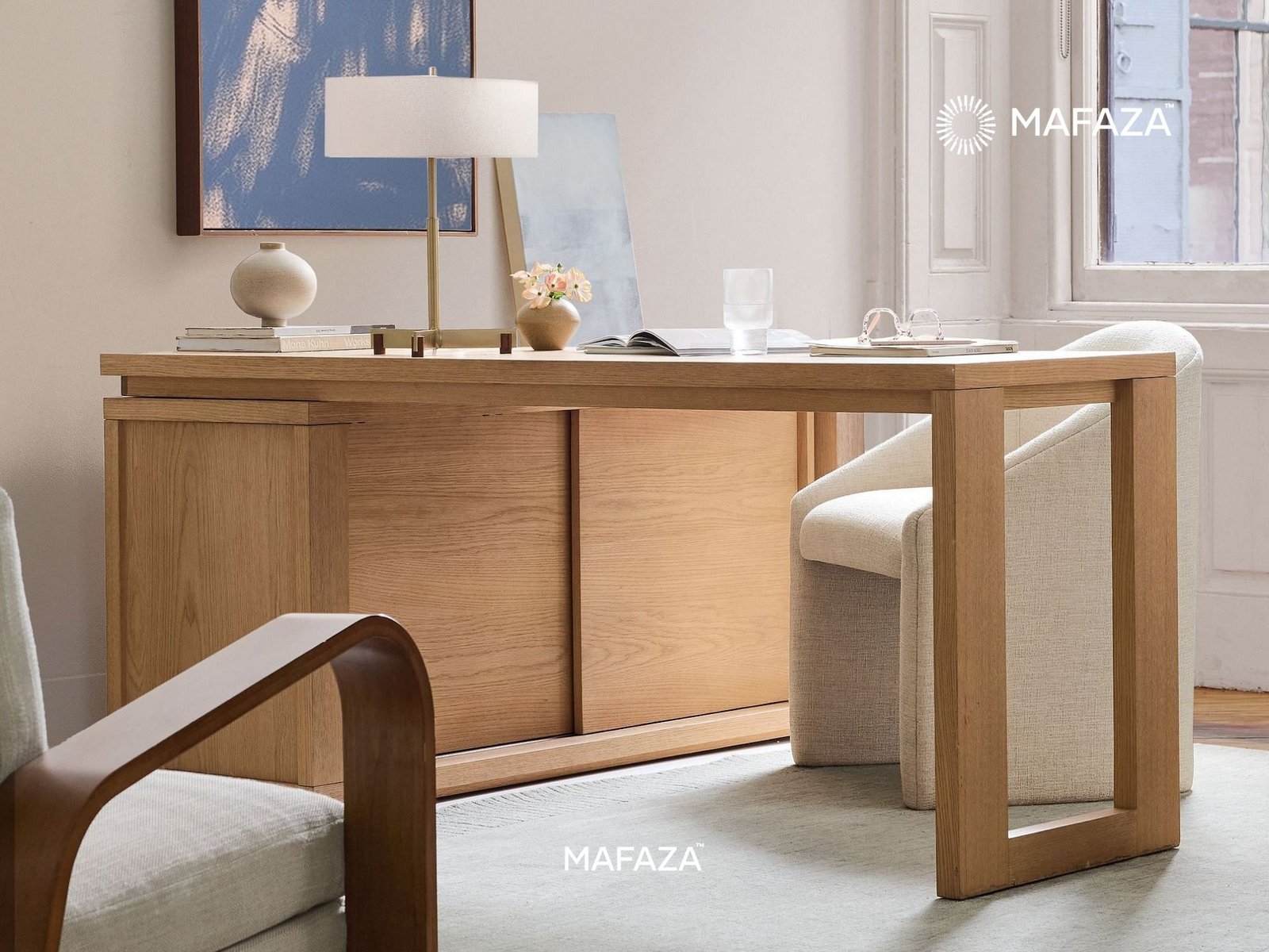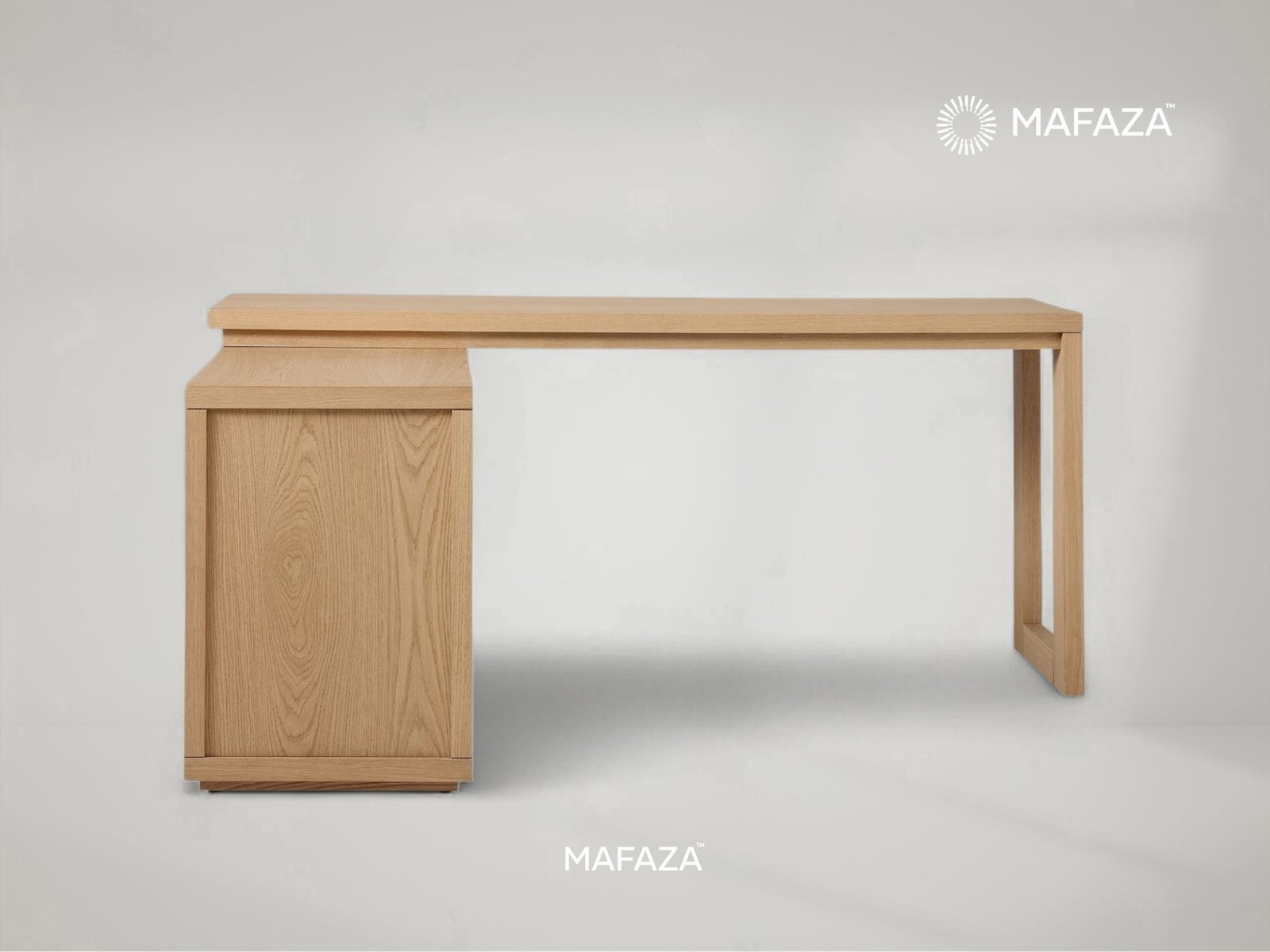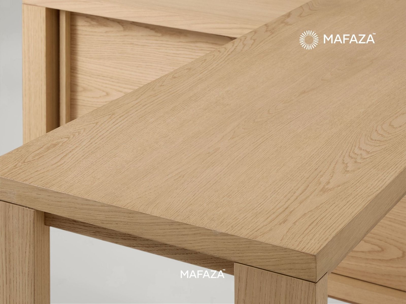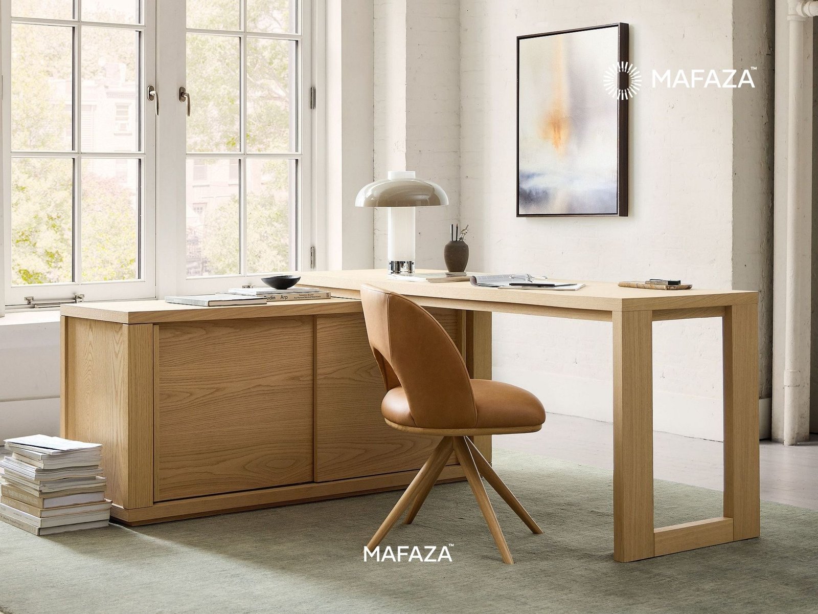 The Lutcer L-Shaped Storage Desk combines form and adaptability. It features two sliding-door cabinets with internal shelving and is made of certified teak wood, combining natural workmanship with clever organization in a seamless way.