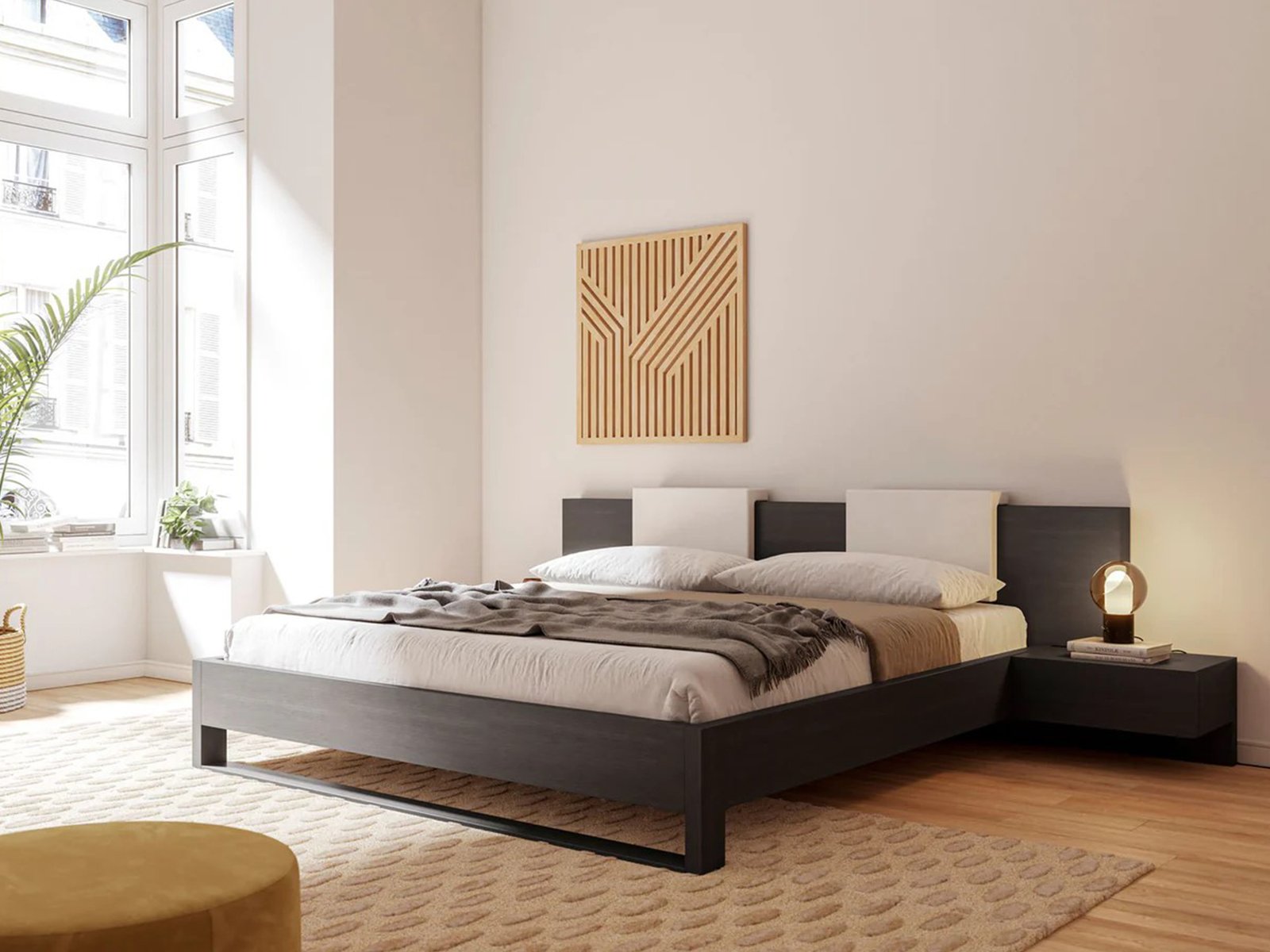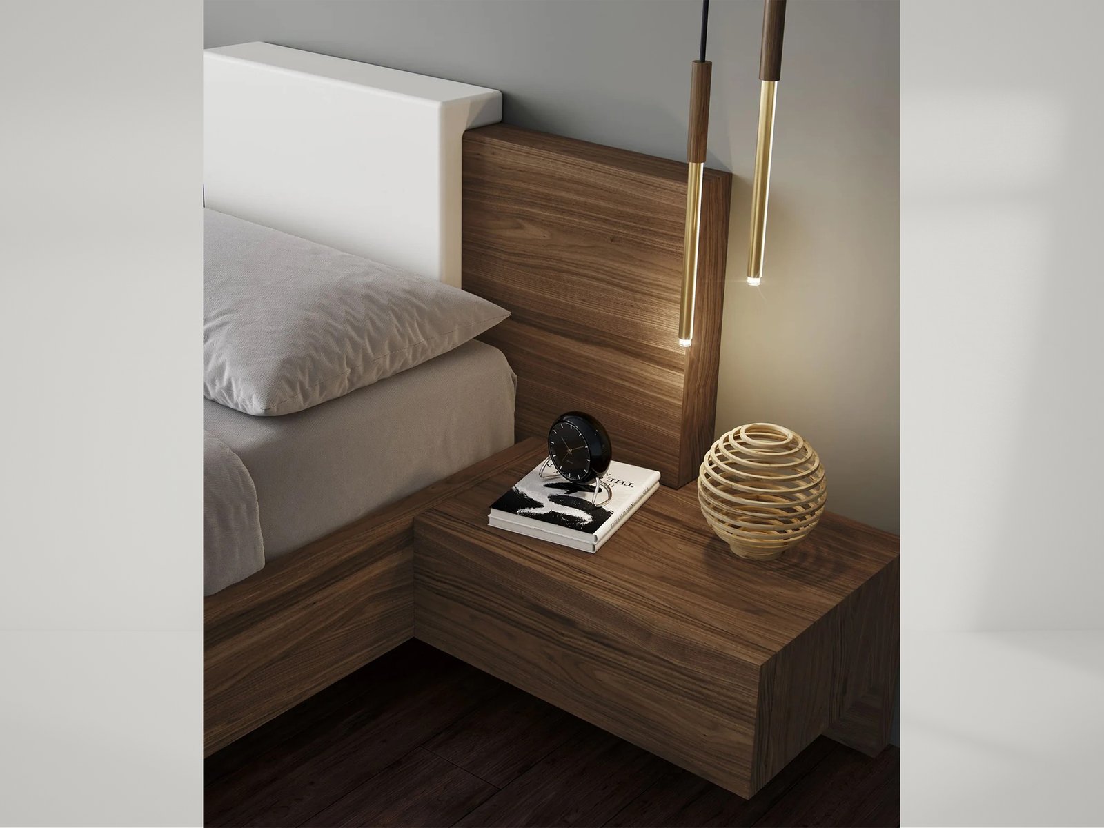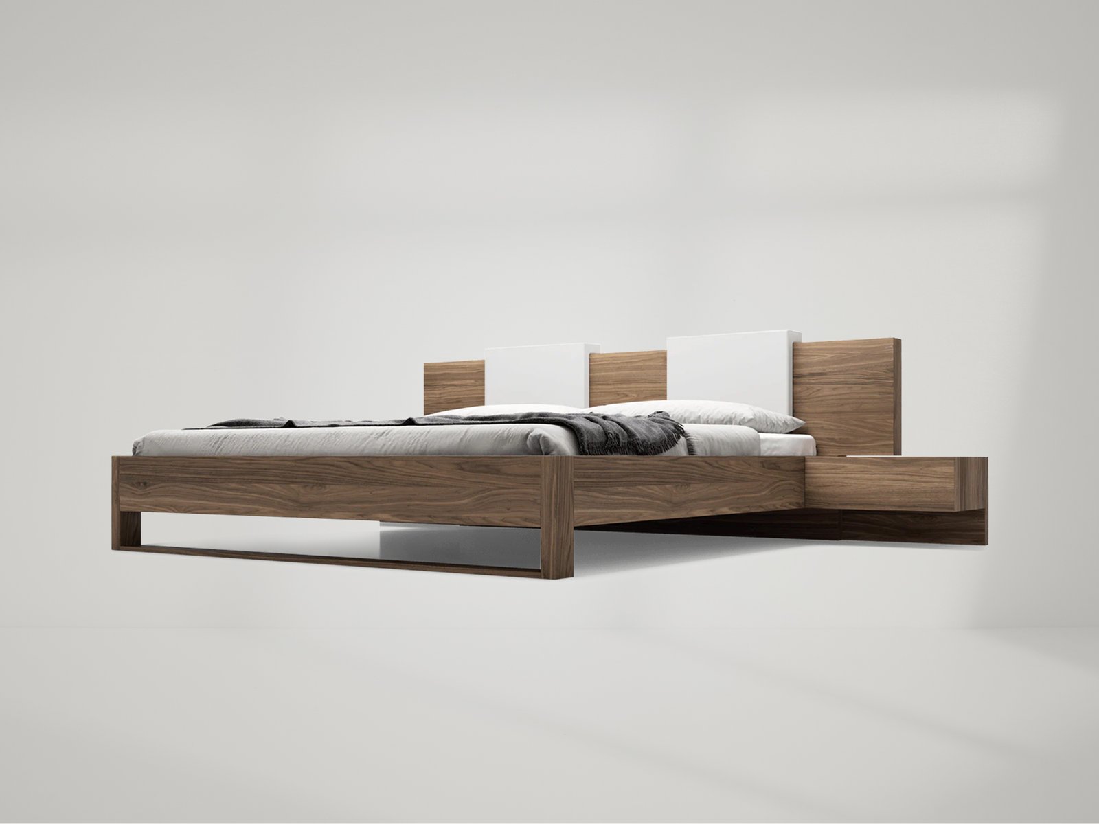 Both sleek and warm, the Monroe features an oversized, extended headboard overlapping two "floating" single-drawer nightstands which are seamlessly attached to the bed frame. Drawers feature full-extension, under mount, soft-closing drawer slides.