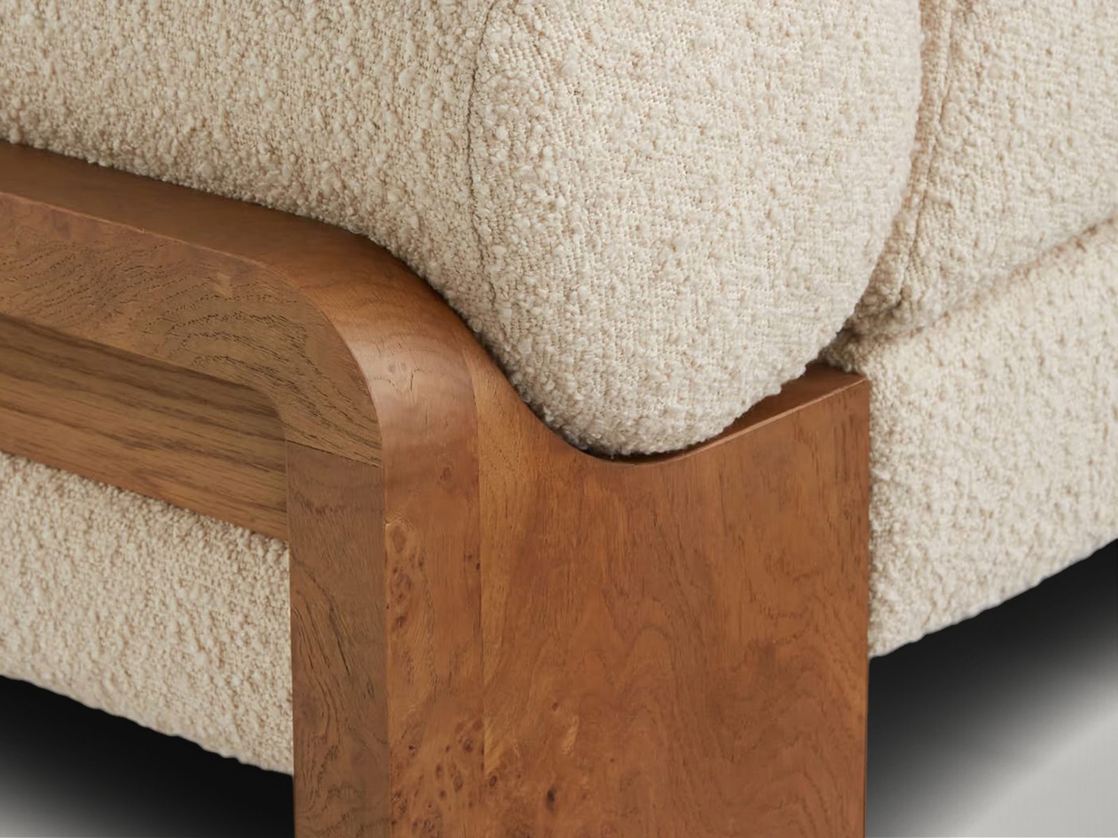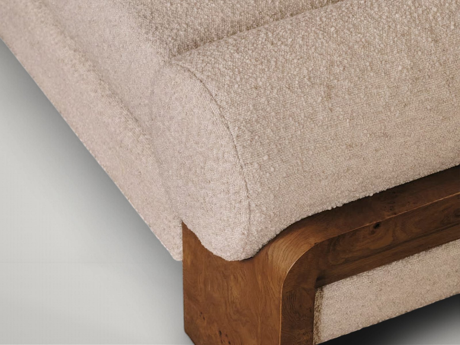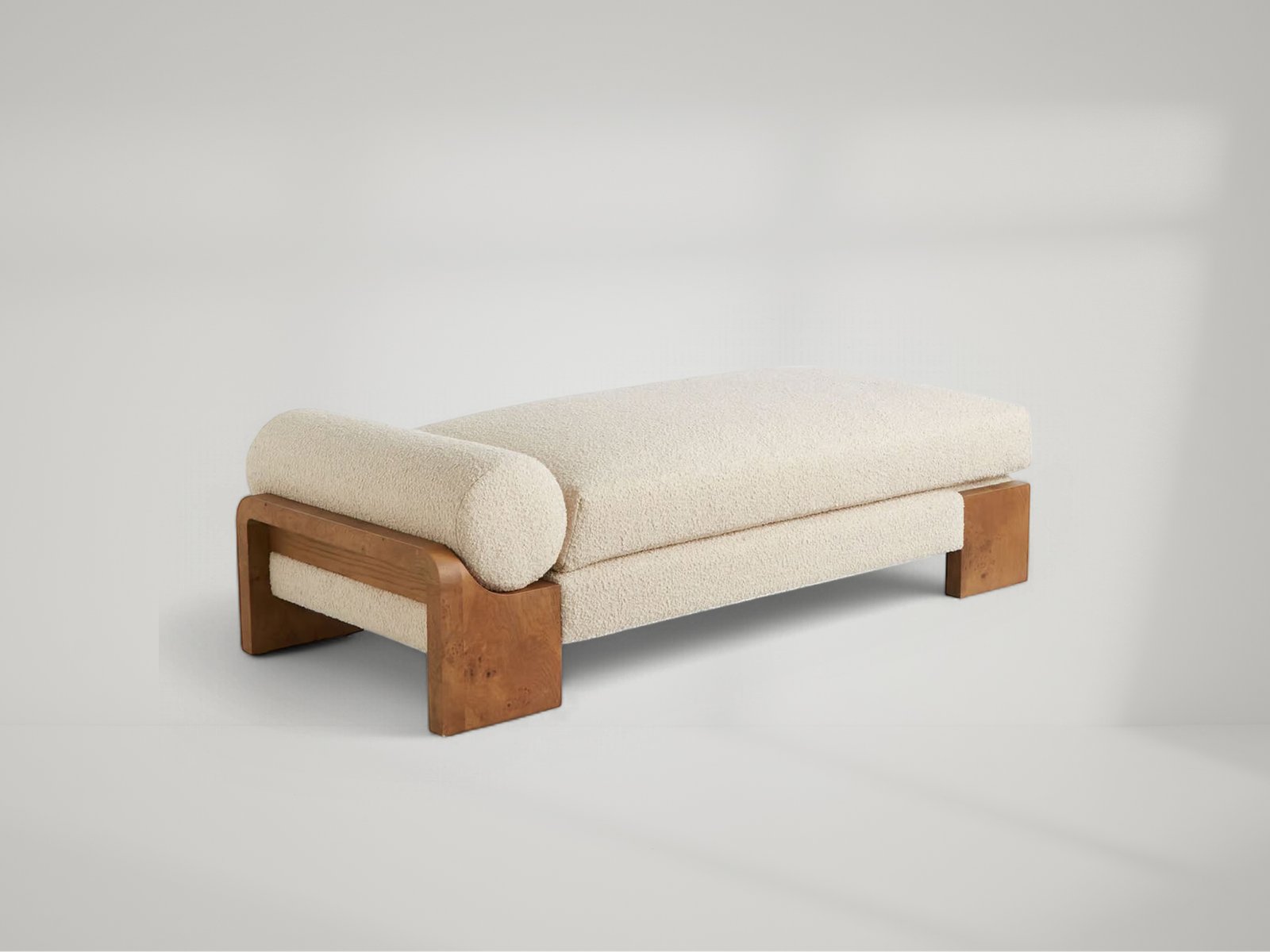 Tactile boucle upholstery blends with a mid-tone burl frame to create a space made for sitting or lounging. The Olivier daybed blends textural boucle upholstery with a veneered, mid-tone burl frame to echo the designs of 180 House. Its softly curved silhouette is designed to offer an additional spot for sitting or lounging in a study, open living space or in the corner of a room to create a cosy nook.