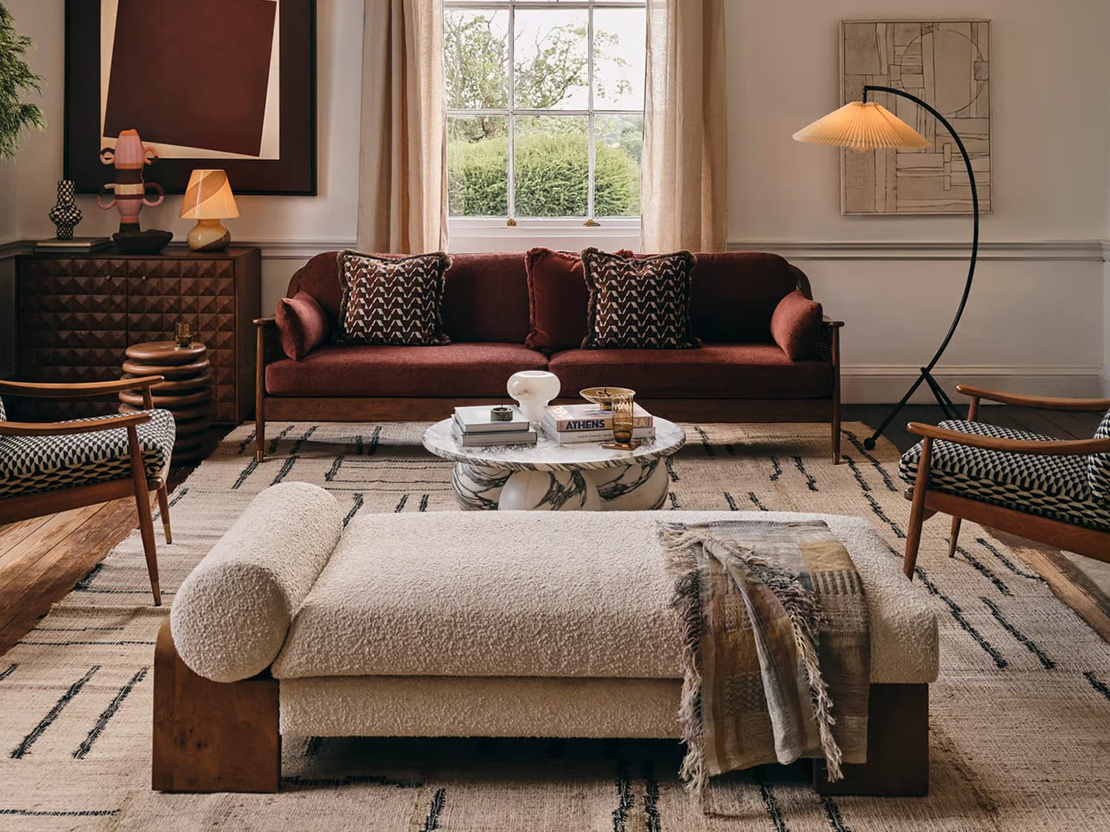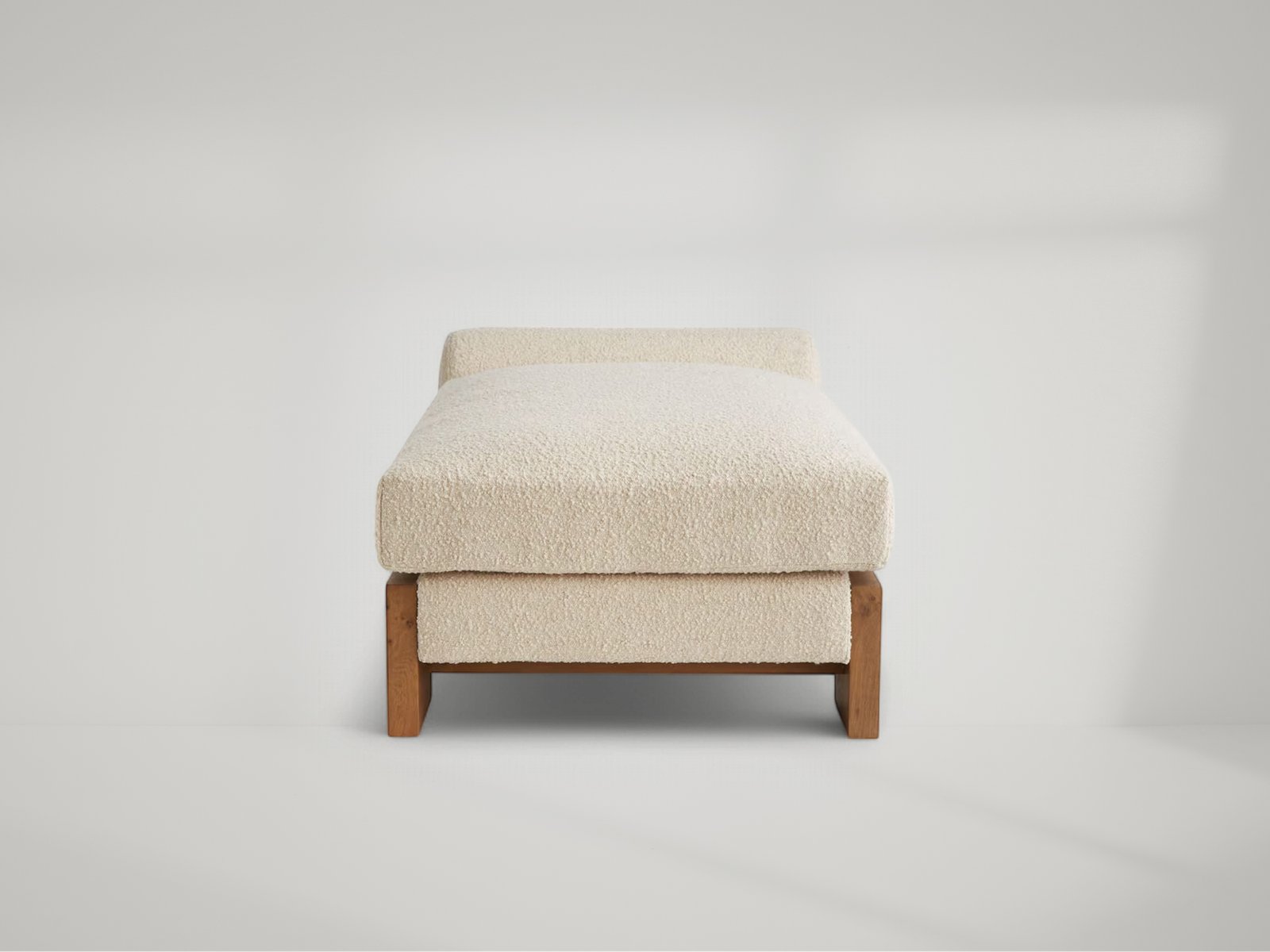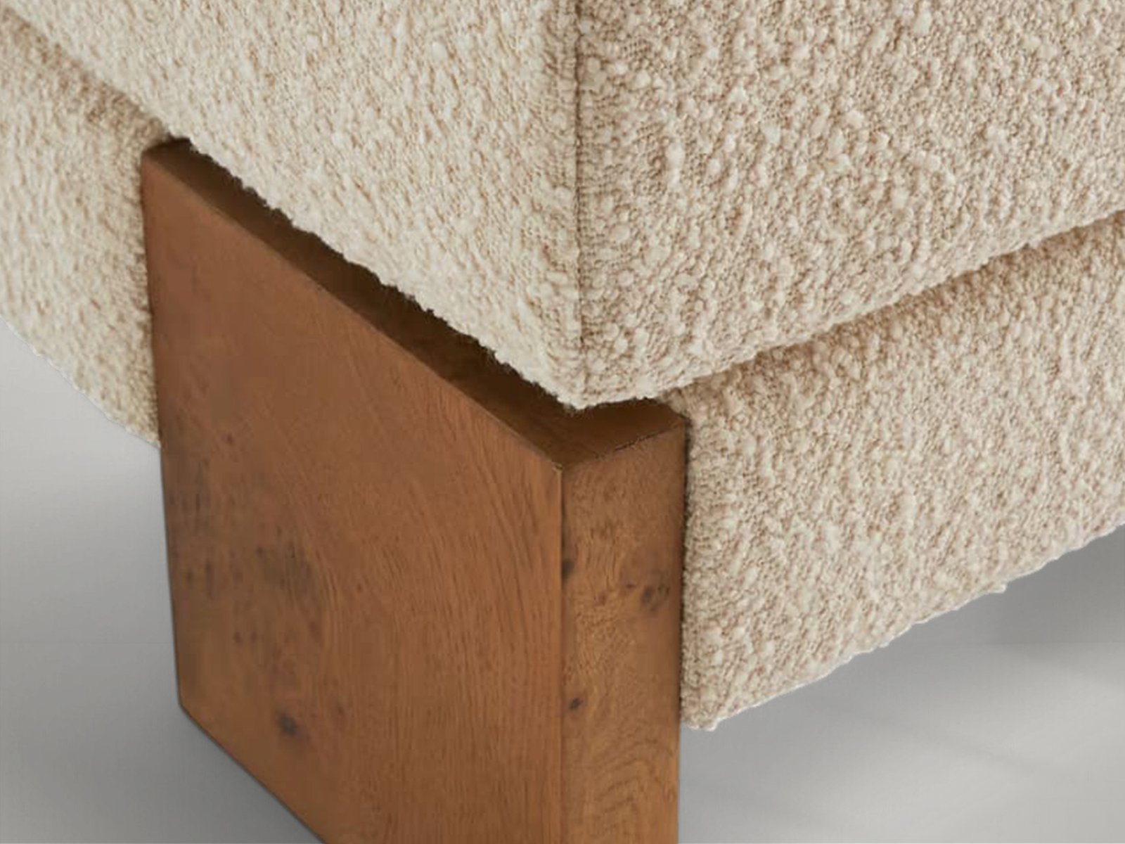 Tactile boucle upholstery blends with a mid-tone burl frame to create a space made for sitting or lounging. The Olivier daybed blends textural boucle upholstery with a veneered, mid-tone burl frame to echo the designs of 180 House. Its softly curved silhouette is designed to offer an additional spot for sitting or lounging in a study, open living space or in the corner of a room to create a cosy nook.