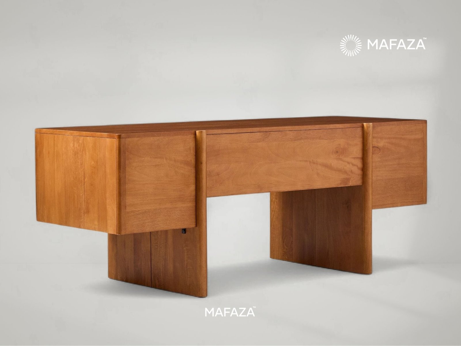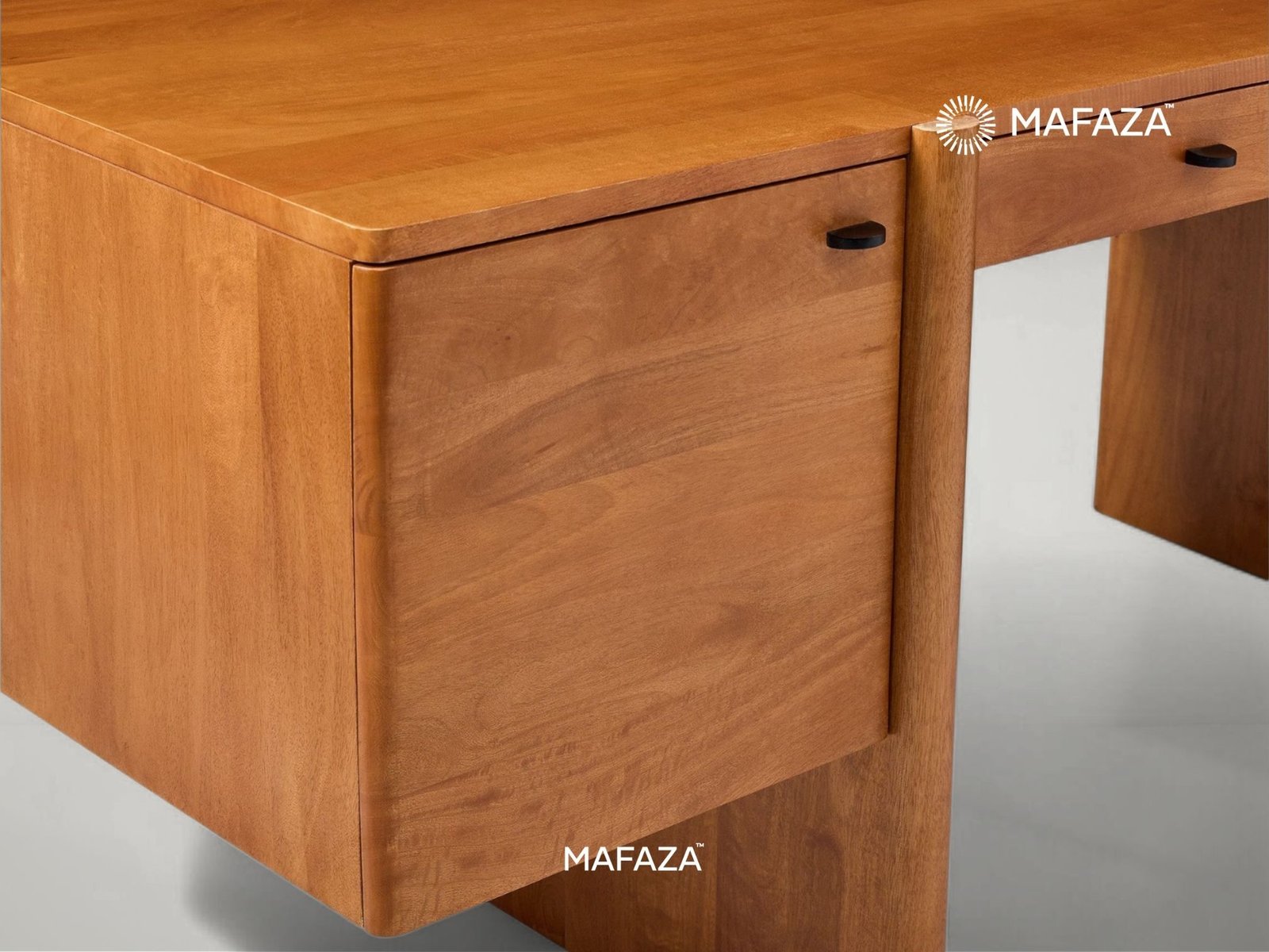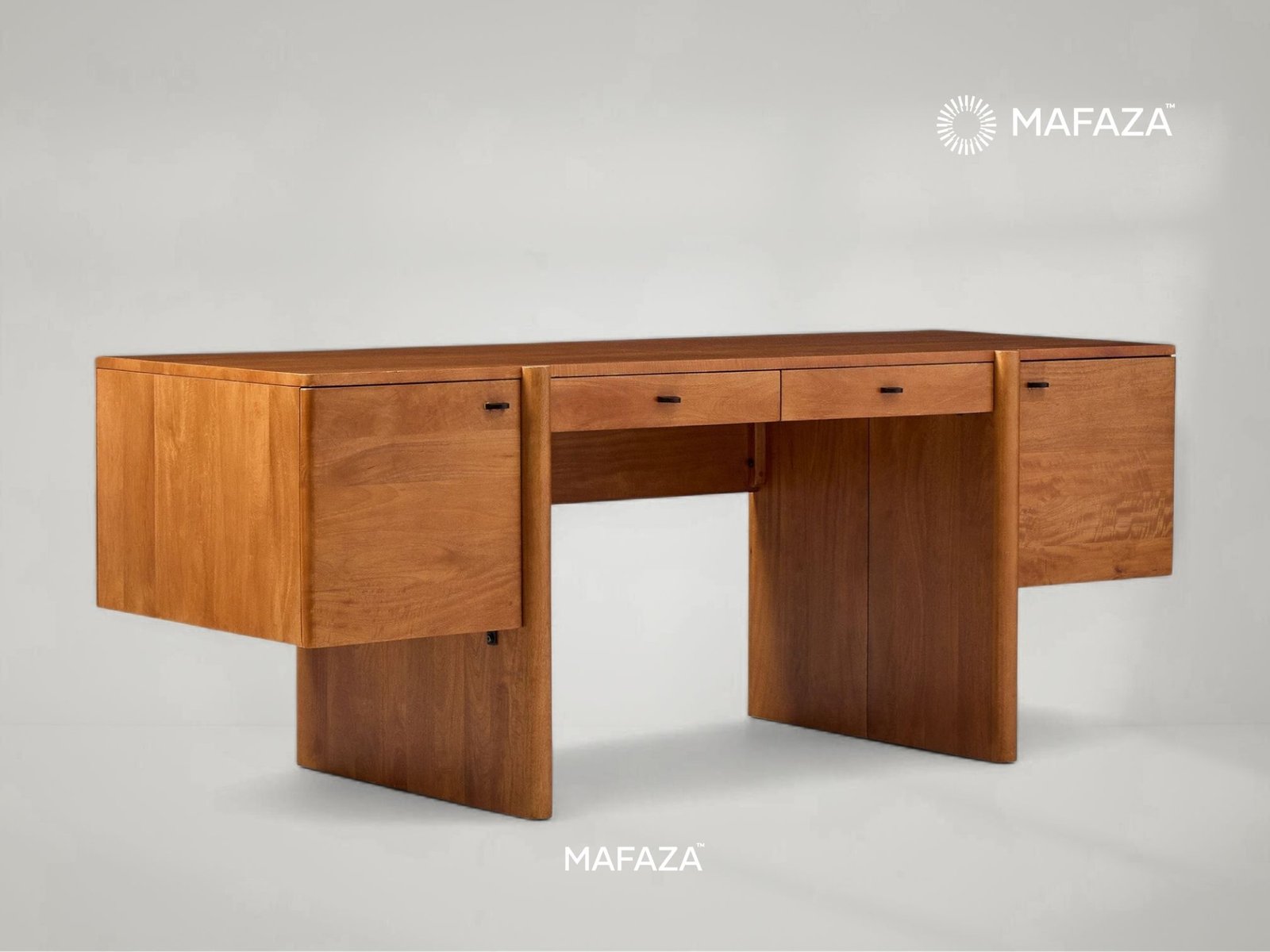 The Otto Executive Desk's striking teak design grabs attention. It combines strength, storage, and refinement with two hidden-door cabinets and two drawers, making it ideal for executives who place equal importance on design and productivity.
