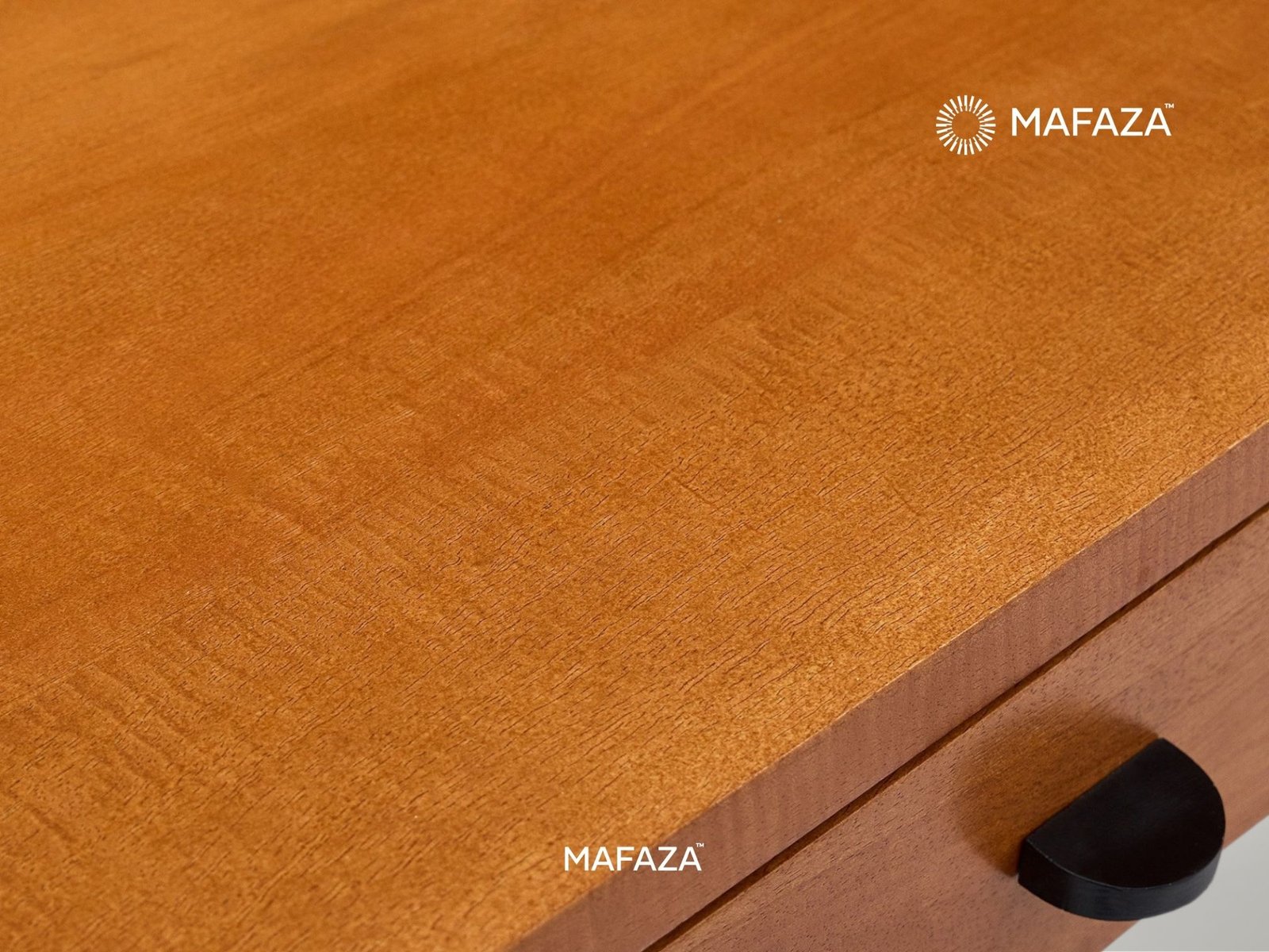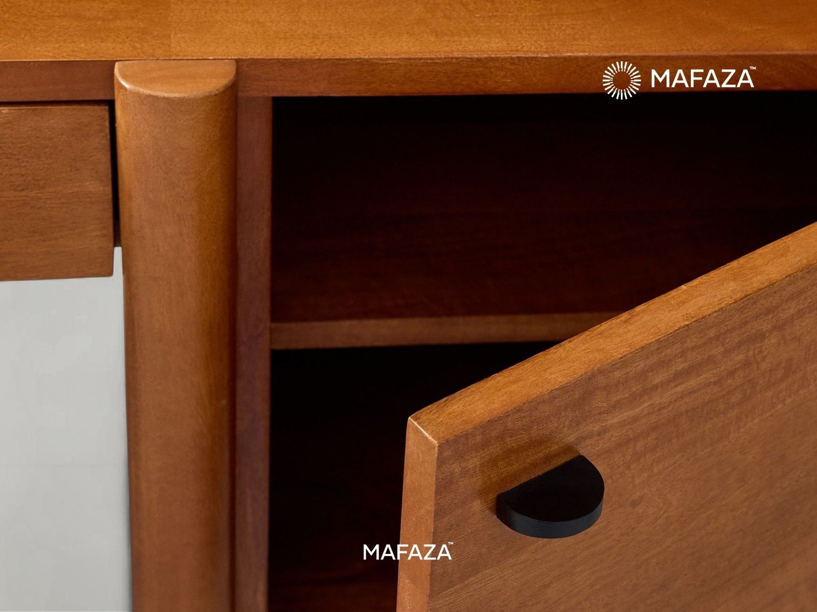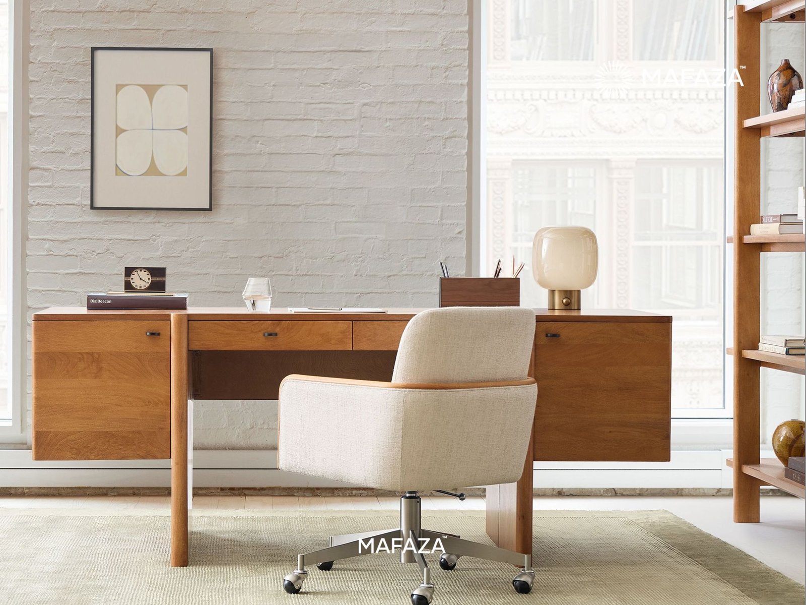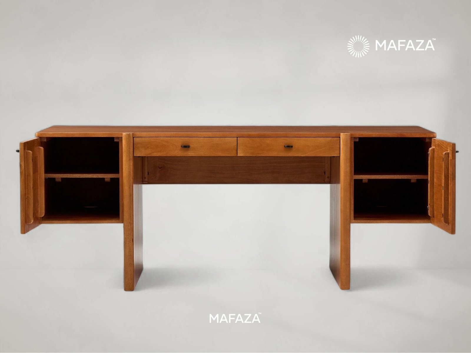 The Otto Executive Desk's striking teak design grabs attention. It combines strength, storage, and refinement with two hidden-door cabinets and two drawers, making it ideal for executives who place equal importance on design and productivity.