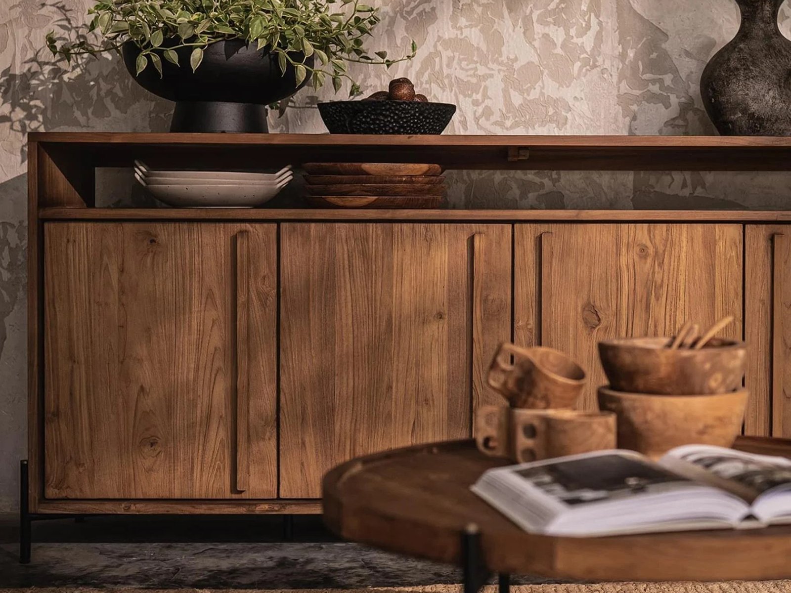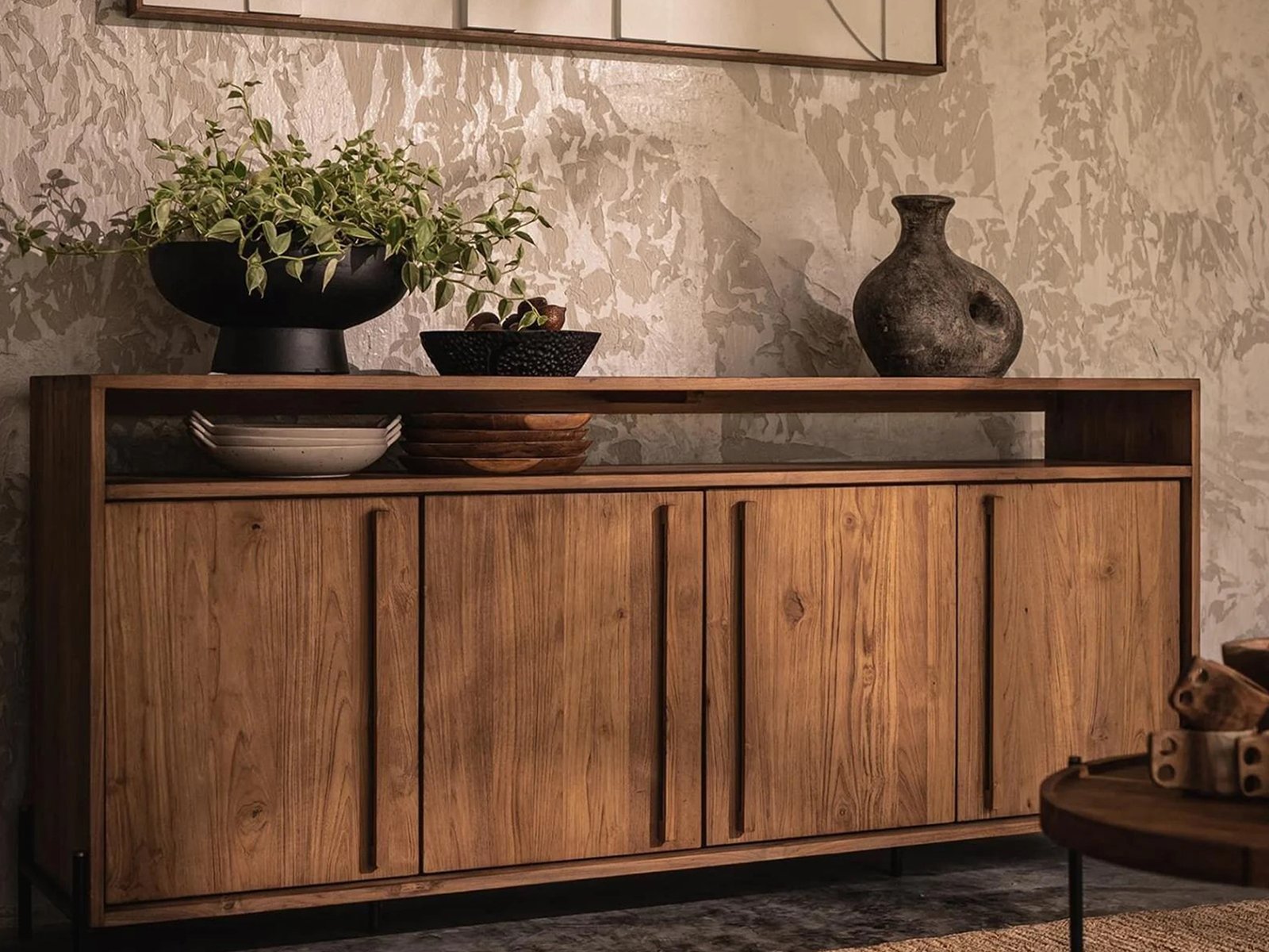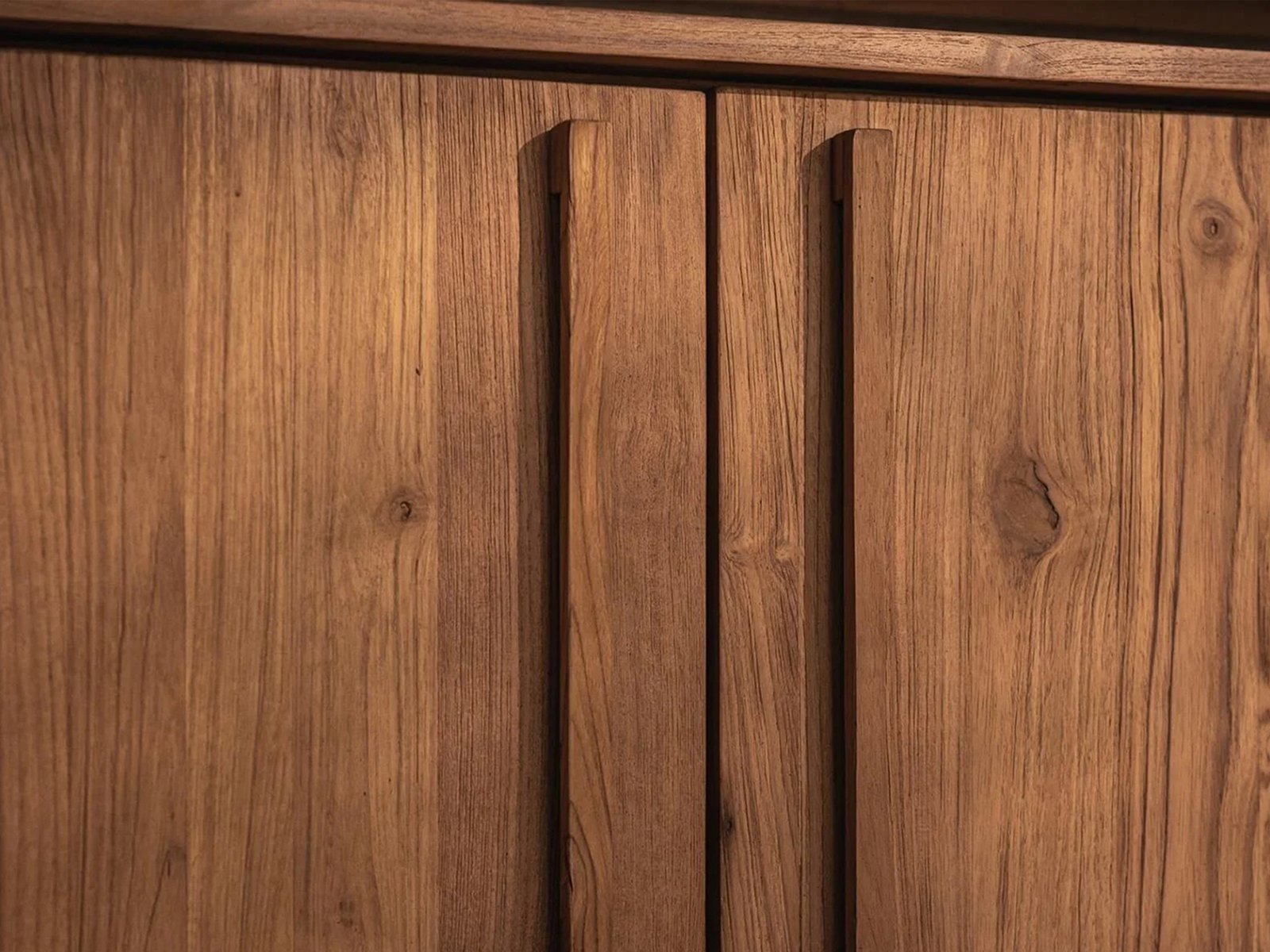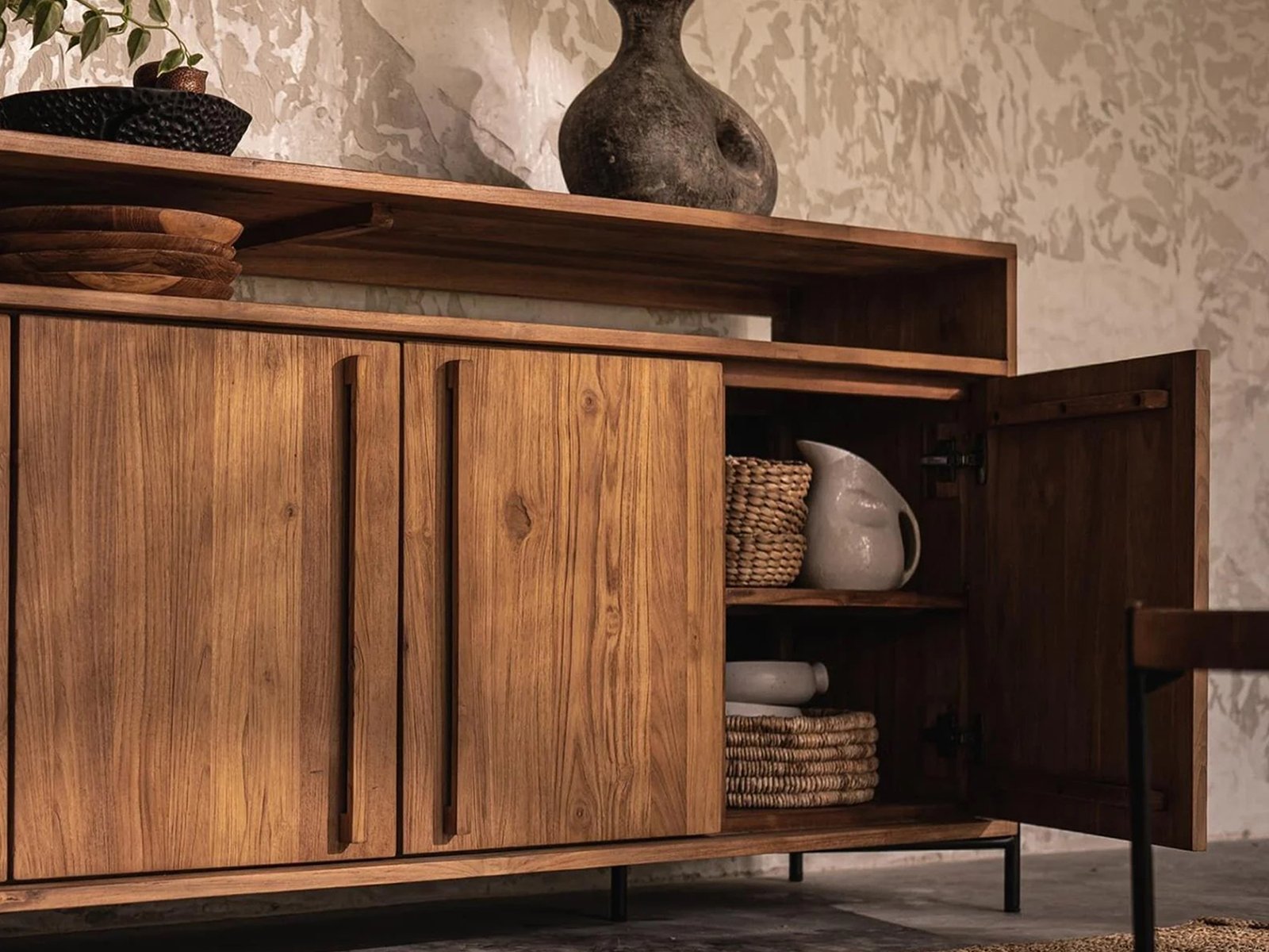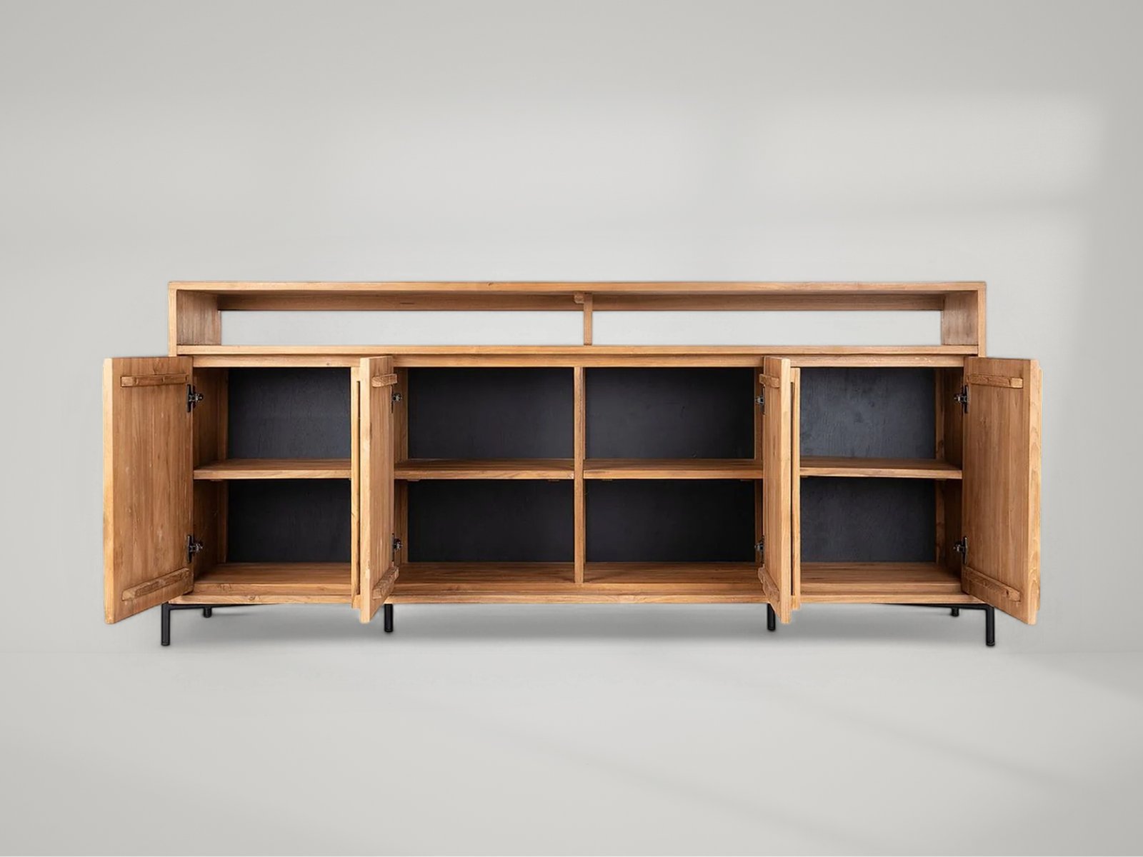 Dresser with its clean-lined silhouette and impressive woodwork, the Outline Dresser is a rich piece of furniture that blends effortlessly into any room. The dresser is crafted from reclaimed teak wood and supported by iron legs. Having both closed compartments and open shelves, the storage and display options are endless.