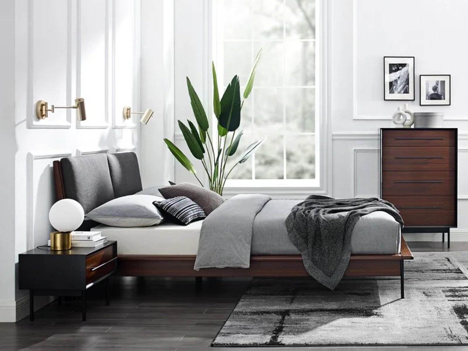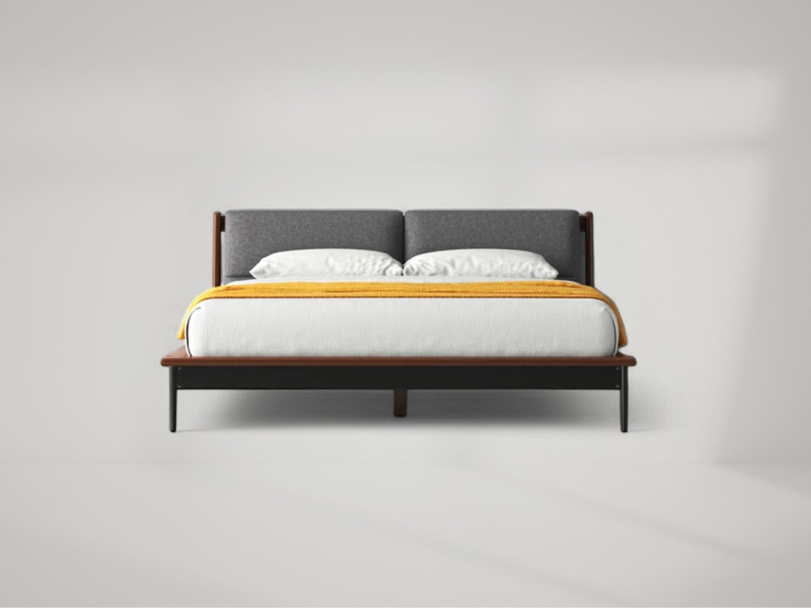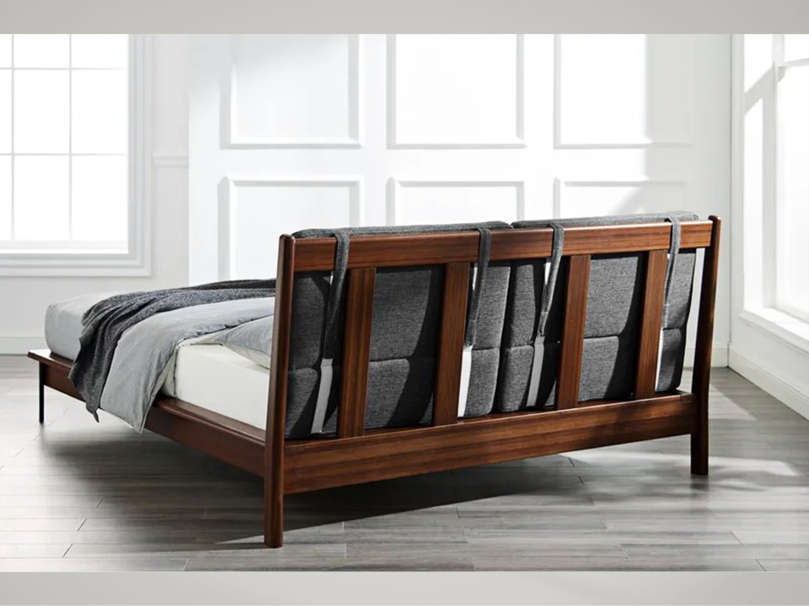 Fresh + function forward. Built from teak wood this platform bed frame’s crisp lines are accentuated by its two-tone gray and wood grain finish. Wide sideboards offer enough space to put your phone down, and the headboard’s removable cushions have washable covers.