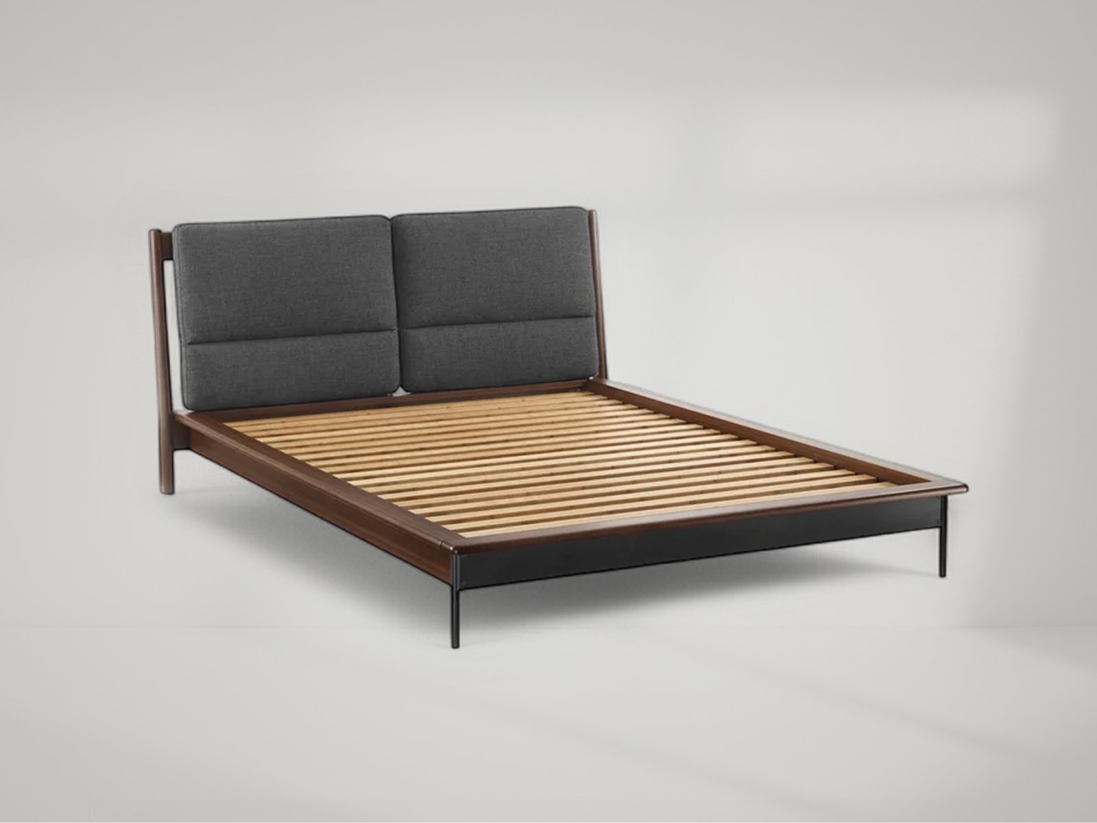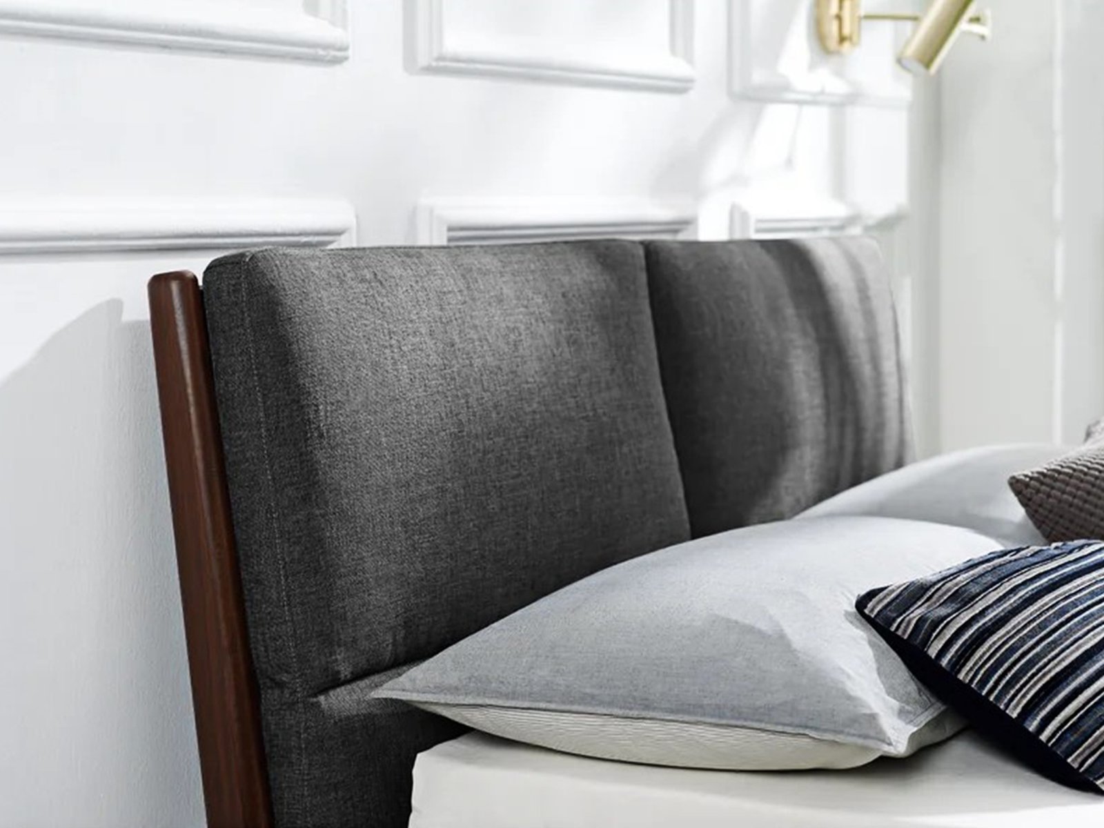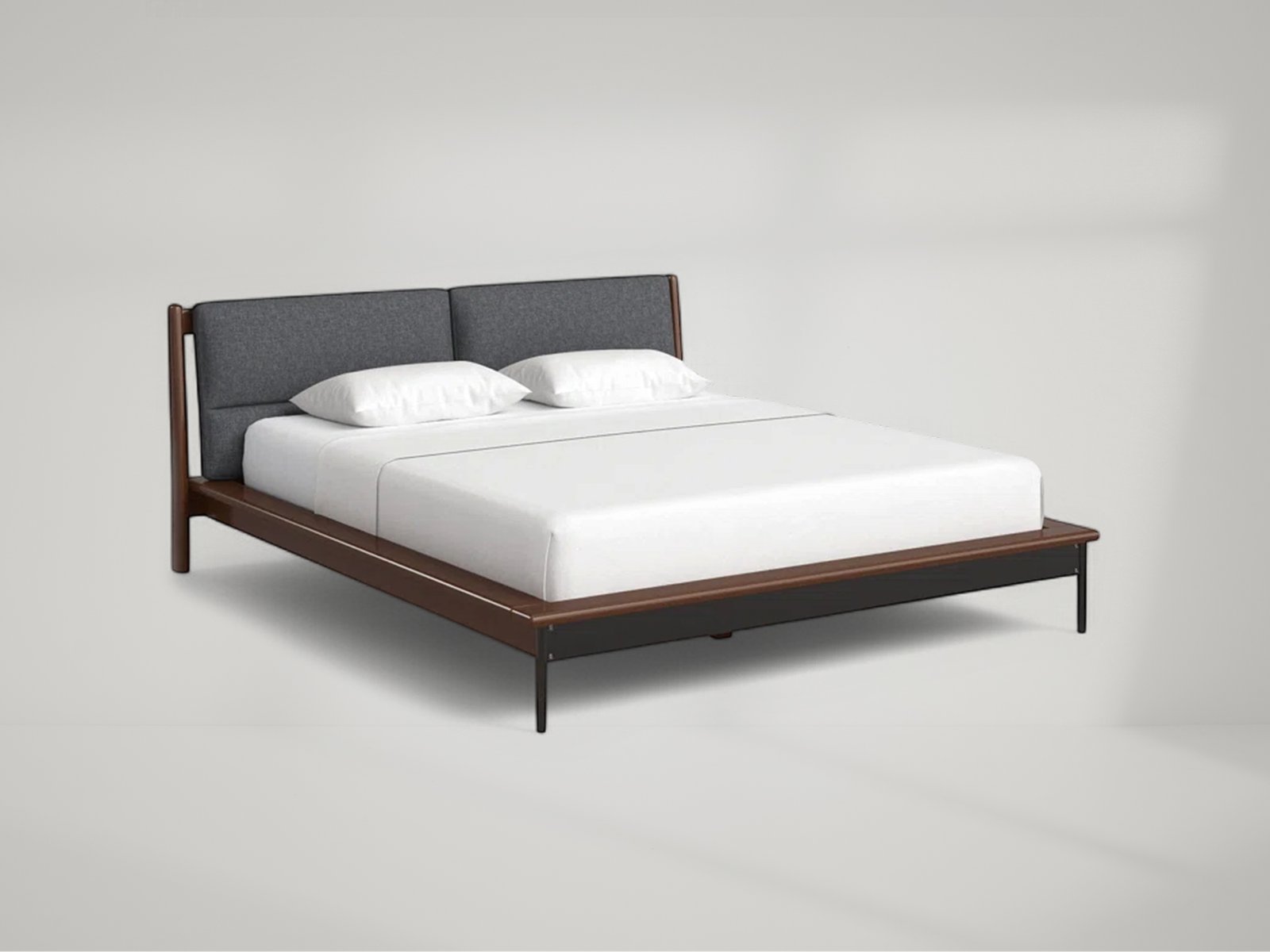 Fresh + function forward. Built from teak wood this platform bed frame’s crisp lines are accentuated by its two-tone gray and wood grain finish. Wide sideboards offer enough space to put your phone down, and the headboard’s removable cushions have washable covers.