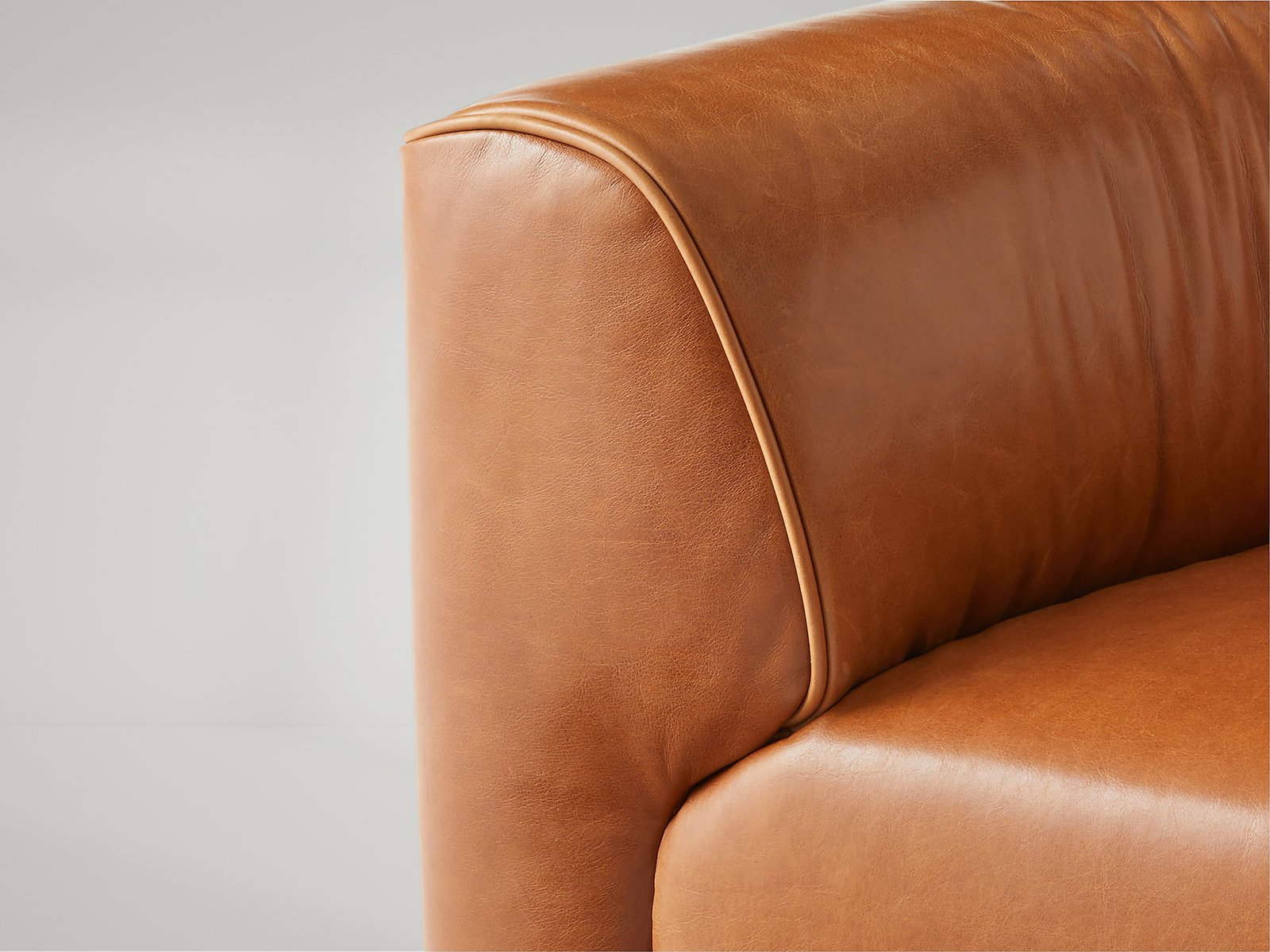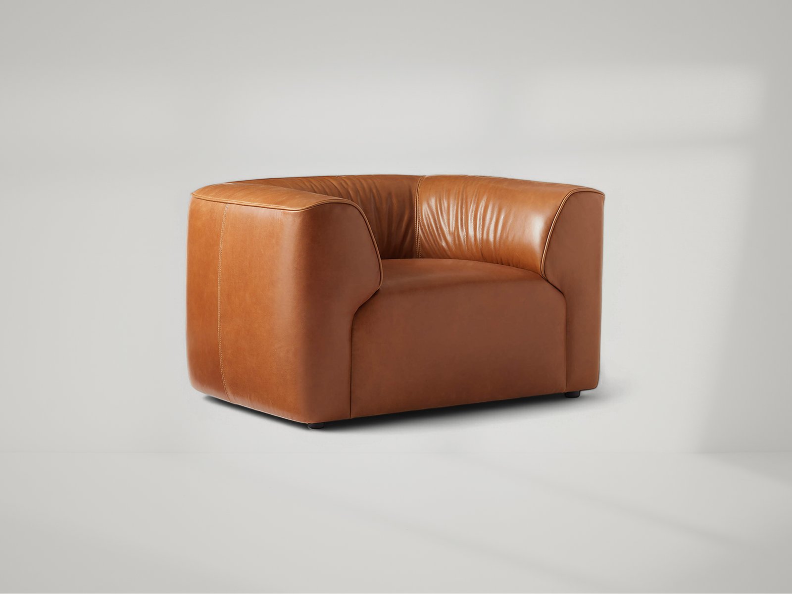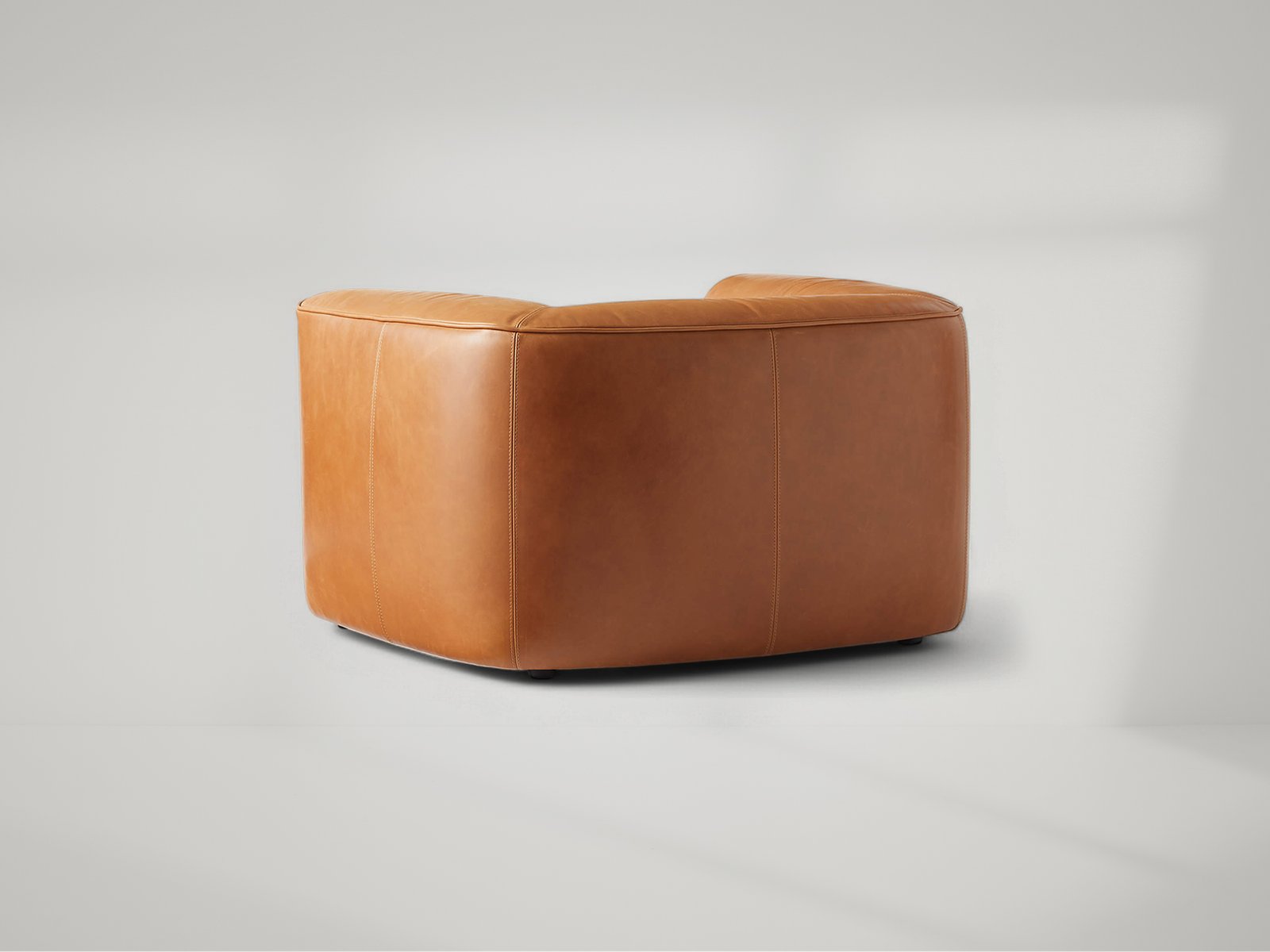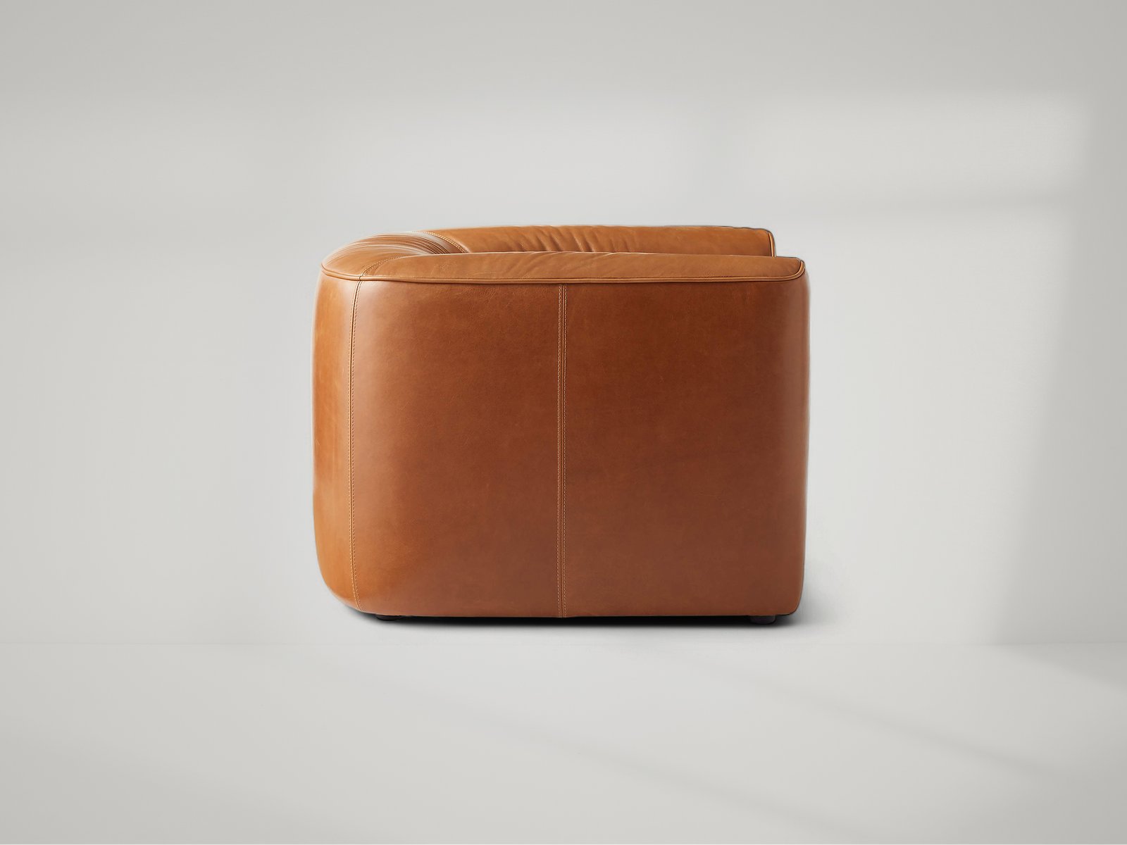 Low-slung leather chair by Studio ANANSI is a modern classic. Featuring a welt trim along the perimeter, the oversized frame is wrapped in synthetic leather with a delicate ruched detail. Crafted by a third generation tannery, the hand-stained leather upholstery is individually selected for its inherent markings and characteristics for a naturally worn-in aesthetic.