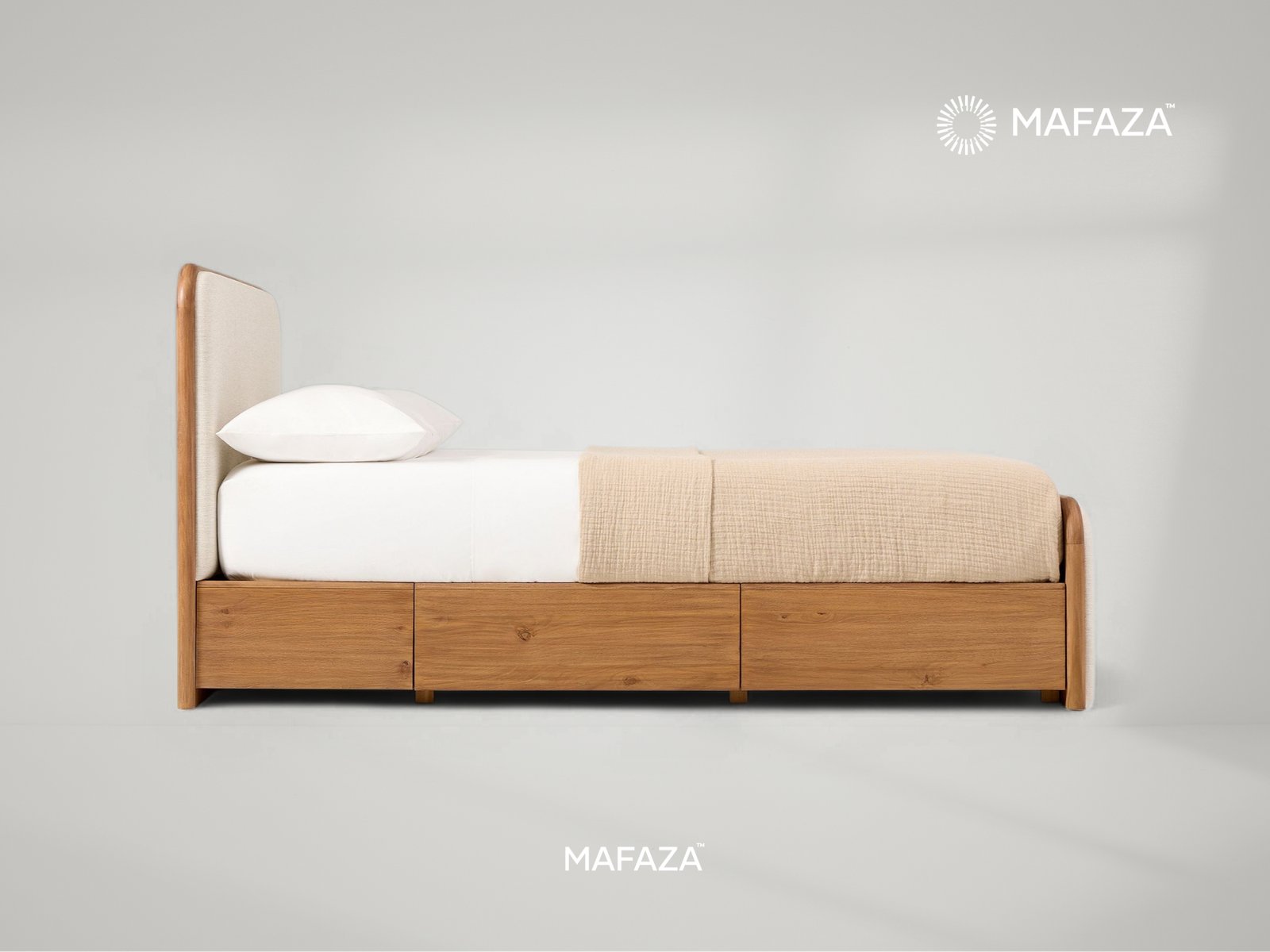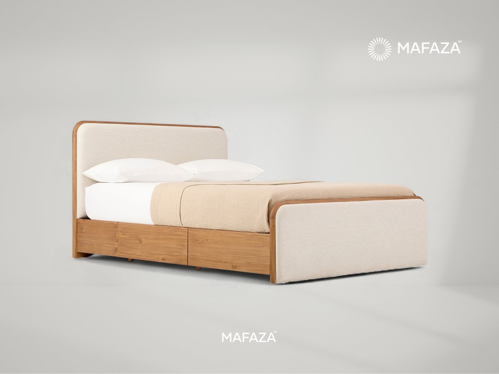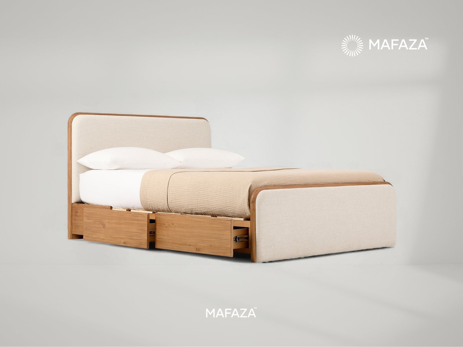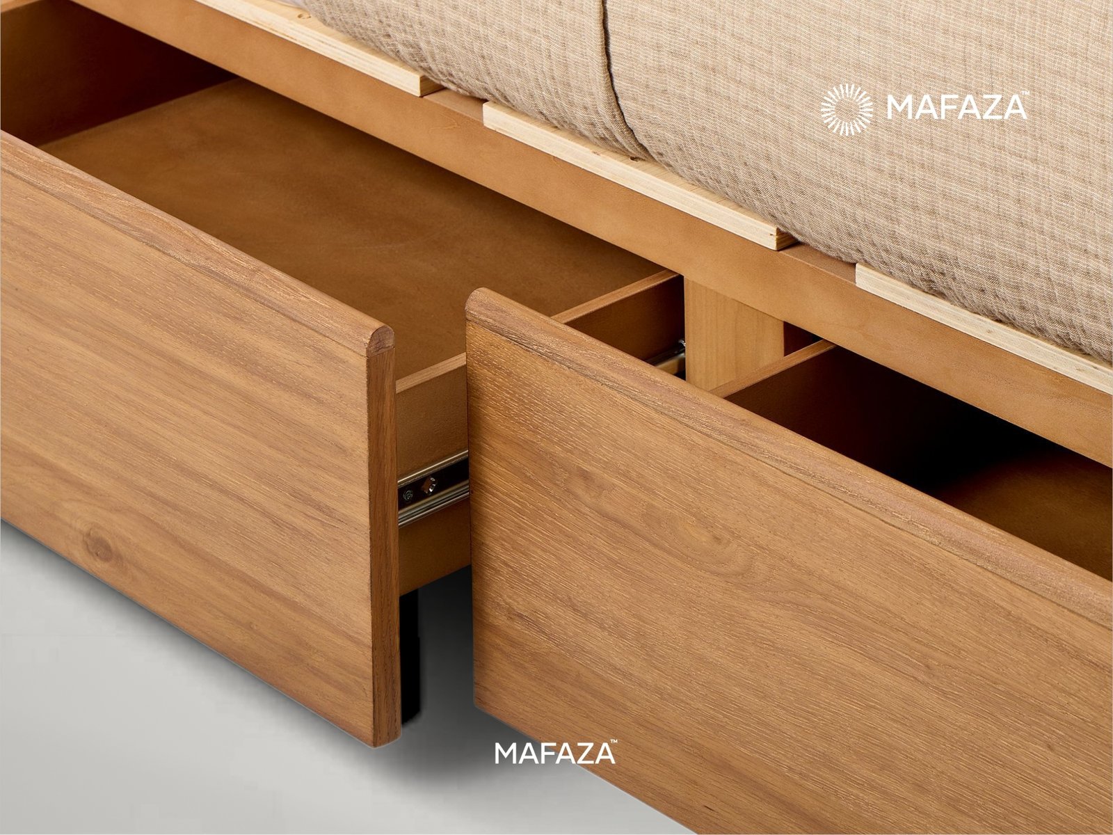 The Selm Storage Bed Frame is designed for those who value both elegance and practicality. Resting on a foundation of certified teak wood, its upholstered form brings softness and warmth, while four spacious drawers, two on each side, offer discreet storage for linens, essentials, or seasonal items. The clean lines and natural wood accents ensure it blends seamlessly into modern interiors, turning everyday living into an experience of refined comfort. Built to last, Selm is more than a bed, it’s a smart solution for stylish and organized living.