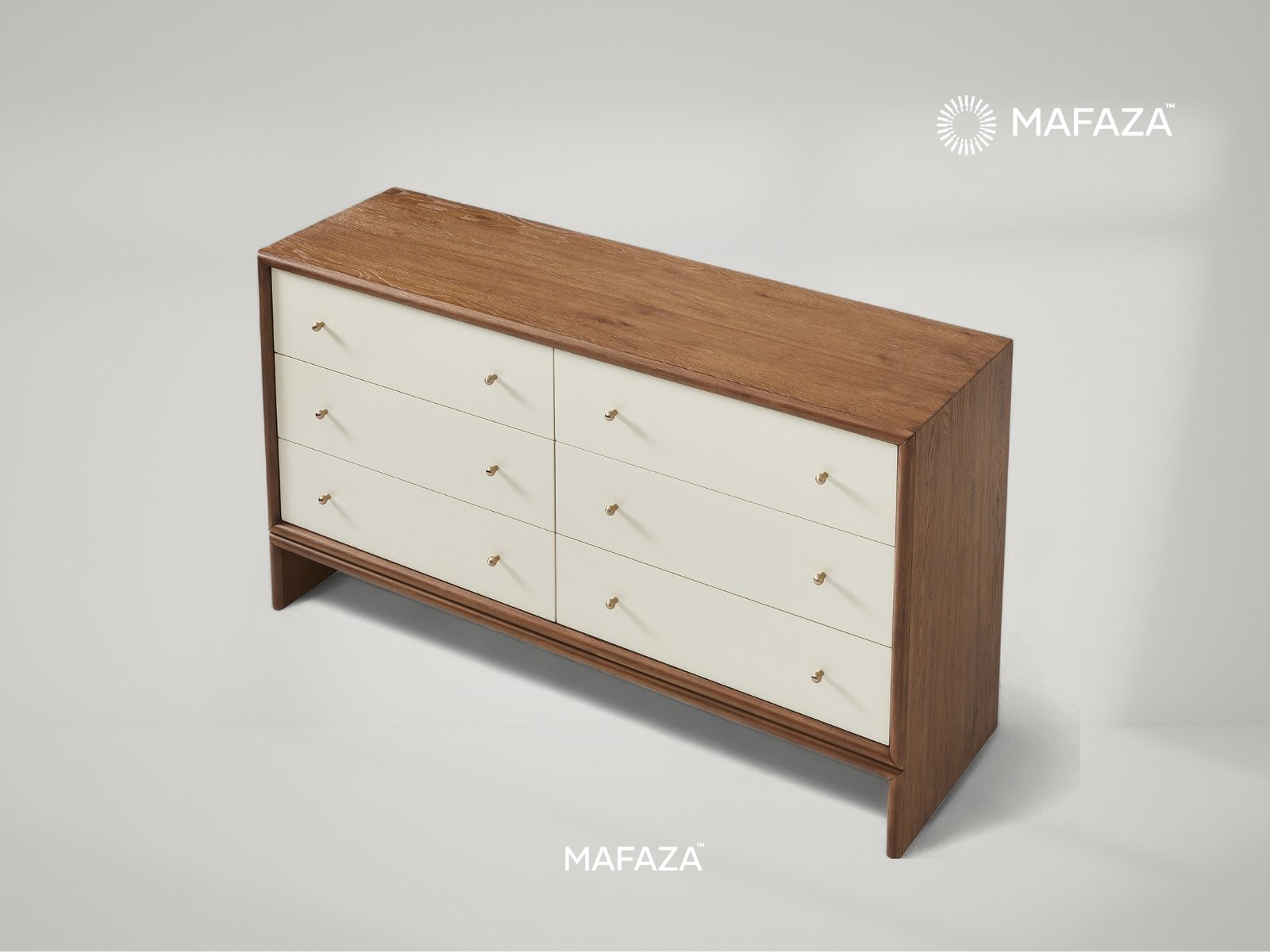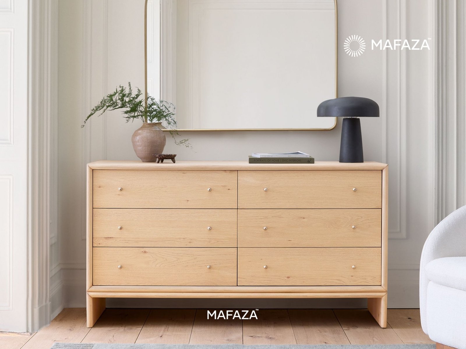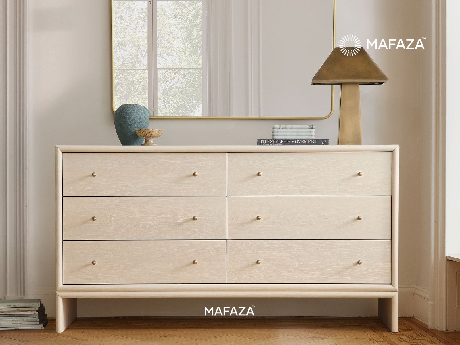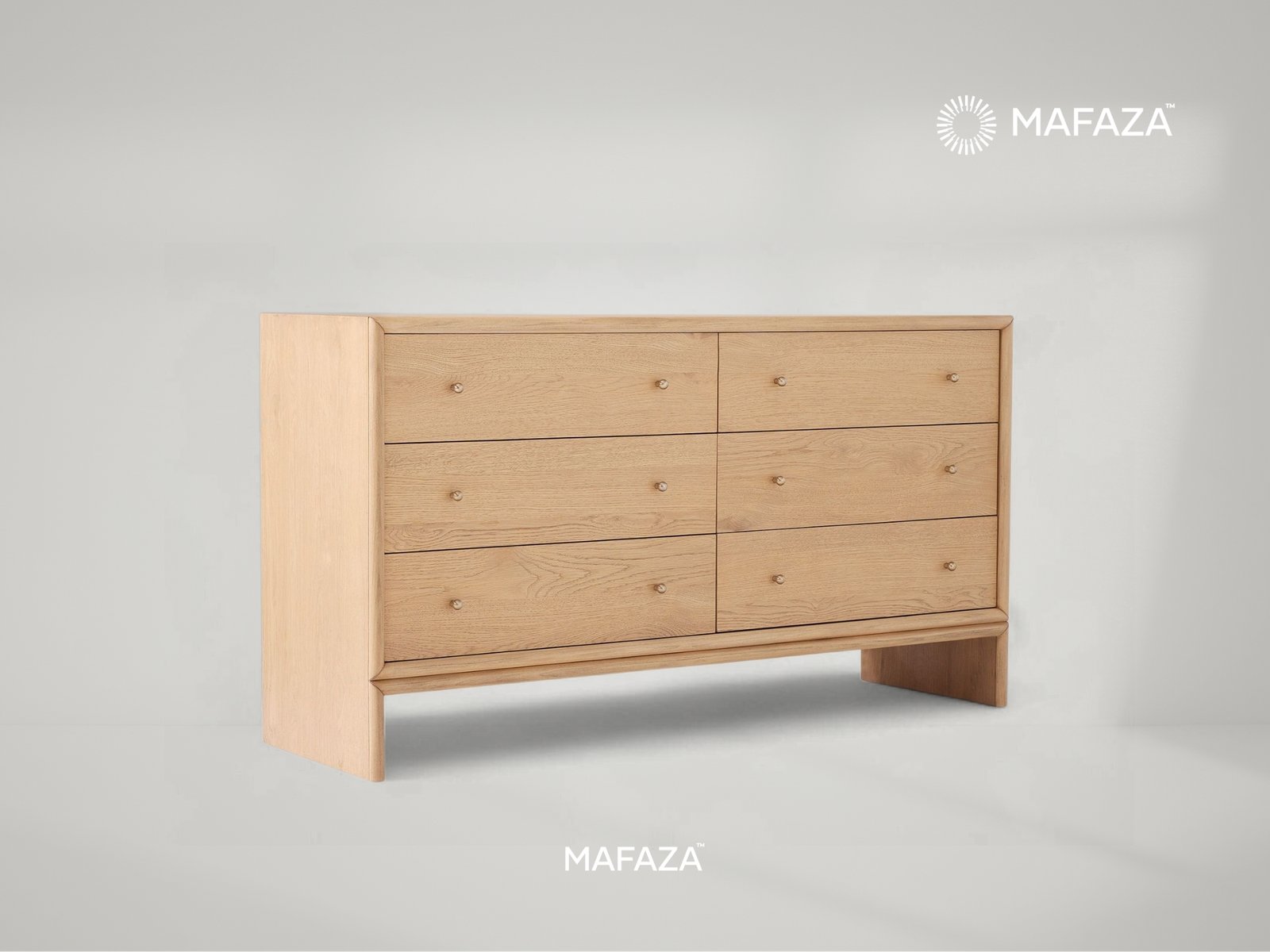 The Selm 6-Drawers Dresser, made from certified teak wood, adds classic warmth and usefulness to your living area. Every drawer slides easily, providing plenty of space for daily necessities while keeping a simple, uncluttered appearance. A welcoming sense of equilibrium is created by its rounded edges and organic grain patterns, which combine quiet sophistication with expert craftsmanship.