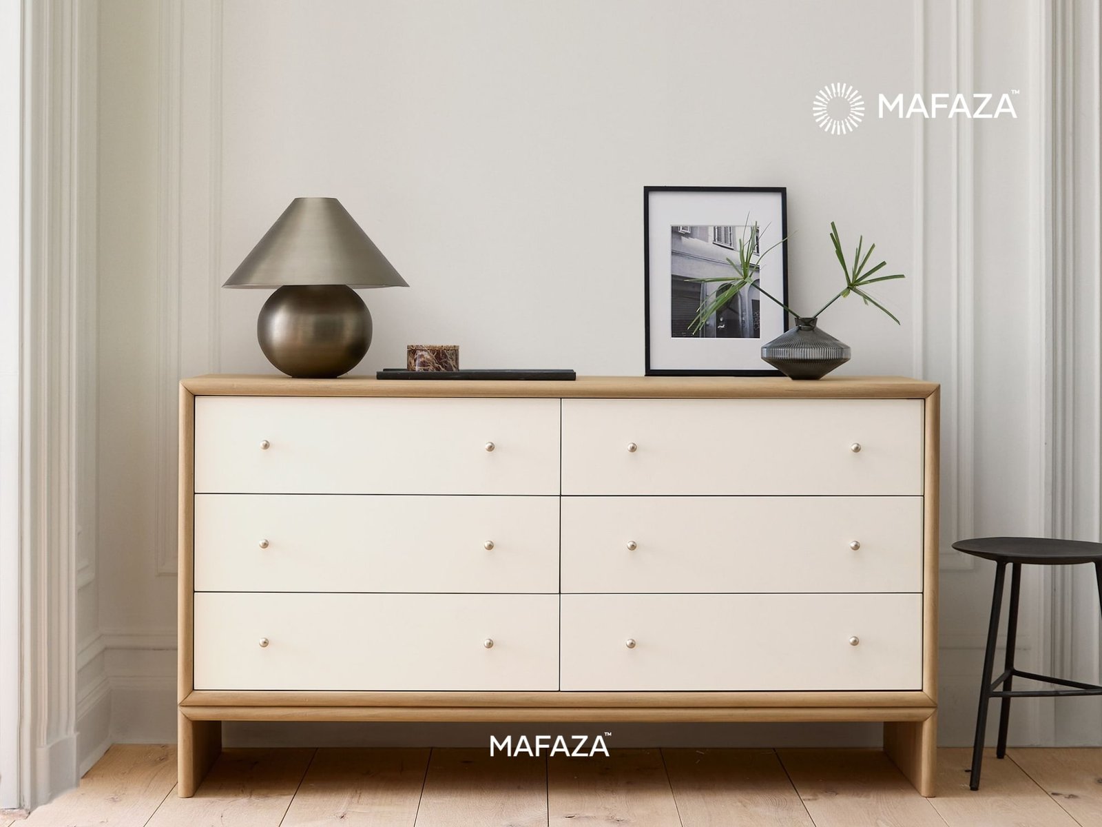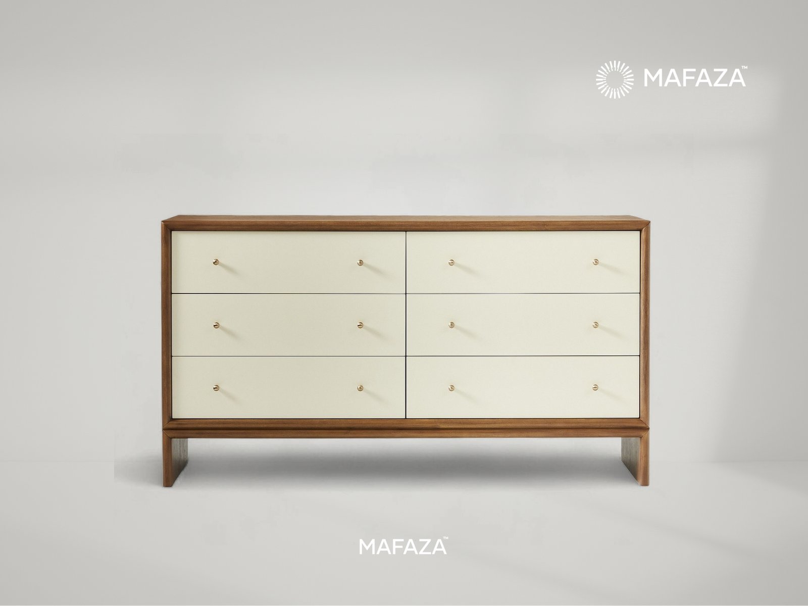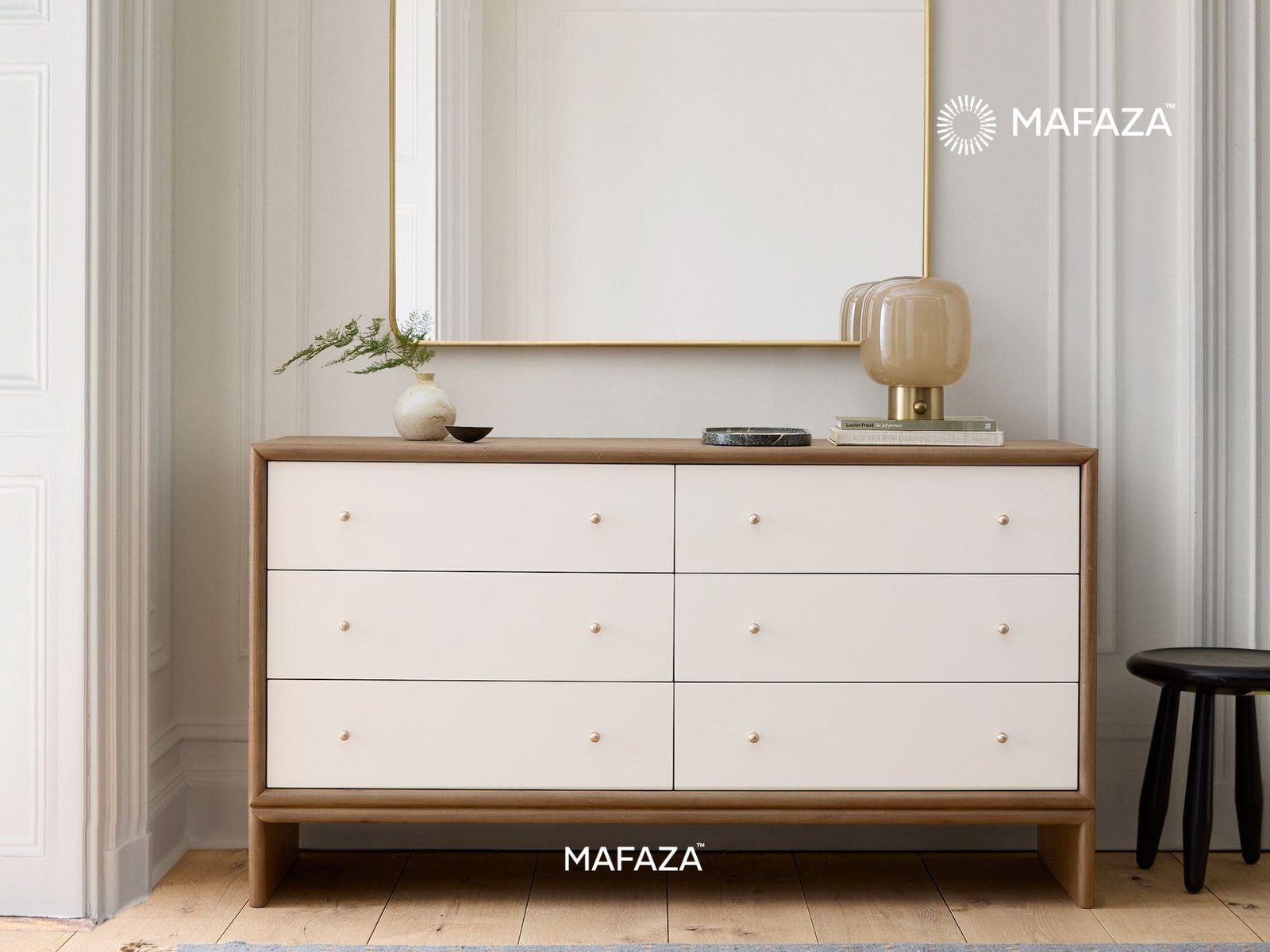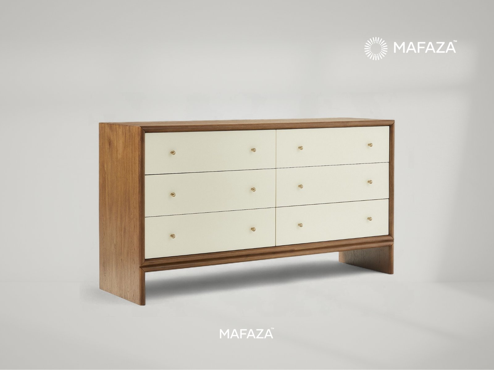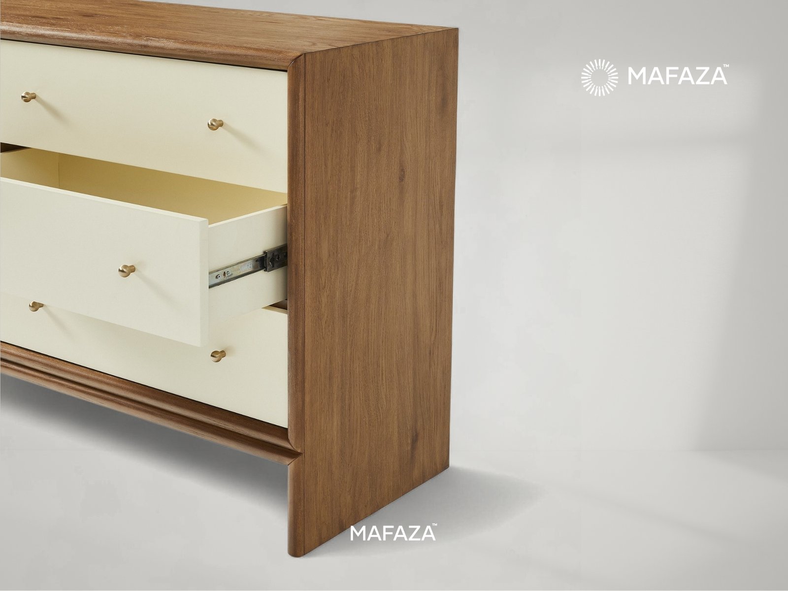 The Selm 6-Drawers Dresser, made from certified teak wood, adds classic warmth and usefulness to your living area. Every drawer slides easily, providing plenty of space for daily necessities while keeping a simple, uncluttered appearance. A welcoming sense of equilibrium is created by its rounded edges and organic grain patterns, which combine quiet sophistication with expert craftsmanship.
