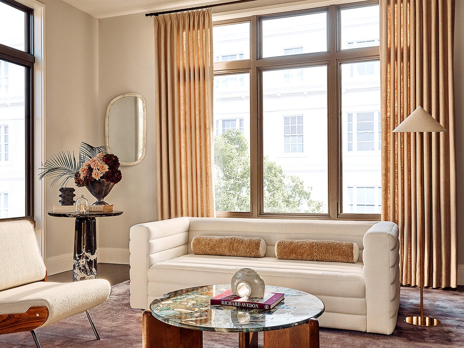 Designed by Mermelada Estudio, vintage '70s-inspired sofa is upholstered in a textured performance fabric with plush channel tufting on all sides.