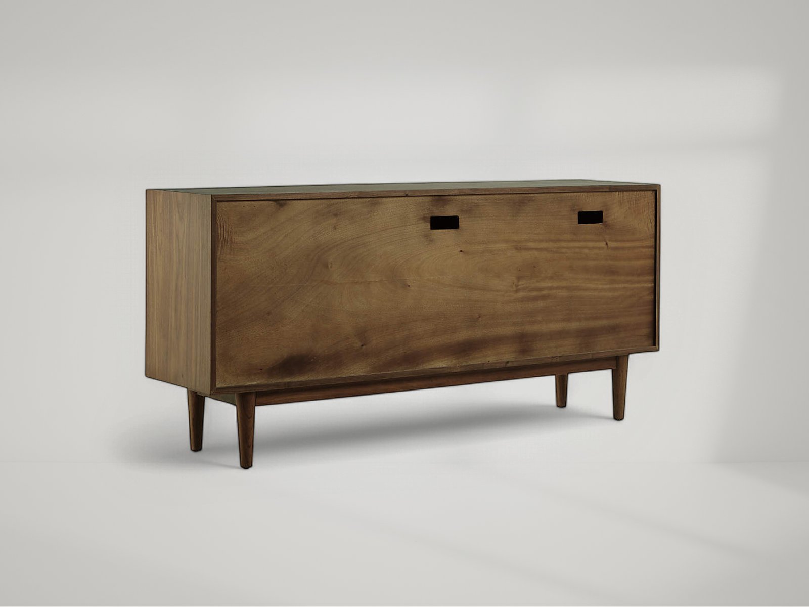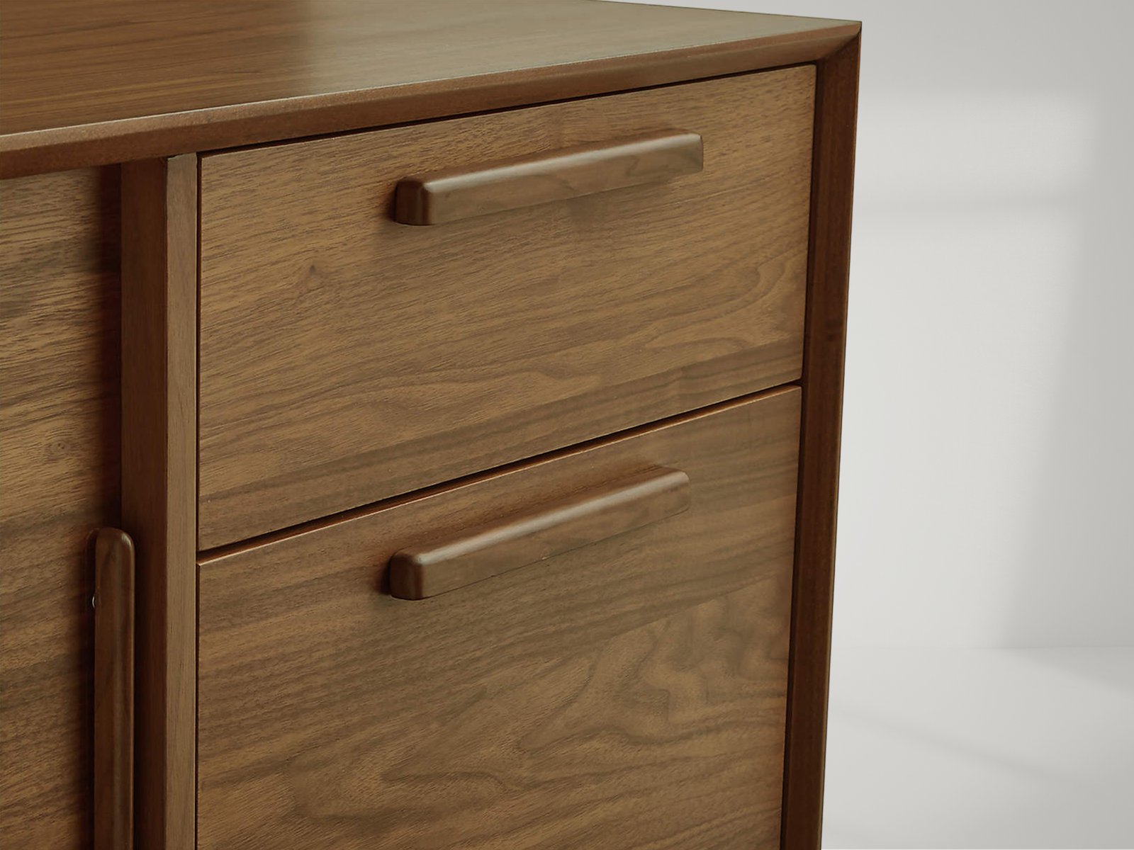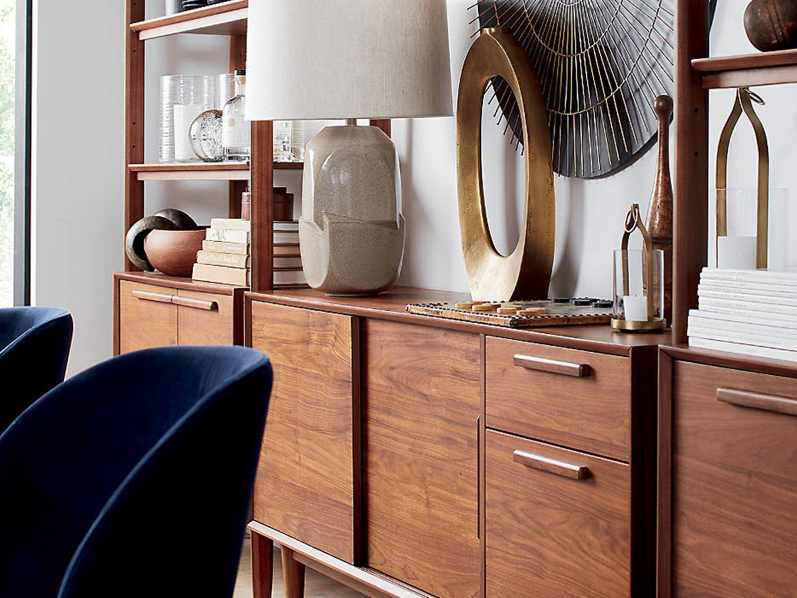 Our 1960s-inspired Tate credenza recalls the timelessness of mid-century design with a tailored profile and streamlined shape that works well in any room. Doubling as a media console, the credenza offers plenty of storage space on shelves behind smoothly sliding drawers, while the drawers accommodate everything from remotes to files to table linens. Crafted of teak wood and walnut finish, this multipurpose piece epitomizes the clean, architectural lines of modern design. Slim, conical legs taper slightly, elegantly elevating the credenza's seamless door and drawer fronts. Linear undercut pulls add horizontal counterpoint to Tate's beautiful proportions. Designed by Blake Tovin.