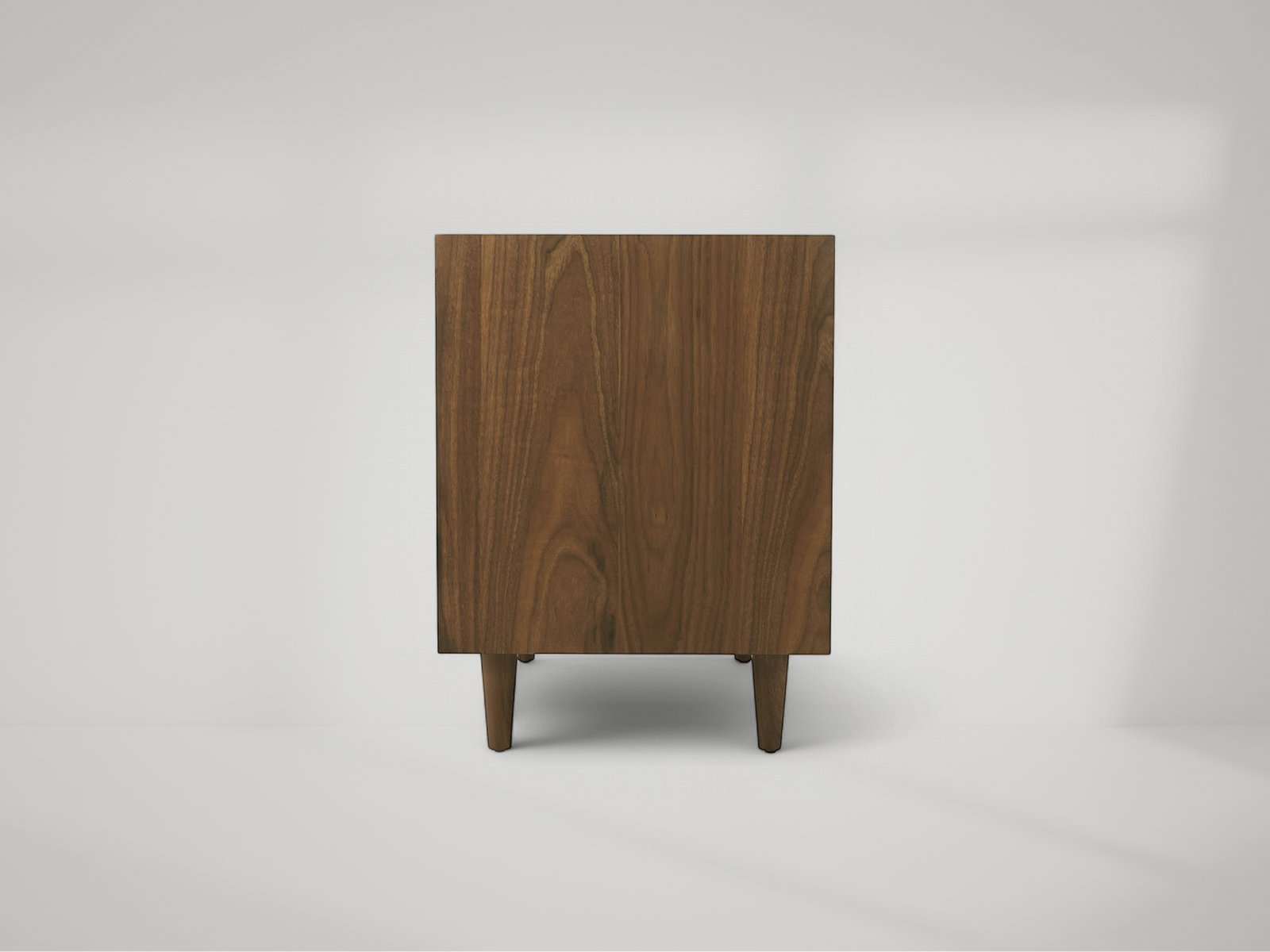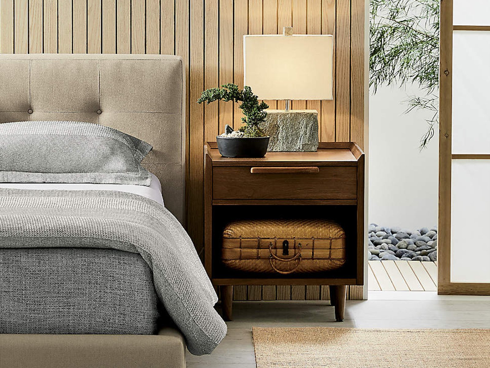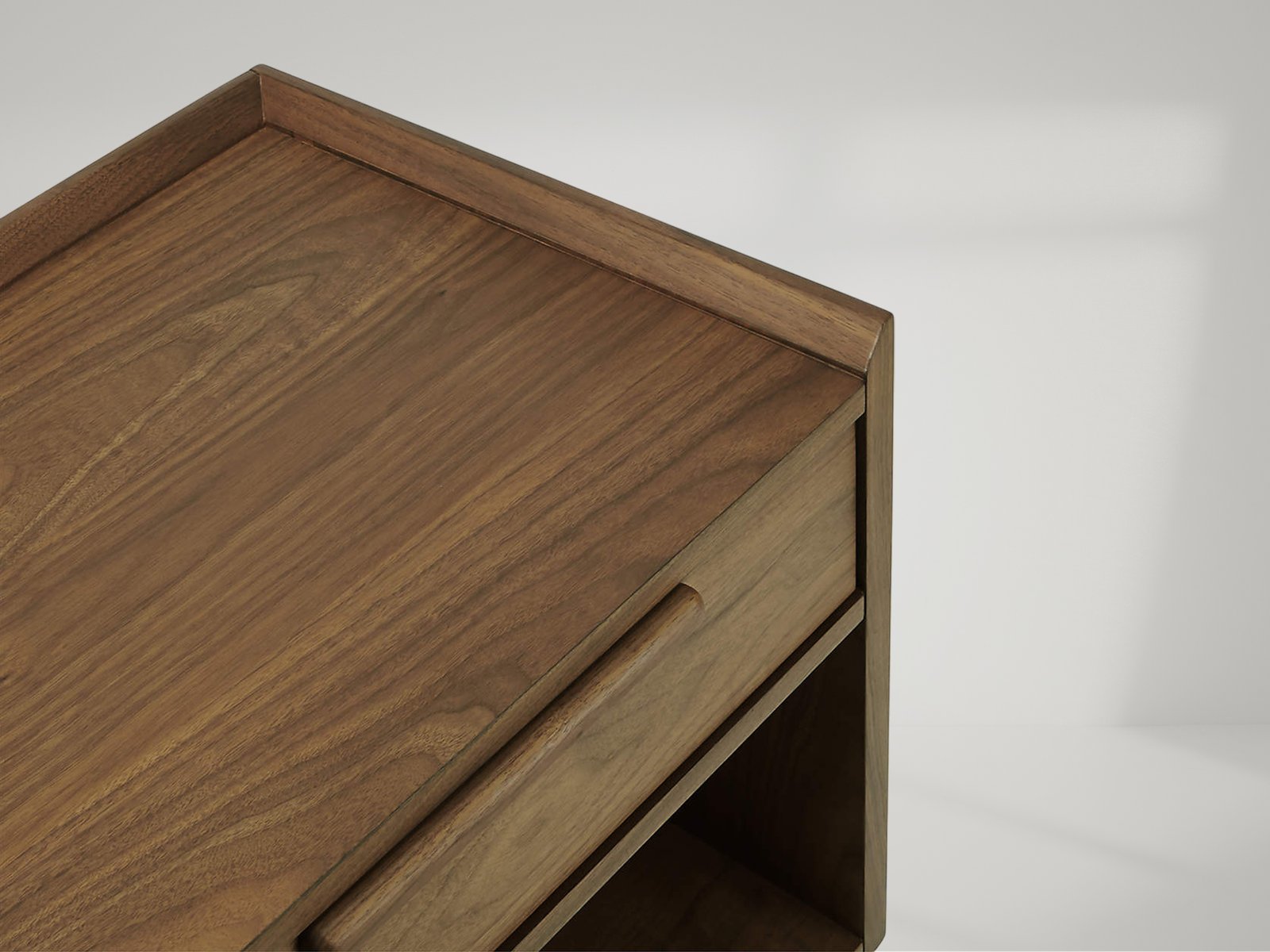 Our 1960s-inspired Tate collection recalls the timelessness of mid-century design with tailored profiles and streamlined shapes. Crafted of teak wood and walnut finish, Tate showcases gallery fronts and linear undercut drawer pulls supported by tapered turned legs. The nightstand's single drawer and an open storage shelf provide roomy bedside storage. Designed by Blake Tovin.