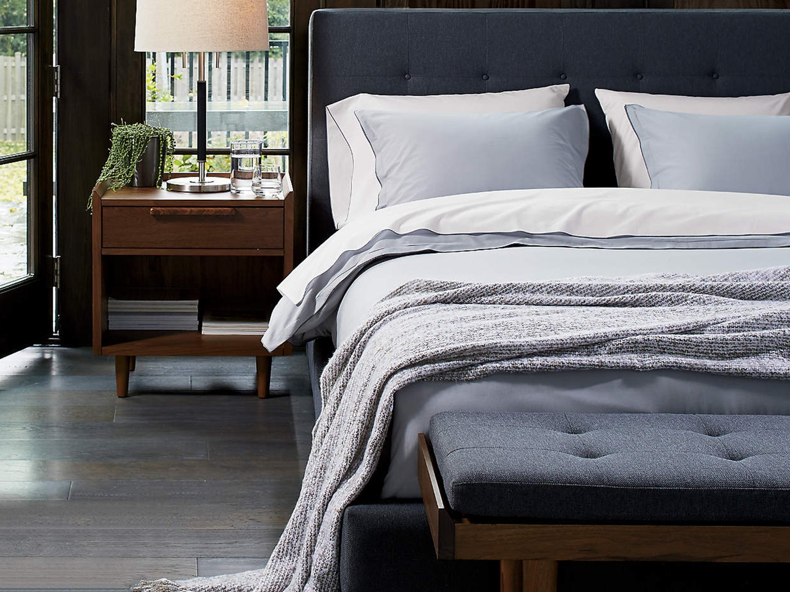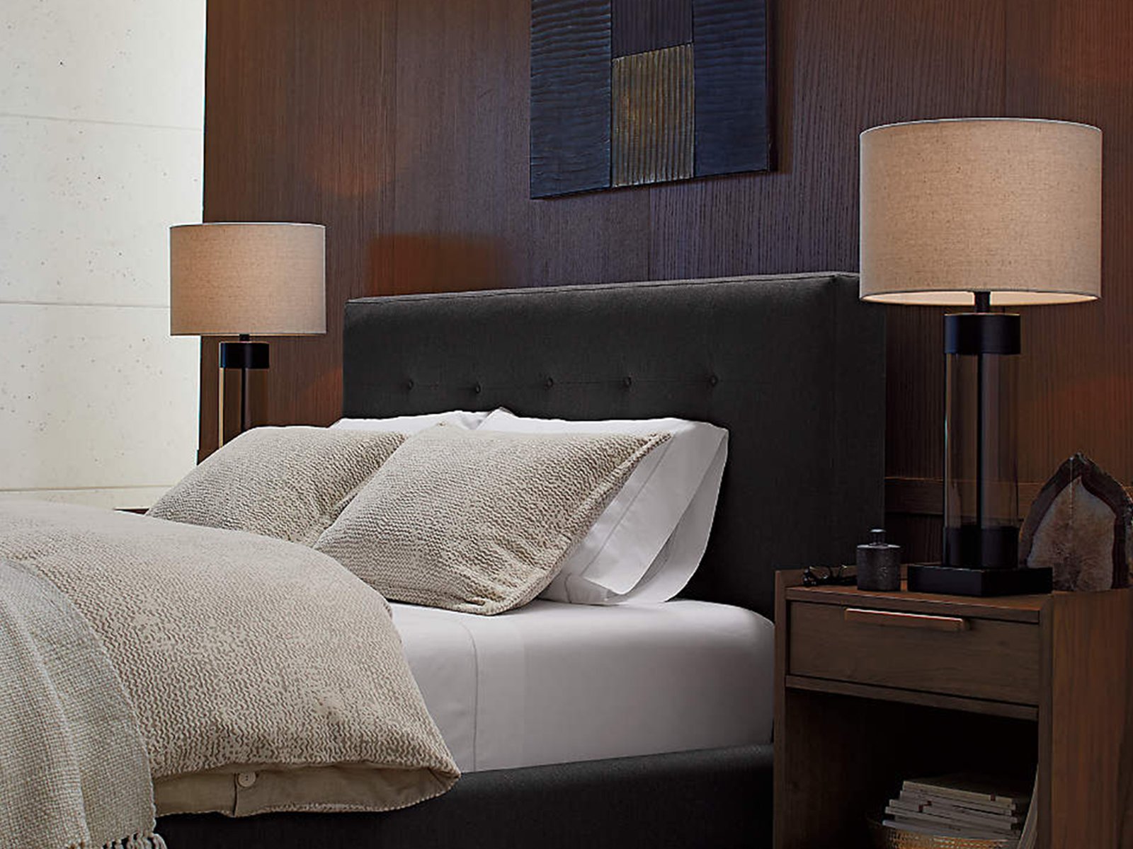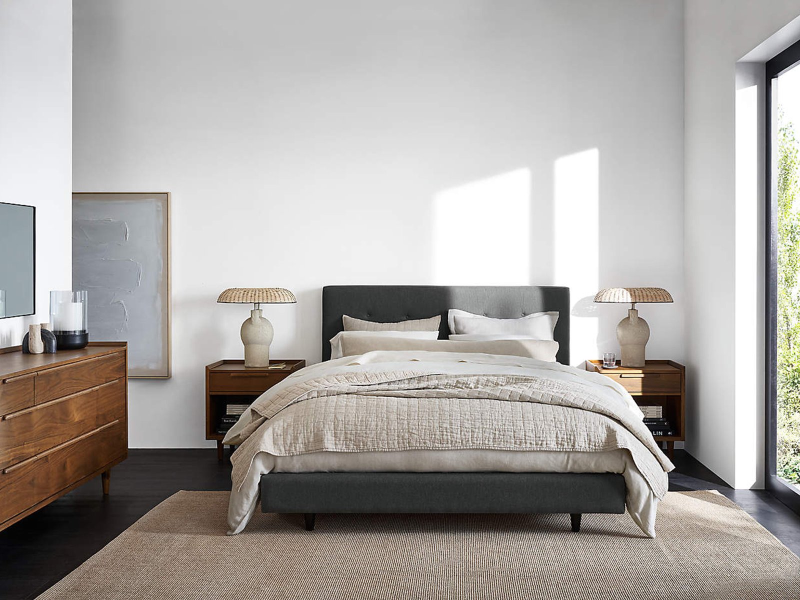 Our 1960s-inspired Tate collection recalls the timelessness of mid-century design with tailored profiles and streamlined shapes. Crafted of teak wood and walnut finish, Tate showcases gallery fronts and linear undercut drawer pulls supported by tapered turned legs. The nightstand's single drawer and an open storage shelf provide roomy bedside storage. Designed by Blake Tovin.