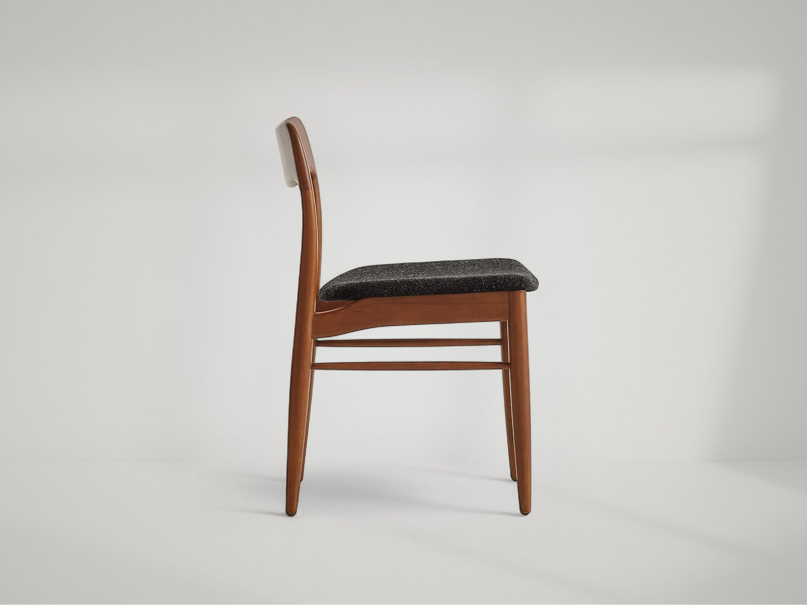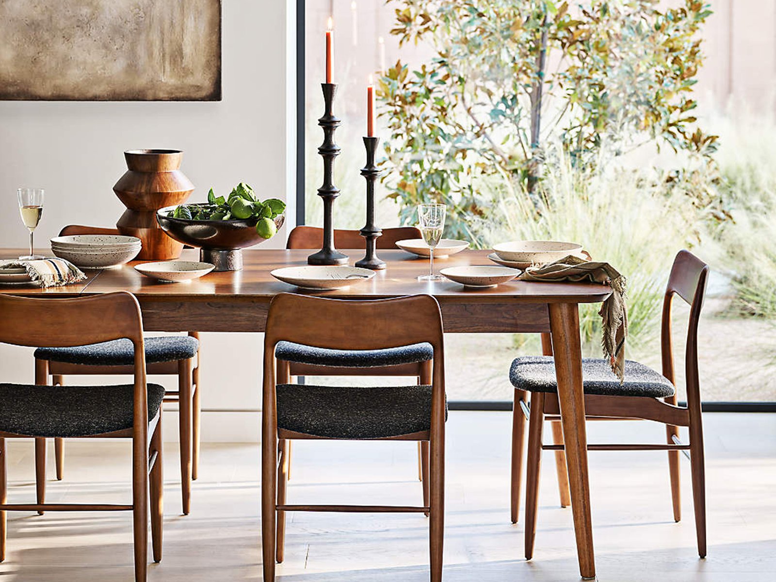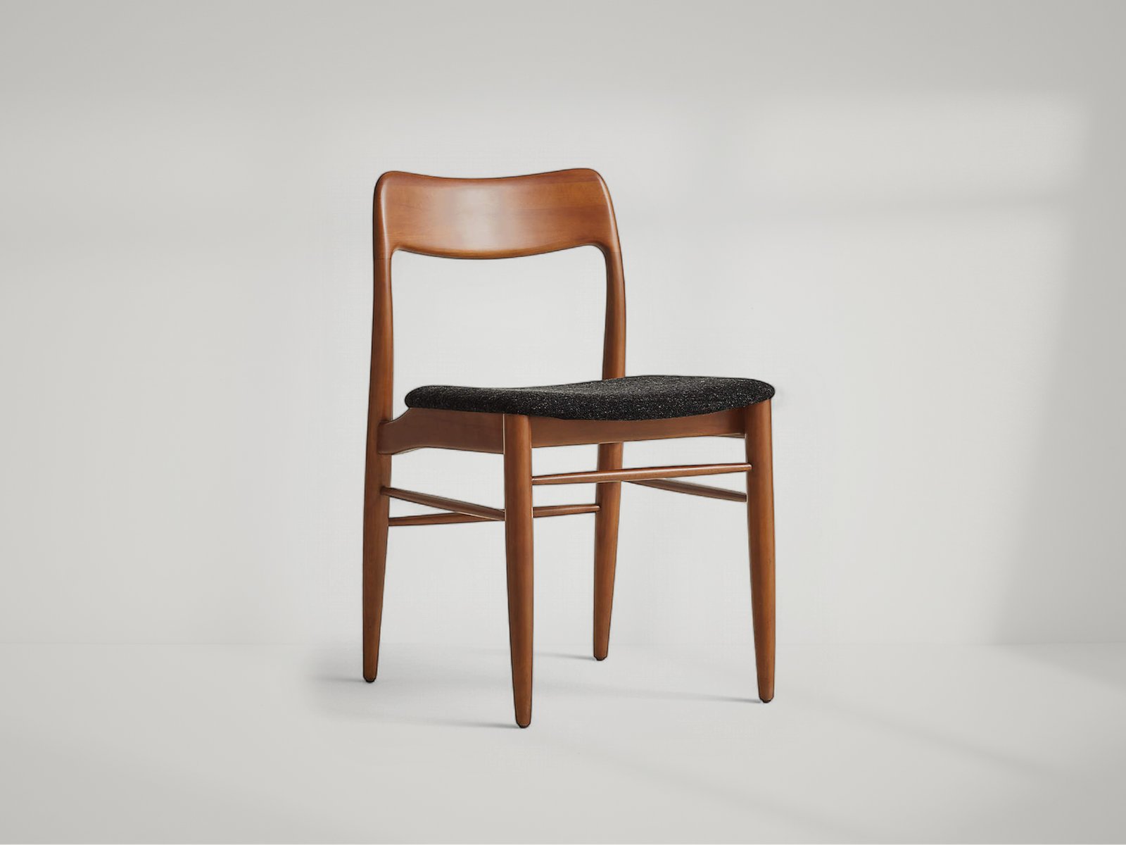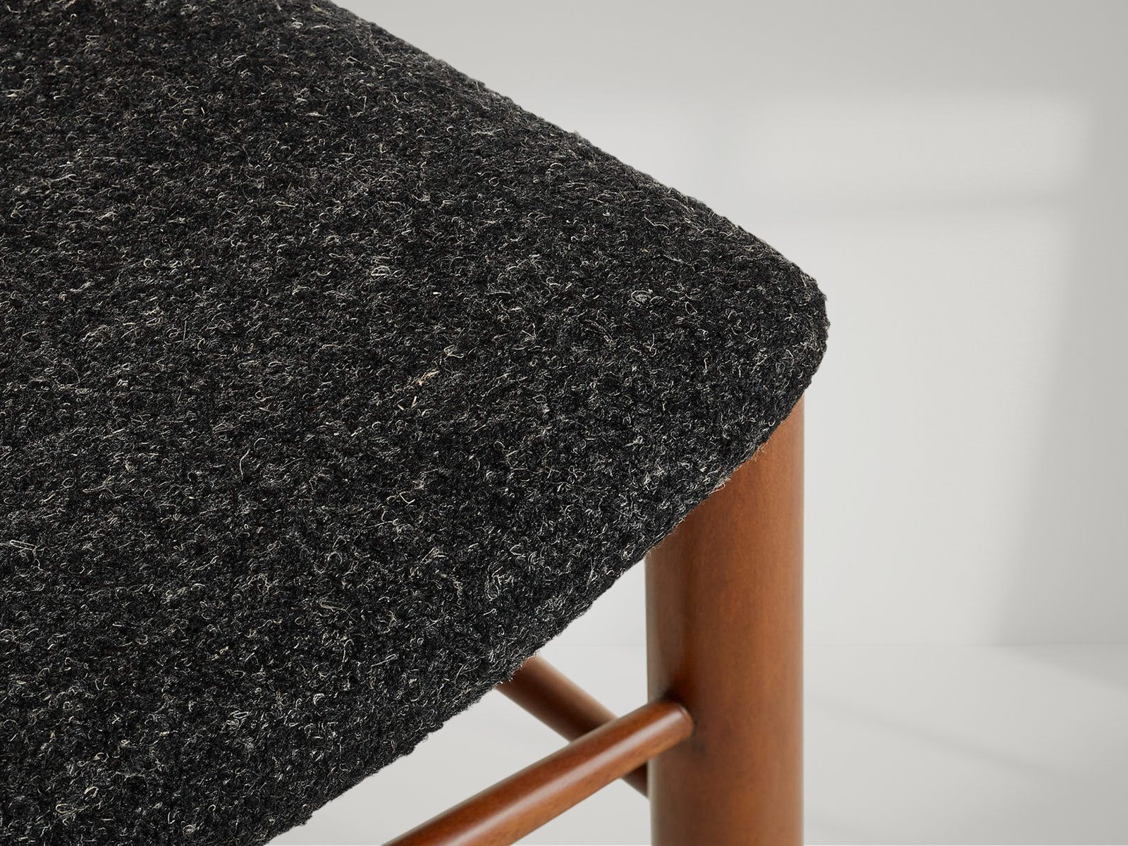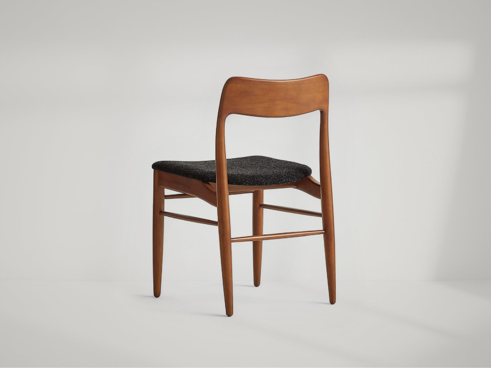 Conceived with the same classic mid-century modern styling, this dining chair pairs perfectly with our Tate dining table collection as well as a variety of other table styles. Made of solid teak finished with the signature warm brown Tate Walnut finish, the chair flows its modern curves from tapered legs to a sculpted back with delicate pillowed stretchers and curved rails beneath the seat. The comfortable seat is covered in a charcoal grey, wool-like fabric that emulates the look of smartly tailored menswear.