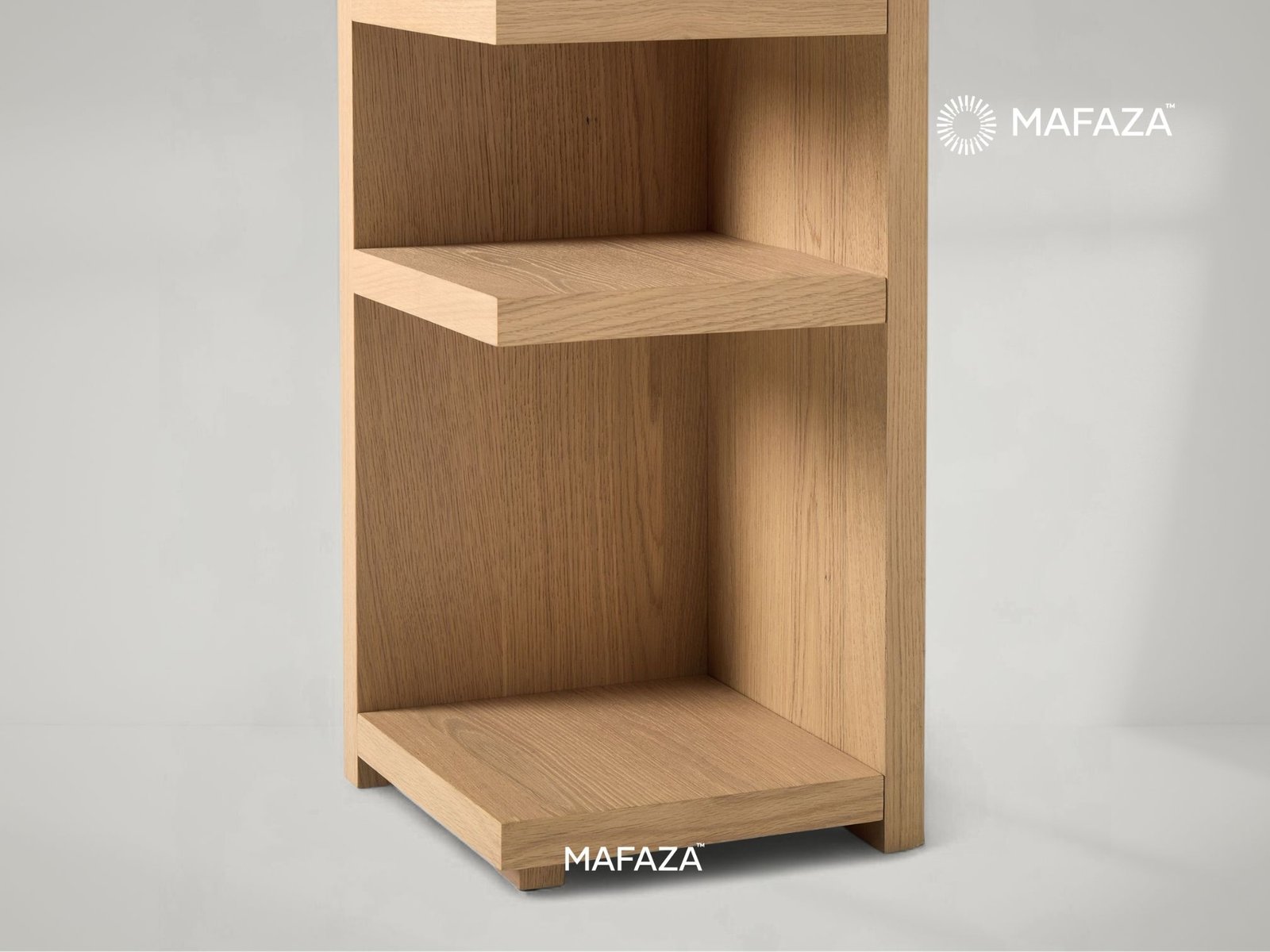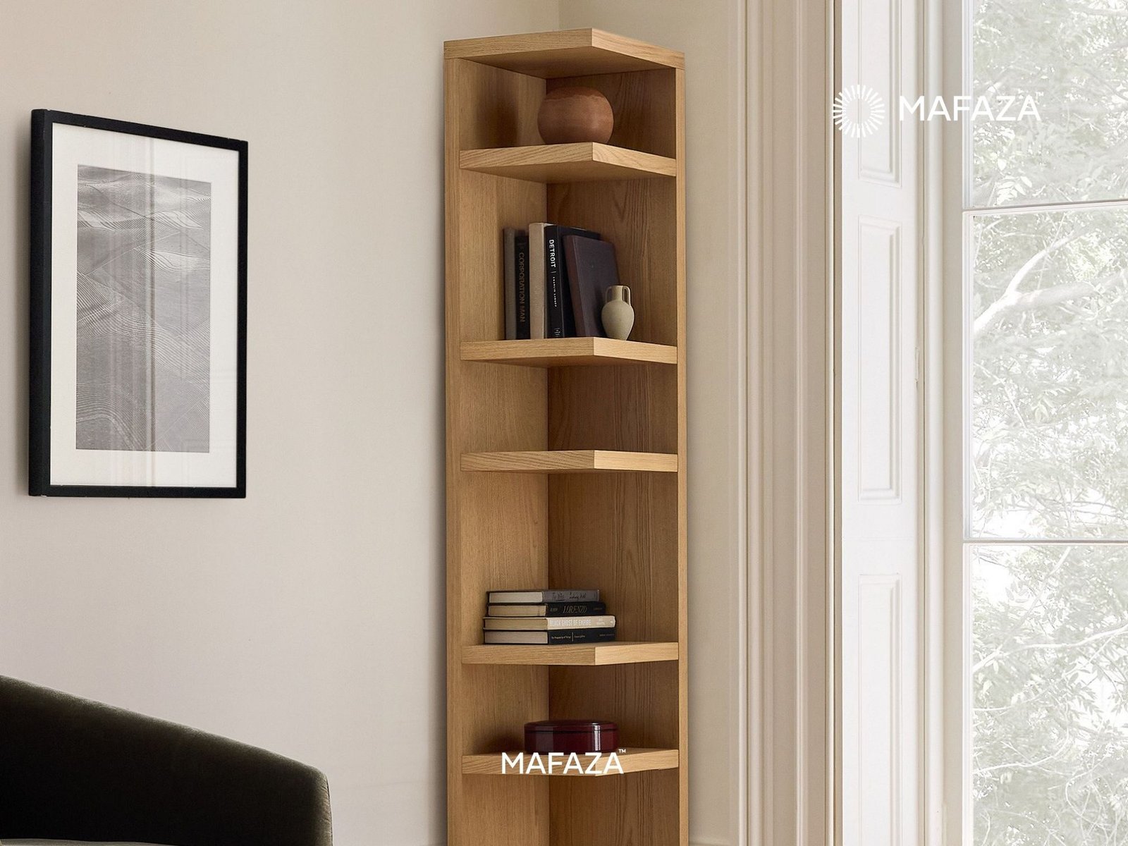The Wallace Corner Shelf Unit transforms every angle into a display of elegance and functionality, redefining the usage of corners. It is made by hand from certified teak wood and has open layers that encourage artistic expression. Wallace is ideal for small rooms because it combines elegant design with practicality, adding a sense of warmth and sophistication to neglected areas.